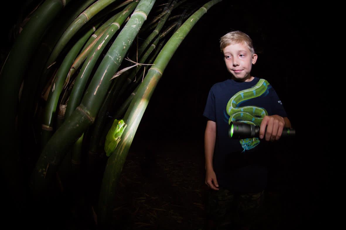 • 밤에 즐기는 산책은 평소에는 보기 힘든 생물들을 만날 수 있는 좋은 기회입니다. 흰입청개구리, 북부 스토니 크릭 개구리, 바이컬러 청개구리, 동부 드워프 청개구리 등 다양한 개구리를 볼 수 있습니다. 귀뚜라미, 털두꺼비하늘소, 여치 등 수많은 야행성 곤충도 서식하고 있습니다. 놀라운 그물 던지기 거미와 거대한 왕거미도 볼 수 있을 것입니다. 계절에 따라 줄무늬 주머니쥐, 얼룩무늬 날여우, 파푸아 올빼미개구리, 작은 박쥐도 볼 수 있습니다.