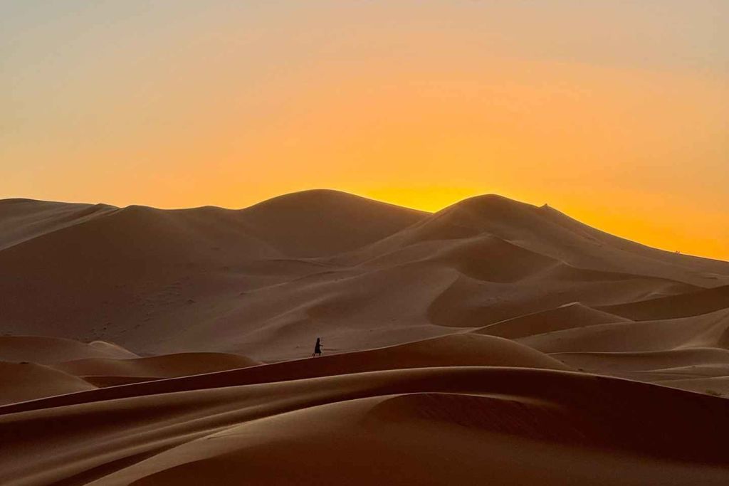 일찍 일어나 에르 체비 사막의 일출을 감상합니다. 이후 4x4 차량으로 주변 사막을 탐험하며 유목민 가족을 만나고, 그나우아 음악을 즐기며 차와 전통 베르베르 호스피탈리티로 휴식을 취합니다. 저녁에는 캠프파이어 주변에서 저녁 식사와 음악을 즐깁니다.
