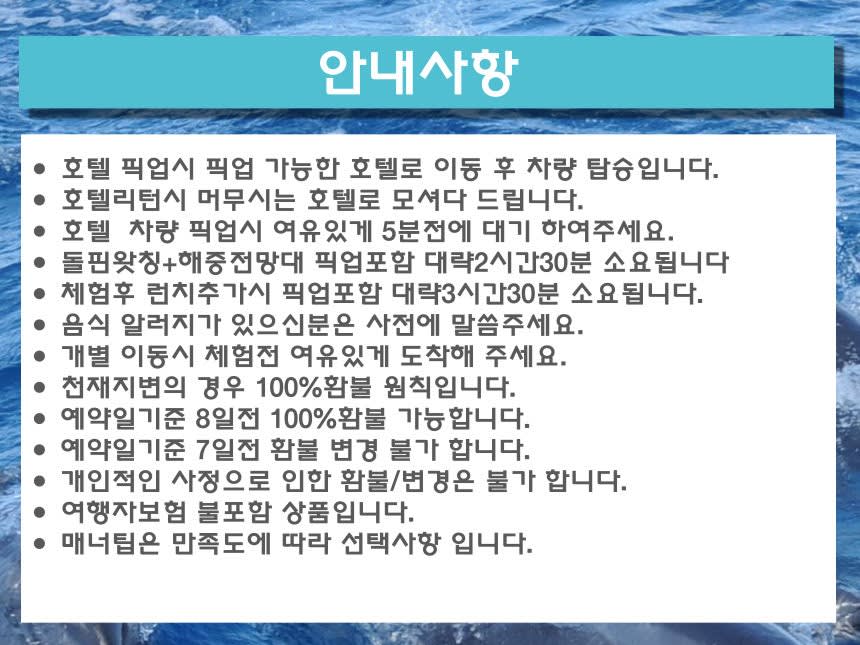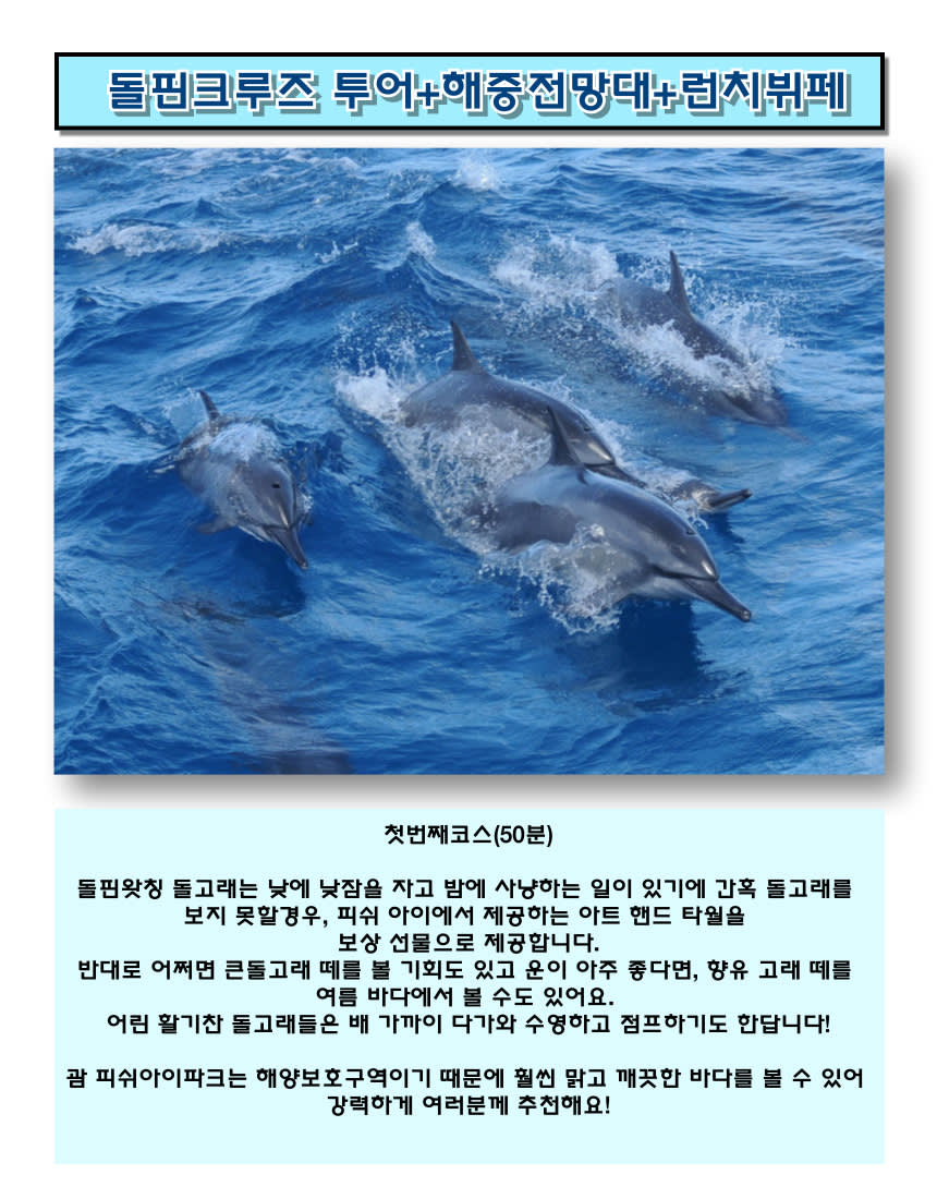 1,돌핀왓칭을 성공못할경우 피쉬아이 사은품증정🚤👍. 2.피쉬아이해중전망대 최대규모의 자연 수족관. 3.🥂차모르식 현지식부페 옵션선택가능 4.개별이동,왕복픽업 선택가능 5.돌핀을 만날수있는 높은확률🌈 6.타임-08:50/09:50/10:50선택가능