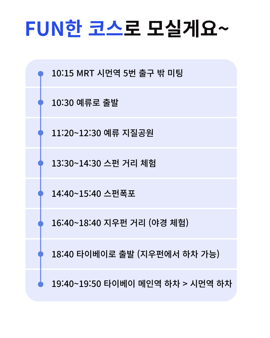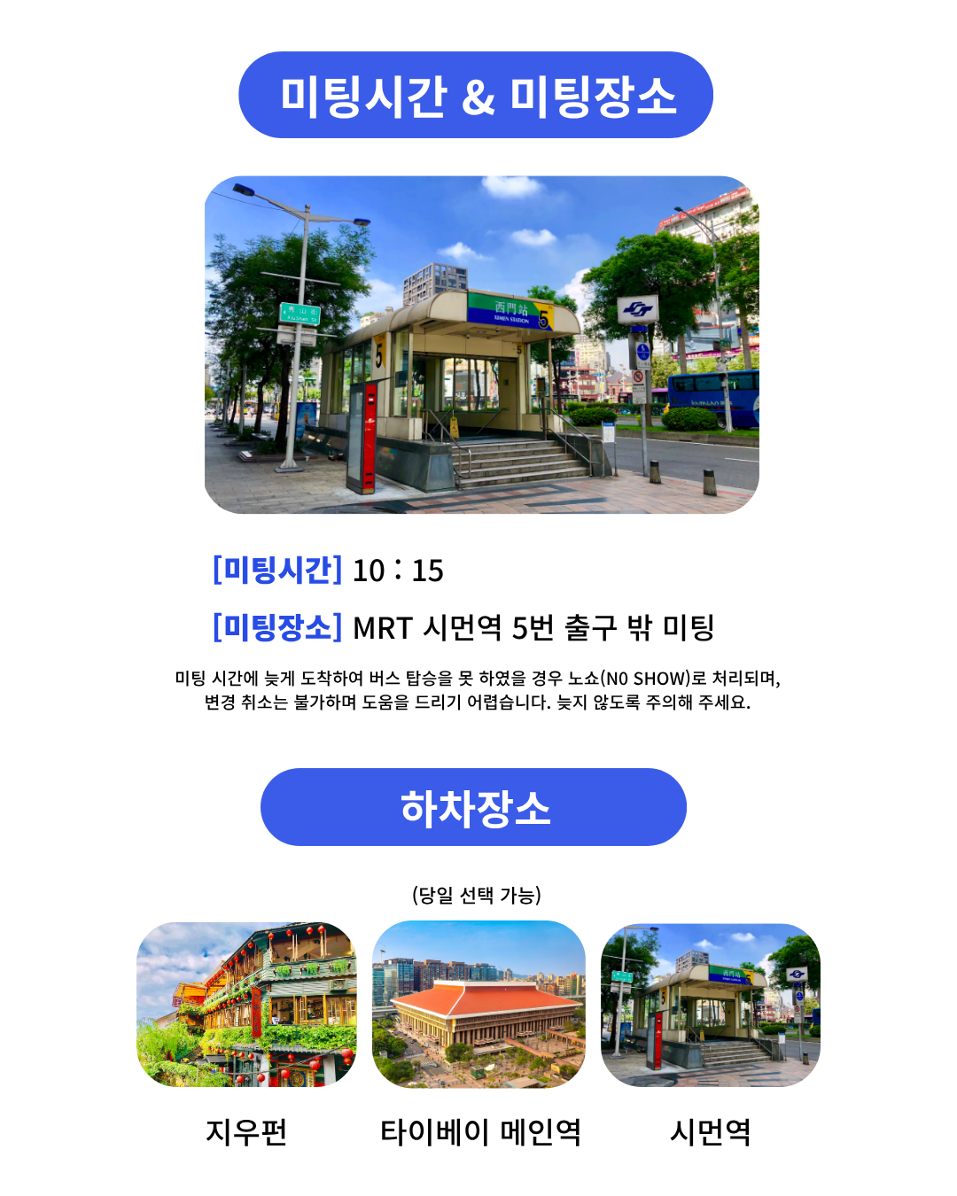 - 미팅 장소 : MRT 시먼역 5번 출구 밖 미팅