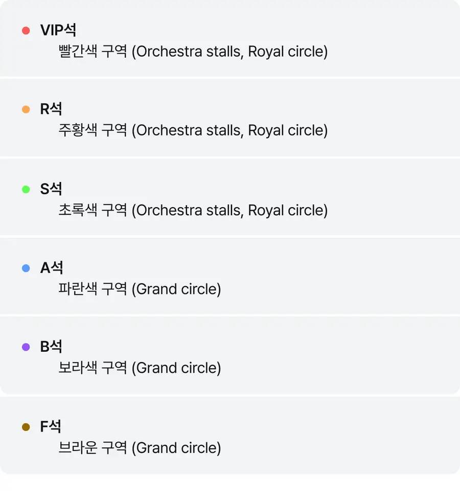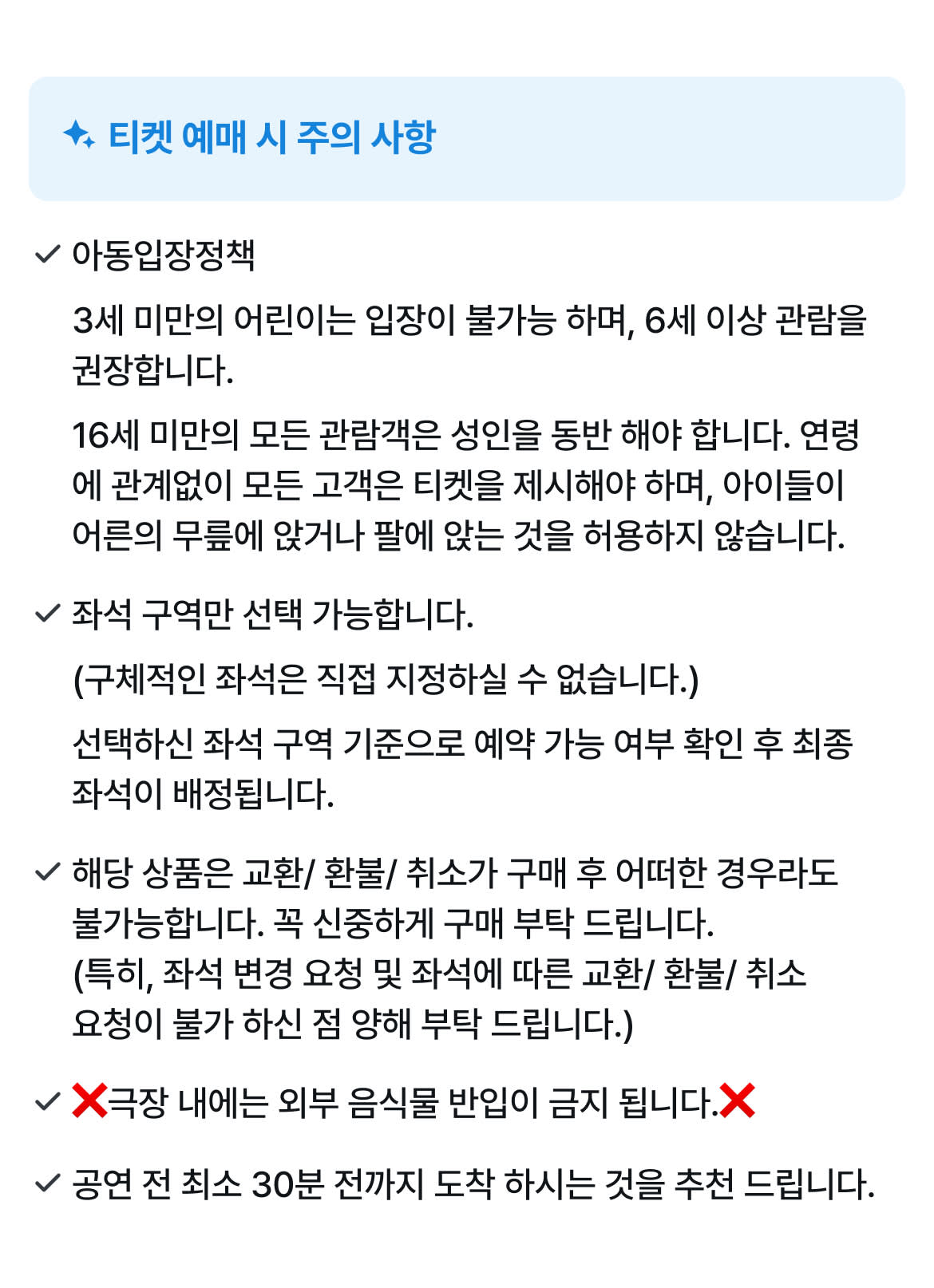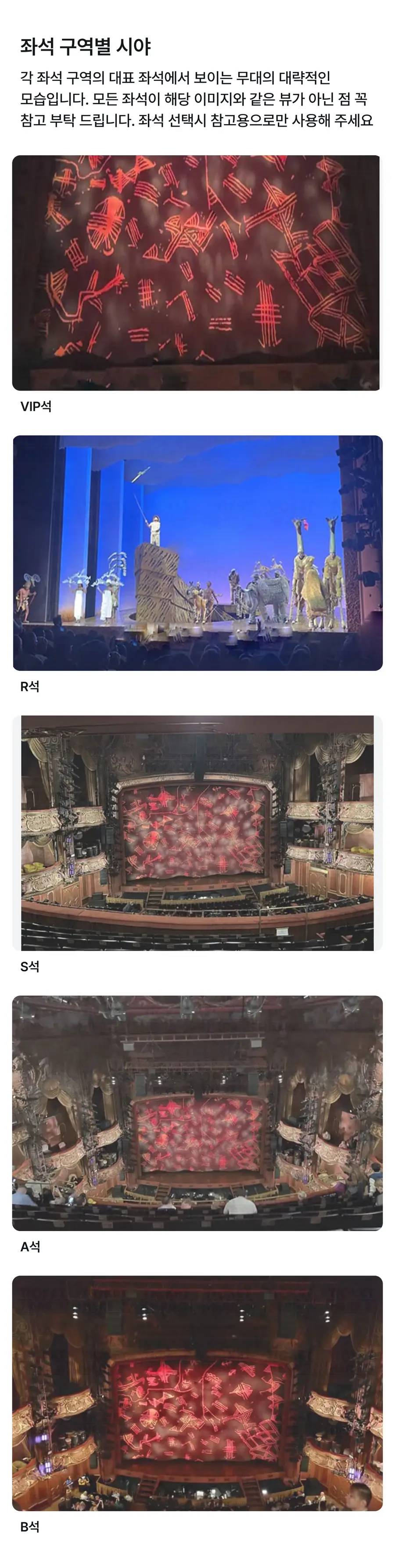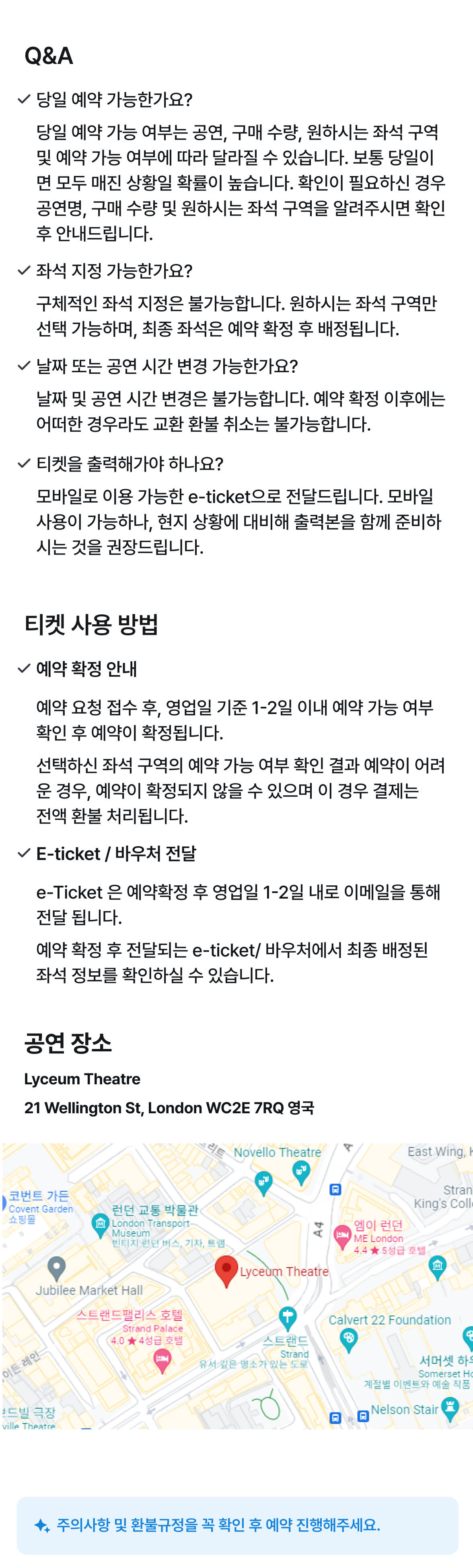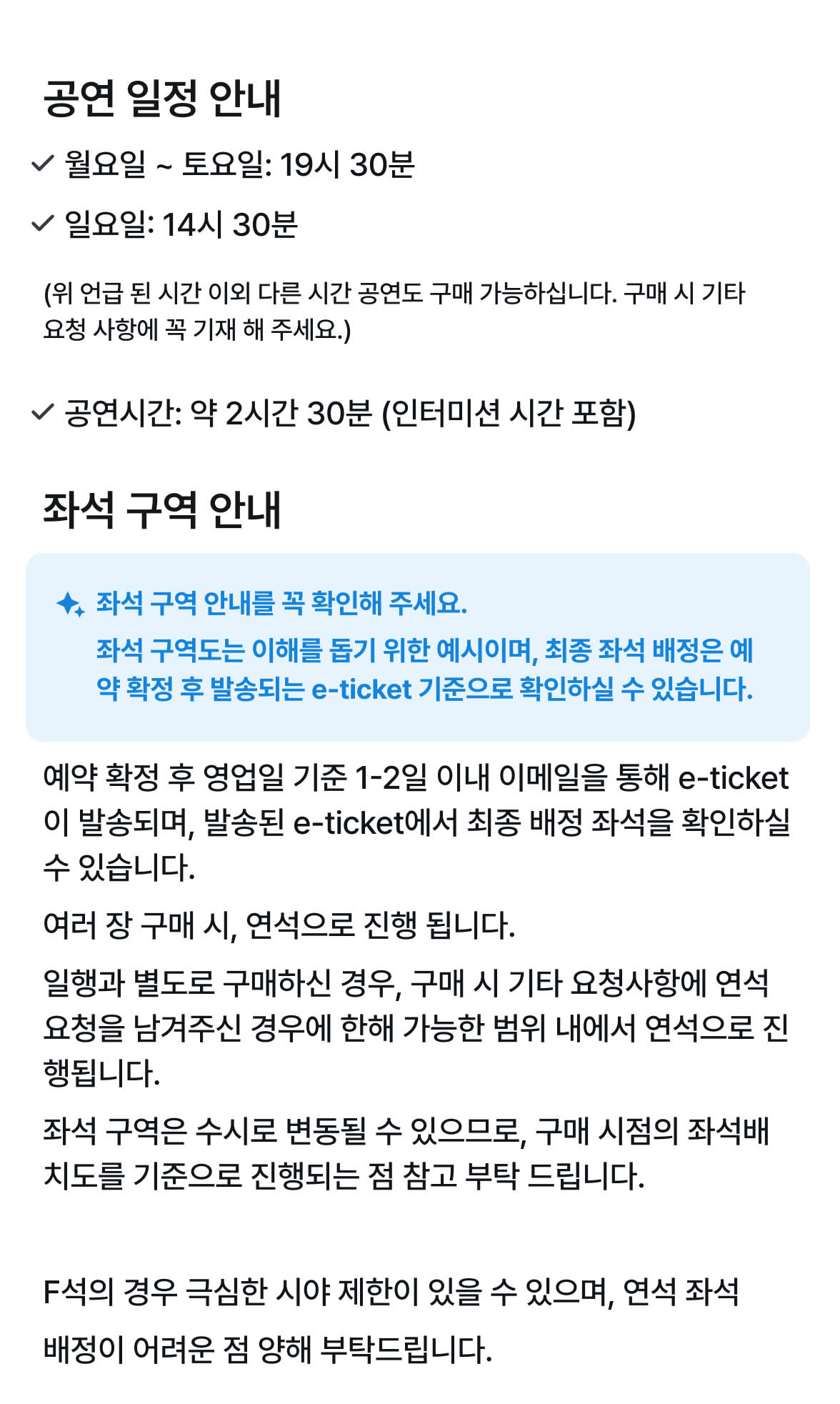 자세한 사용 방법은 바우처 내용을 반드시 확인해 주세요. 예약확정 당일 또는 영업일 1-2일 내로 E-Ticket이 이메일로 전송이 됩니다. 공연 시작 최소 30분 전까지 도착 하시는 것을 추천 드립니다. 개별 여행자 보험 가입을 권장 드립니다. 좌석 구역을 선택 하시어 결제 하시면 해당 구역 내에서 저희가 제공 드릴 수 있는 좌석 중 가장 좋은 좌석으로 배정 되십니다. 여러 장 구매 시 연석으로 배정 됩니다. 좌석 등급은 상품 이미지에서 확인 하실 수 있습니다. 결제 직후에는 어떠한 경우라도 교환/ 환불/ 취소는 불가능 합니다 (*특히, 좌석 변경 요청 및 좌석에 따른 교환/ 환불/ 취소 요청이 불가 하신 점 양해 부탁 드립니다) 📌월요일 ~ 토요일은 19시 30분, 일요일은 14시 30분 공연입니다. 📌수요일 14:30 공연 토요일 14:30 공연을 원하시는 경우, 반드시 기타 요청사항에서 알려 주셔야 합니다. (위 언급 된 시간 이외 다른 시간 공연도 구매 가능하십니다. 구매 시 요청 사항에 꼭 기재 해 주세요.) 공연 전 최소 30분 전까지 도착 하시는 것을 추천 드립니다. 16세 미만의 모든 관람객은 성인을 동반 해야 합니다. 연령에 관계없이 모든 고객은 티켓을 제시해야 하며, 아이들이 어른의 무릎에 앉거나 팔에 앉는 것을 허용하지 않습니다. 동반 청소년/ 아동과는 따로 떨어진 좌석으로 관람이 어려우니, 구매 시 꼭 청소년/아동 동반 여부 확인해 주셔야 합니다. 해당 정보가 구매 시 전달되지 않을 경우 관련 사항에 대한 도움드리기 어려운 점 유의 부탁드립니다.