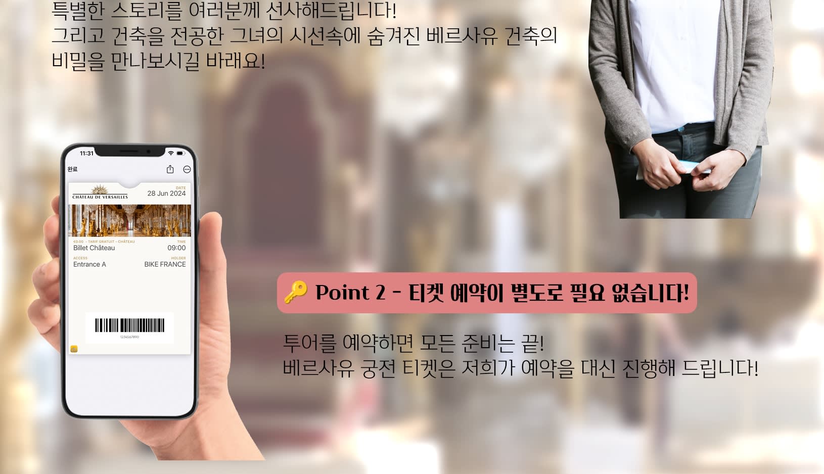 * 🔑 Point 2 - 티켓 예약이 별도로 필요 없습니다! 투어를 예약하면 모든 준비는 끝! 베르사유 궁전 티켓은 저희가 예약을 대신 진행해 드리도록 할께요! 투어 예약 후 메세지 주시면 티켓비 안내드리도록 하겠습니다!
