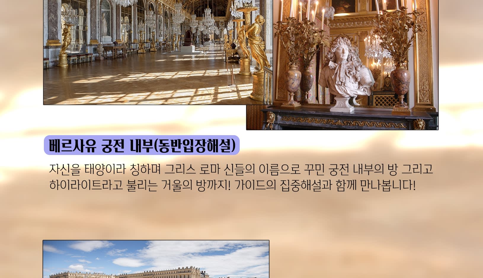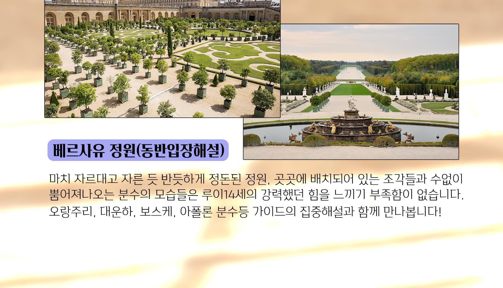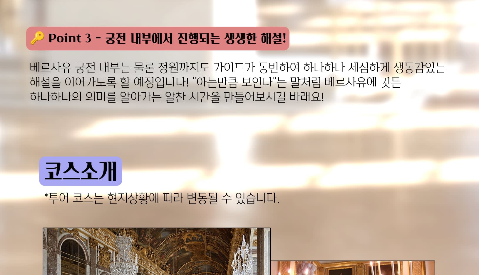 * 🔑 Point 3 - 궁전 내부에서 진행되는 생생한 해설! 베르사유 궁전 내부는 물론 정원까지도 가이드가 동반하여 하나하나 세심하게 생동감있는 해설을 이어가도록 할 예정입니다! "아는만큼 보인다"는 말처럼 베르사유에 깃든 하나하나의 의미를 알아가는 알찬 시간을 만들어보시길 바래요! 오디오 가이드가 아닙니다!