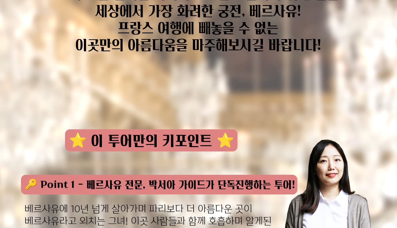 * 🔑 Point1 - 베르사유 전문, 박서아 가이드가 단독진행하는 투어! 베르사유에 10년 넘게 살아가며 파리보다 더 아름다운 곳이 베르사유라고 외치는 그녀! 이곳 사람들과 함께 호흡하며 알게된 특별한 스토리를 여러분께 선사해드립니다! 그리고 건축을 전공한 그녀의 시선속에 숨겨진 베르사유 건축의 비밀을 만나보시길 바래요!