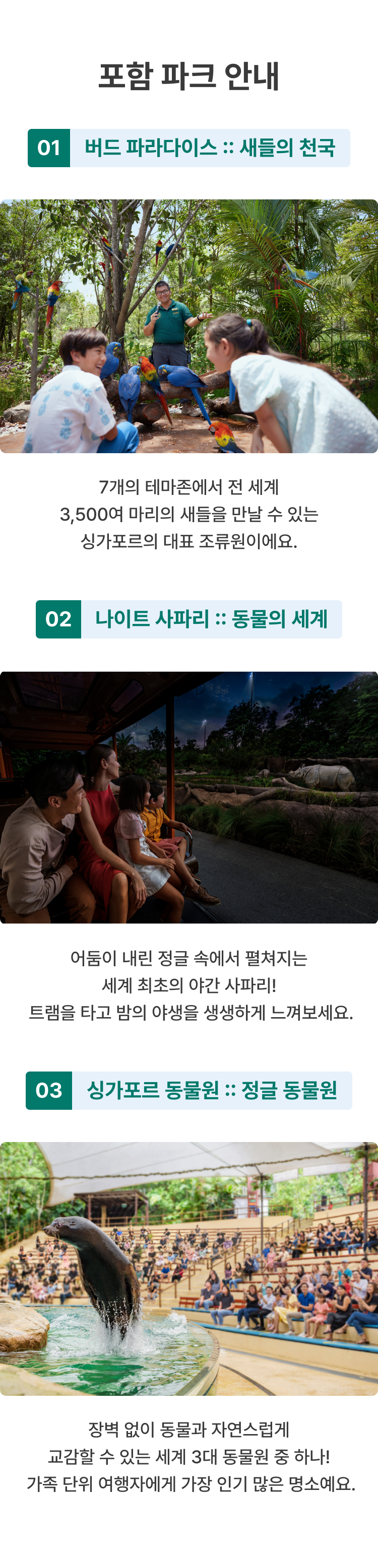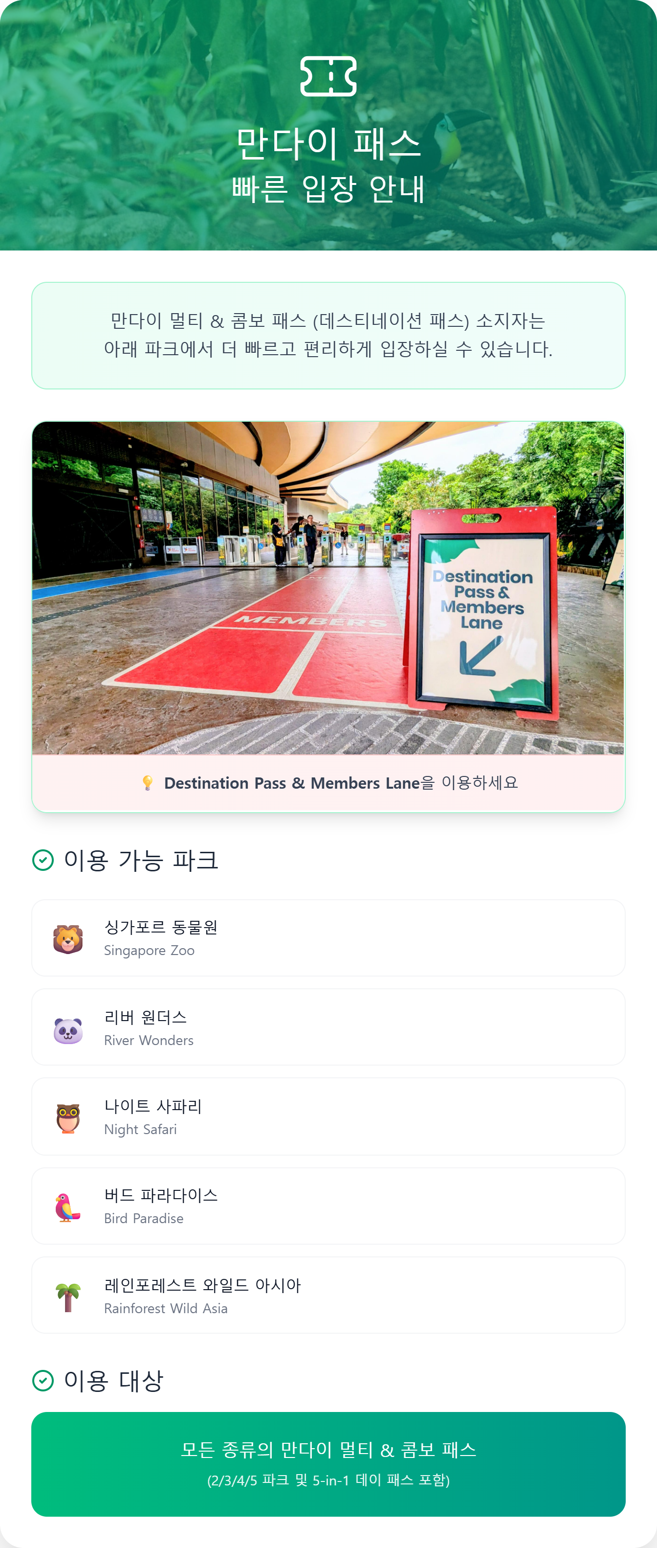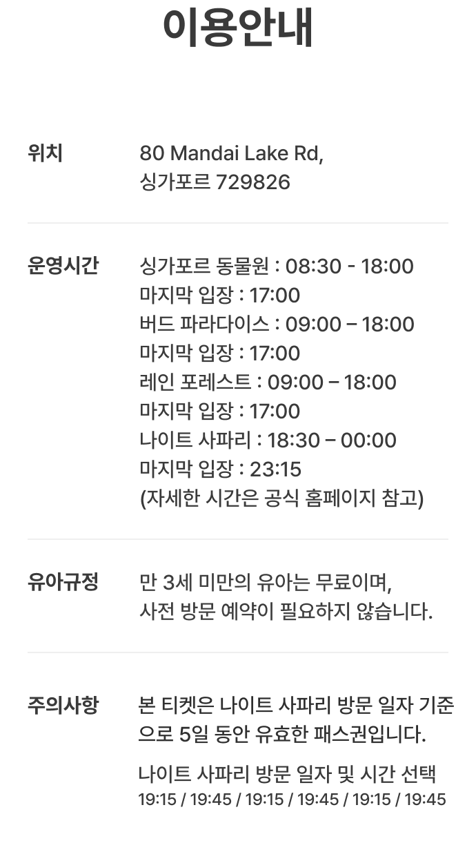 📝 이용 방법 안내 예약 및 티켓 수령 나이트 사파리 방문이 포함된 경우, 예약 시 방문 날짜와 시간을 반드시 선택해 주셔야 합니다. 나이트 사파리는 선택하신 날짜와 시간에만 입장이 가능합니다. E-티켓을 확인해 주세요. 공원 이용 및 유효 기간 나이트 사파리 첫 방문일로부터 5일 이내에 다른 3곳도 자유롭게 1회씩 이용하실 수 있습니다. 현장 이용 절차 현장에서 여권과 E-티켓을 직원에게 제시해 주세요. 운영 시간 안내 현지 상황에 따라 운영 시간 변동의 가능성이 있습니다. 방문하시기 전에 공식 홈페이지를 참고하여 최신 정보를 확인해 주시기 바랍니다.
