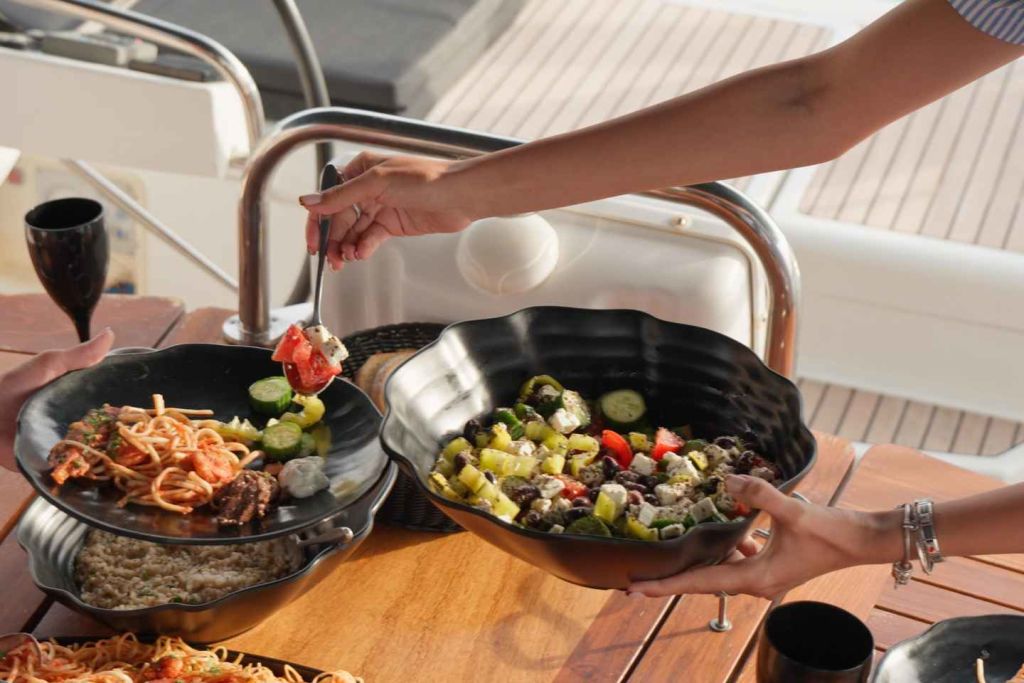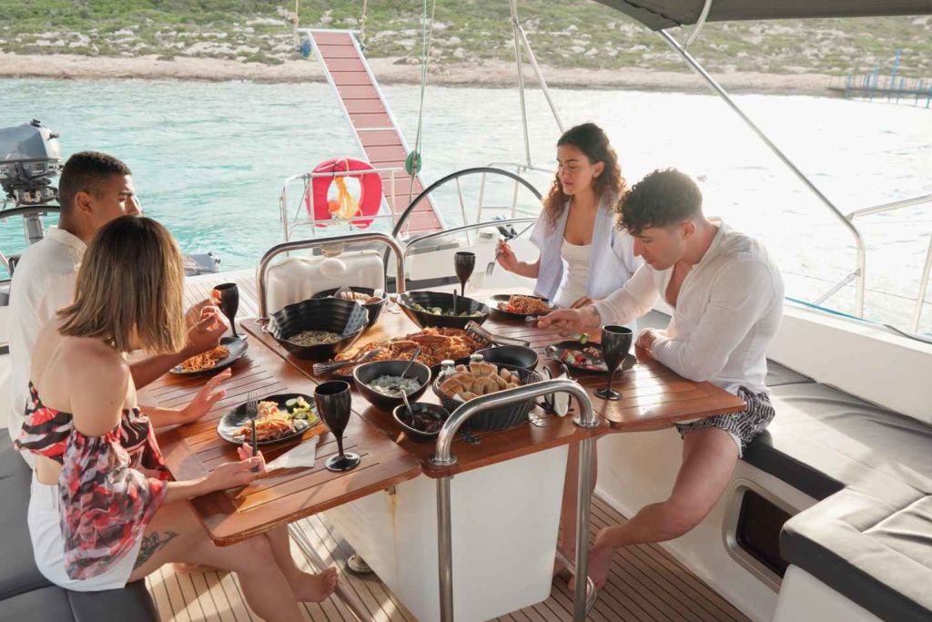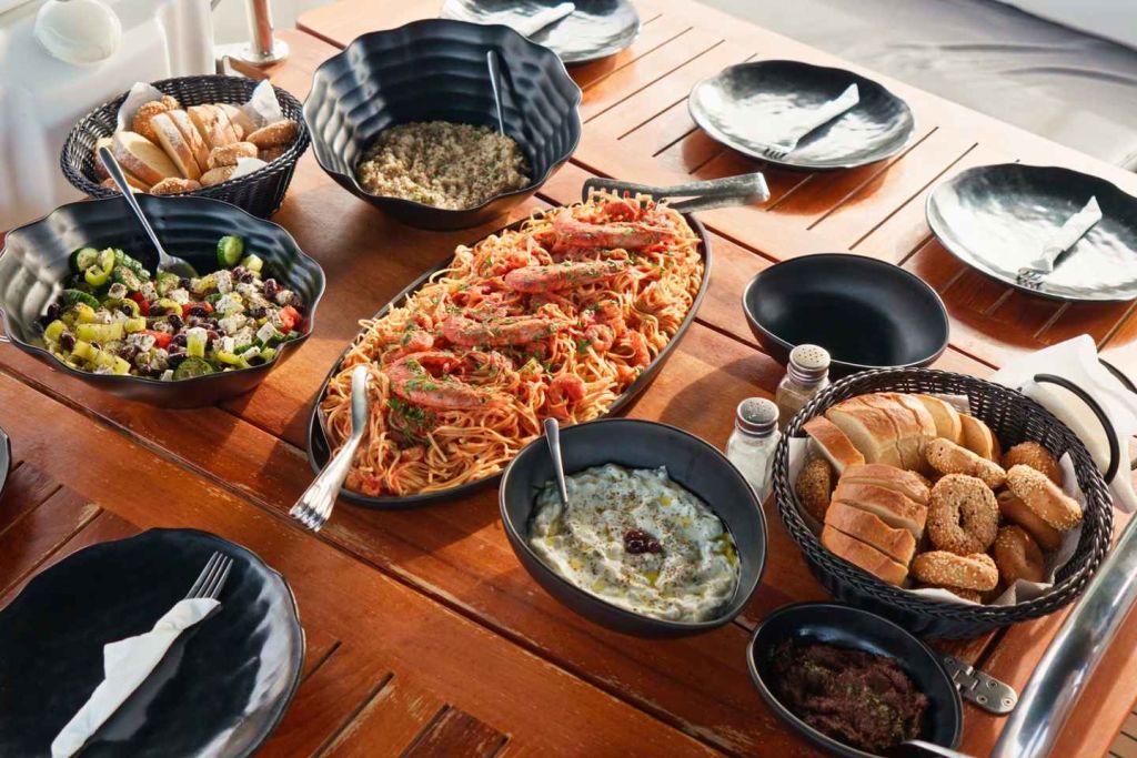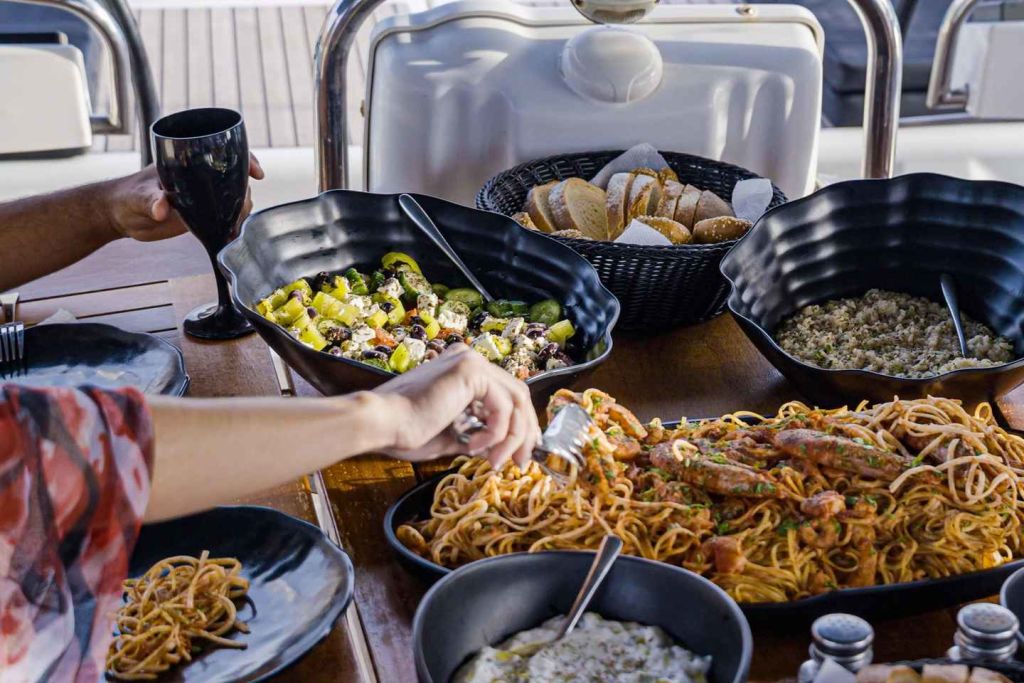 약 1시간 후 그리스식 샐러드와 여러 가지 애피타이저가 포함된 맛있는 지중해식 메뉴가 제공되며 메인 코스는 새우 링귀니입니다(요청 시 채식 및 글루텐 프리 메뉴도 제공합니다). 식사와 함께 최고급 와인, 맥주, 아이스티 또는 청량음료를 곁들일 수도 있습니다.