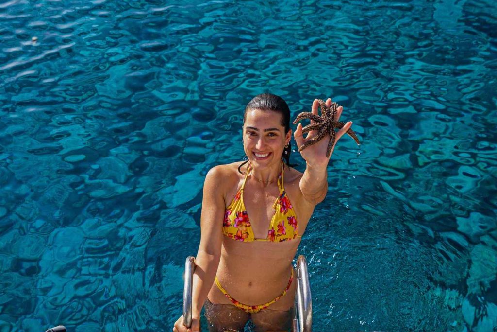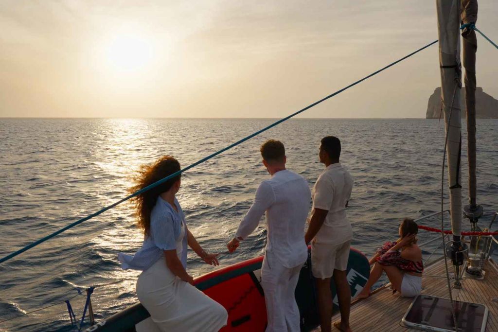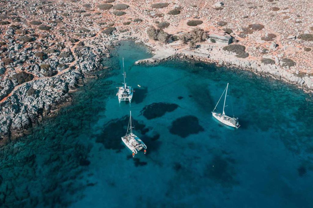약 1시간 후 디아 만에 도착합니다. 이곳에서 투명한 청록색 바다와 스노클링, 낚시, 패들 보딩 등 다양한 수상 액티비티를 즐길 수 있습니다(스탠드업 패들 보드는 안전상의 이유로 바람이 거칠 경우 이용할 수 없습니다). 만에서 정박하는 동안 승무원이 기꺼이 수상 액티비티에 필요한 장비를 대여해 드리고 음료도 제공해 드리니 주저하지 마시고 요청해 주세요.