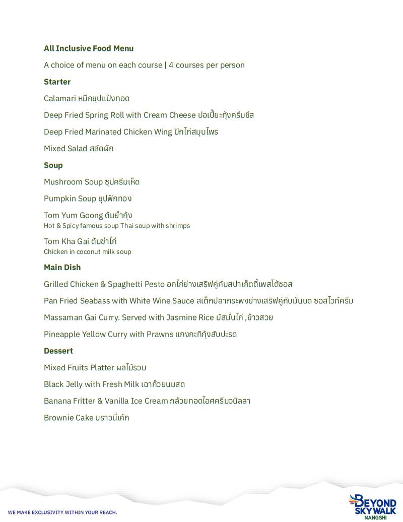 ▶ 주의사항 - ✅ 포함사항 선택하신 옵션, 세금, 봉사료 - ❌ 불포함사항 기타 개인 경비, 팁 - ⚠️ 스카이워크 유의사항 입장 및 준비물 신발 커버는 입구에서 무료 제공되며, 사용 후 반드시 반납해야 합니다. 음식 및 음료 반입은 불가합니다. 반입 금지 품목 드론, 셀카봉, 우산 반입 불가 휠체어 및 유아용 카트 반입 불가 반려동물 입장 불가 (가방에 넣어도 불가) 안전 수칙 바닥이 젖어있을 경우 미끄러울 수 있으니 각별히 주의해 주세요. 뛰거나 앉거나 난간에 기대는 행동은 금지됩니다. 흡연은 불가합니다. 음주자 및 노약자는 안전상의 이유로 입장이 거부될 수 있으며, 이 경우 환불은 불가합니다. 책임 안내 안전상의 부주의, 체험 중 발생한 부상 및 사고에 대해서는 당사에서 책임지지 않으므로 반드시 안전에 유의해 주시기 바랍니다. - 🔸 그 외 안내사항 해당 상품은 이용일 최소 2일 전에 예약해 주셔야 합니다. 당일 현장 사정 또는 비욘드 스카이워크 낭치 측 사정에 따라 이용 시간이 예고 없이 변동될 수 있습니다. 안전 부주의나 체험 중 발생한 부상 및 사고에 대해서는 당사에서 책임지지 않으므로 반드시 유의해 주시기 바랍니다. 직원의 안내 및 지시를 따르지 않을 경우, 즉시 이용이 중단되며 환불은 불가합니다. 귀중품 및 현금 분실 사고, 개인 안전사고에 대해 각별히 유의해 주시기 바랍니다. 픽업 및 샌딩 서비스는 별도로 제공되지 않습니다. 식음료 패키지를 이용하실 경우, 상품페이지 하단 메뉴 이미지를 참고해 주시기 바랍니다.
