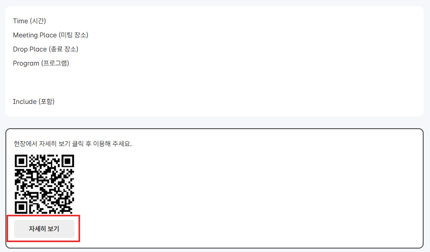 ▶ 이용방법 - 예약 확정서 확인 예약 확정서에 있는 QR코드 하단에 [자세히보기]를 클릭해 주세요. [자세히보기] 링크를 누르면 실제 입장에 사용할 수 있는 QR 코드를 확인 할 수 있습니다. E-Ticket을 다운로드하신 후, 매표소에서 실물 티켓으로 교환할 필요 없이 티켓팅 카운터에 제시하시면 바로 입장하실 수 있습니다. 현장에서 QR코드 인식에 어려움이 있을 경우, 티켓팅 카운터에 예약 확정서를 제시 후 입장권으로 교환해 주세요. ▶ 체크인 방법(QR코드 티켓으로 현장에서 바로 입장) - 체크인 방법 예약 확인서에 표시된 QR 코드 또는 링크를 클릭하여 스카이플라이어 입장권을 다운로드하고 입장 시, 티켓팅 카운터에 제시하면 됩니다. 안전 교육 후, 직원의 안내에 따라 입장하시기 바랍니다.