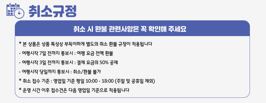 ✅ 예약안내 1. 결제 및 예약 완료 2. 스타인월드에서 개별 메시지 발송 3. 메시지에서 안내 받은 신청서를 통해 상세 투어 내용 전달 4. 상세 투어 일정 확정 및 안내 5. 스타인월드 직영으로 바우처가 필요 없으며 확정한 일정에 맞춰서 행사 진행 (투어 전날 현지 투어 안내문 발송함) 본 상품은 예약이 진행되는 상품이며 최종 확정 안내는 채널톡 연결 후 개별 안내드립니다 연결이 안될시 예약상품은 취소될 수 있습니다 채널톡 : 스타인월드_세부 [한국 스타인월드 근무시간] * 취소 접수 기준 : 영업일 기준 평일 오전 10:00 ~18:00(주말&공휴일 제외) * 운영시간 이후 접수 건은 다음 영업일 기준으로 적용됩니다. - 개별 여행자 보험에 가입을 권장드립니다. - 본 상품은 고객 결제 후 해피콜/해피톡 때 여행 출발에 대한 최종 확정 여부를 결정하며,출발 확정 이후 취소 시, 귀책사유에 따라 약관에 따릅니다. 구매 전, 약관 내용을 반드시 숙지하셔서 신중한 구매 부탁드립니다. - 최소 출발인원 미 충족 시 여행표준약관 제9조에 따라 여행사는 여행출발 2일 전까지 여행계약을 일방적으로 해제하고 소비자에게 통보할 수 있습니다. 여행 참가자 수의 미달로 여행개시 2일전까지 여행계약 해지 통보 시 여행신청금은 전액 환급 또는 날짜변경으로 안내드립니다.