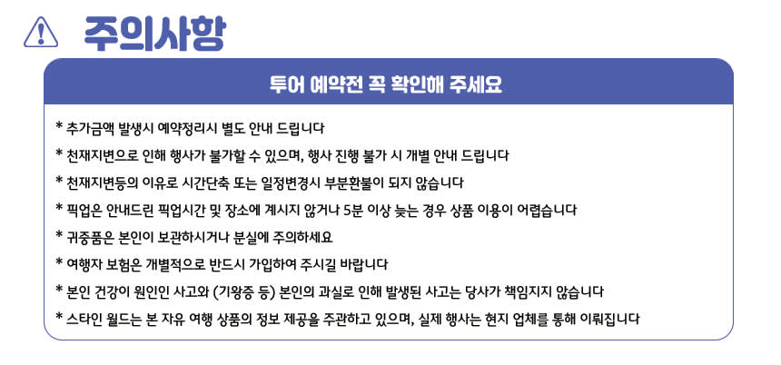 - 개별의상, 소품 등 준비해주셔도 좋습니다 * 추가금액 발생시 예약정리시 별도 안내 드립니다 * 천재지변으로 인해 행사가 불가할 수 있으며, 행사 진행 불가 시 개별 안내 드립니다 * 천재지변등의 이유로 시간단축 또는 일정변경시 부분환불이 되지 않습니다 * 픽업은 안내드린 픽업시간 및 장소에 계시지 않거나 5분 이상 늦는 경우 상품 이용이 어렵습니다 * 귀중품은 본인이 보관하시거나 분실에 주의하세요 * 여행자 보험은 개별적으로 반드시 가입하여 주시길 바랍니다 * 본인 건강이 원인인 사고와 (기왕증 등) 본인의 과실로 인해 발생된 사고는 당사가 책임지지 않습니다 * 스타인 월드는 본 자유 여행 상품의 정보 제공을 주관하고 있으며, 실제 행사는 현지 업체를 통해 이뤄집니다