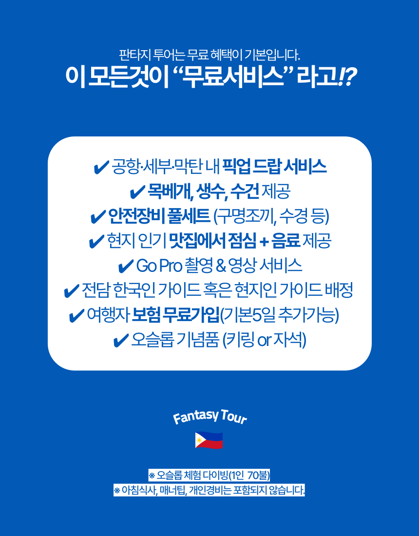 안녕하세요, 소중한 여행의 시작을 함께하는 판타지투어입니다. 아래는 투어 전 꼭 확인해주셔야 할 안내사항입니다. 즐겁고 안전한 여행이 되실 수 있도록 꼼꼼히 챙겨드릴게요 :) 📌 예약 후 안내 예약 완료 후, 대표 카카오톡으로 상세 안내 메시지를 드립니다. 픽업 시간 및 세부 일정은 투어 하루 전, 오후 6시 이전에 다시 한 번 안내드립니다. 📌 여행자 보험 안내 여행자 보험 가입을 위해 아래 정보를 꼭 제공해 주세요. (이름 - 한글/영문, 주민등록번호) 보험은 한국 출발일 기준 5일간 가입됩니다. 💰 이용요금 안내 성인/아동 요금 동일만 7세 이상 참여 가능합니다 🚗 픽업 안내 픽업 시간은 투어 전날 오후 6시 이전에 개별 안내드립니다. 숙소 또는 공항에서 픽업되며, 각 호텔/리조트 로비 또는 공항 지정 장소에서 편리하게 모십니다. 👕 투어 복장 안내 수영복 또는 래쉬가드 등 물에 젖어도 편한 복장을 미리 착용해 주세요. 차량 이동 중 추울 수 있으니 여벌의 긴팔 옷을 챙기시면 좋습니다. 📌 기본 포함사항 안내 본 투어는 필리핀 관광청 등록 차량, 기사, 가이드로 운영됩니다. 본 투어는 차량, 현지 가이드, 여행자 보험 5일이 포함된 상품입니다. 차량당 현지인 가이드가 함께하며, 만 7세 이상 참여 가능합니다. 캐리어나 짐은 차량에 보관 가능하지만, 고지되지 않은 귀중품 분실 시 도움드리기 어려운 점 양해 부탁드립니다. 캐녀닝 코스는 바디안 풀코스로 진행됩니다. 투어 종료 후 샤워 및 환복 가능합니다. 오슬롭 및 캐녀닝 후 샤워 가능하오니 개인 세면도구를 챙겨주세요. 교통 상황에 따라 복귀 시간은 유동적일 수 있습니다. 천재지변이나 기상 악화 시 투어가 취소될 수 있습니다. 매달 세째 주 수요일은 투말록 폭포 휴무입니다. 오슬롭 패스트트랙 입장 예약이 포함되어 있으나, 현지 사정에 따라 일반 입장으로 변경될 수 있습니다. (이 경우 차액 환불) ⚠️ 투어 유의사항 임산부 및 건강상 특이사항이 있으신 분은 사전 고지를 부탁드립니다. (미고지로 인한 사고는 도움드리기 어렵습니다) 안전장비는 투어 종료 시까지 착용 필수입니다. 투어 중 음주는 불가능하며, 식사 시간 이후 음주는 가능합니다. 아쿠아슈즈는 대여 가능하지만 발에 꼭 맞지 않을 수 있으니, 두꺼운 밑창의 개인 아쿠아슈즈를 추천드립니다. 리조트 또는 호텔 조식은 테이크아웃 가능한 경우가 있으니, 프런트에 문의해 주세요. 투말록 폭포와 캐녀닝 투어 시 오토바이 탑승 간 머플러에 데이실 수 있으니 주의하세요. ★만 7세 이상 참여 가능합니다★ 🚗 픽업 차량 안내 2인 : 이노바 3~6인 : 그란디아 7~8인 : 그란디아 투어러 캐리어는 차량에 보관 가능합니다. 공항 픽업도 가능하오니, 숙소란에 도착 항공편명을 꼭 적어주세요. 💡 참고해주세요 투말록 폭포는 매월 세째 주 수요일 휴장입니다. 고지되지 않은 분실물은 확인이 어려우니, 소지품 보관에 유의 부탁드립니다. 기상 악화 등 불가피한 사유로 투어 진행이 어려울 경우, 날짜 변경 또는 다른 투어로 대체 도와드립니다. 패키지 여행 중이신 경우, 패키지 가이드님과 일정 조율 후 신청해 주세요. 2인 이상부터 자동 예약 확정됩니다. 픽업 시간 기준 30분 이상 연락이 없을 경우 노쇼 처리됩니다. 소중한 여행을 더욱 따뜻하고 특별하게 만들어드릴 수 있도록 최선을 다하겠습니다. 감사합니다 💛 ★포함사항★ * 현지인 가이드 * 픽업/드랍 및 차량 * 차량 주유비 및 주차료 * 여행자 보험 5일