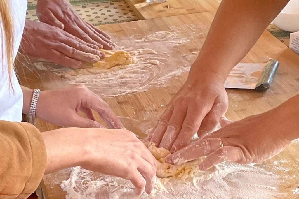 첫 번째 단계로 다양한 종류의 파스타 의 차이점을 설명한 다음 가족의 레시피에 따라 에그 파스타를 만들기 시작합니다. 그런 다음 반죽의 재료에 대해 설명합니다.
