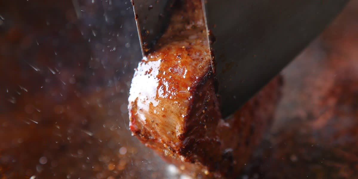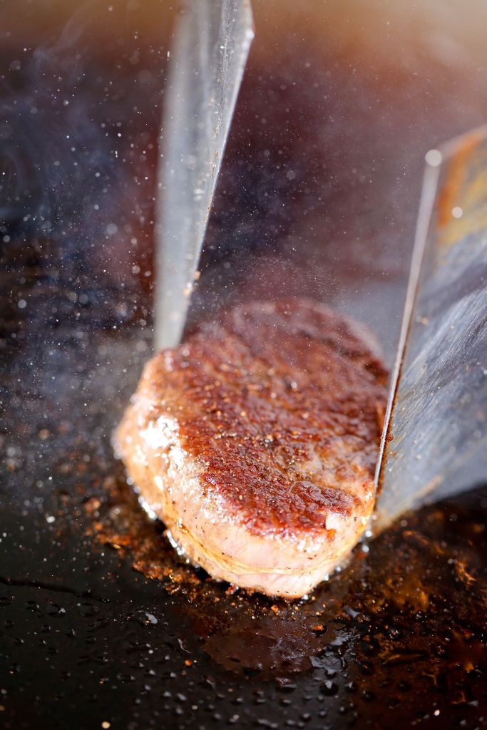 고기의 상태와 야채의 숙성도에 따라, 뜨겁게 달궈진 철판의 온도를 다루며