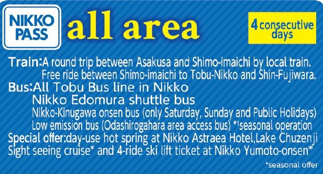 니코 패스를 사용하여 도부 버스를 자유롭게 탑승하고 하차하며 즐기세요.여행券을 미리 도부 관광 안내소 아사쿠사에서 교환해야 합니다. 일본의 세계문화유산, 아름다운 자연 경관, 그리고 닛코/키누카와 온천 지역의 온천을 경험하고자 하는 분들에게 추천합니다. 이 패스는 외국인 방문객들에게 특히 편리하며, 버스와 기차를 무제한으로 이용할 수 있습니다. 유효 기간: 4일