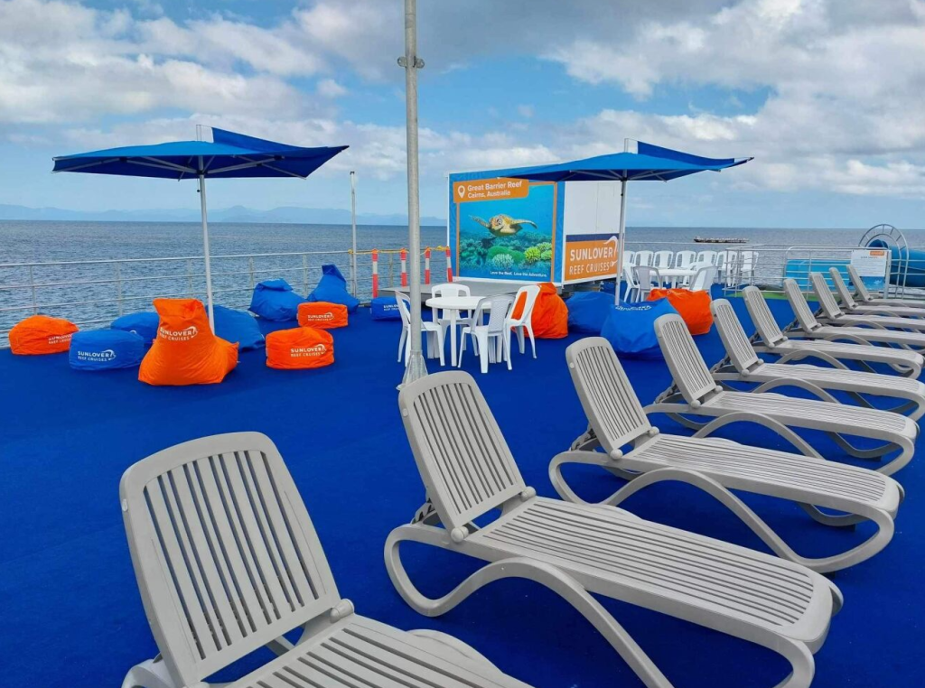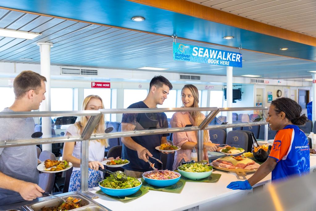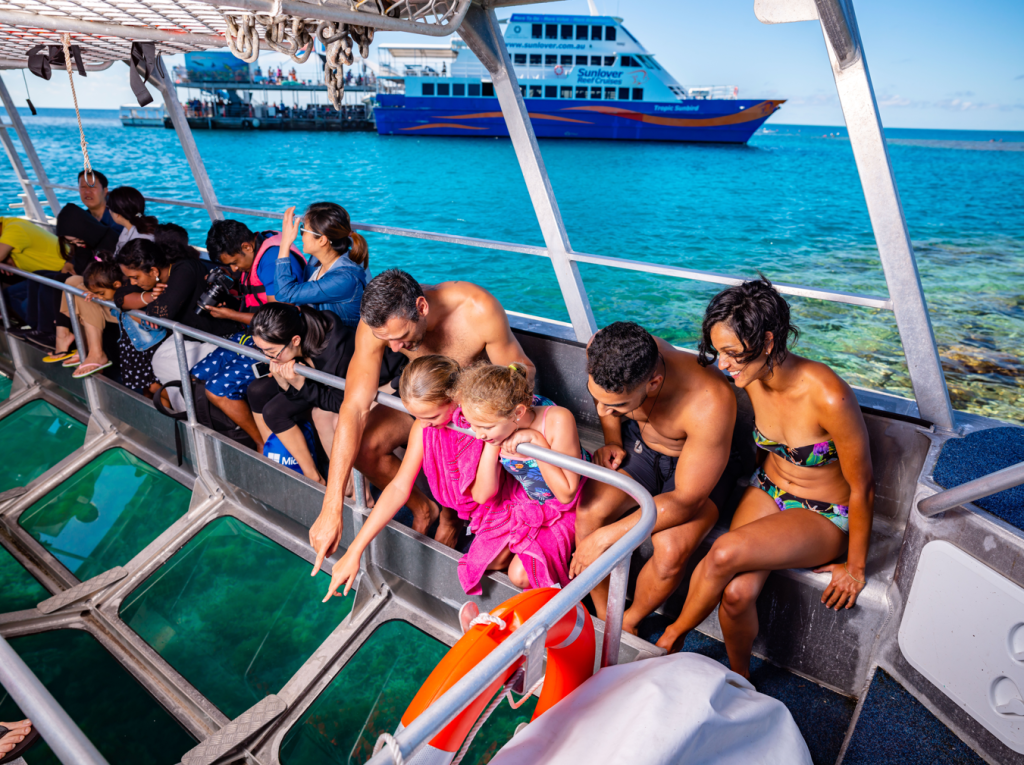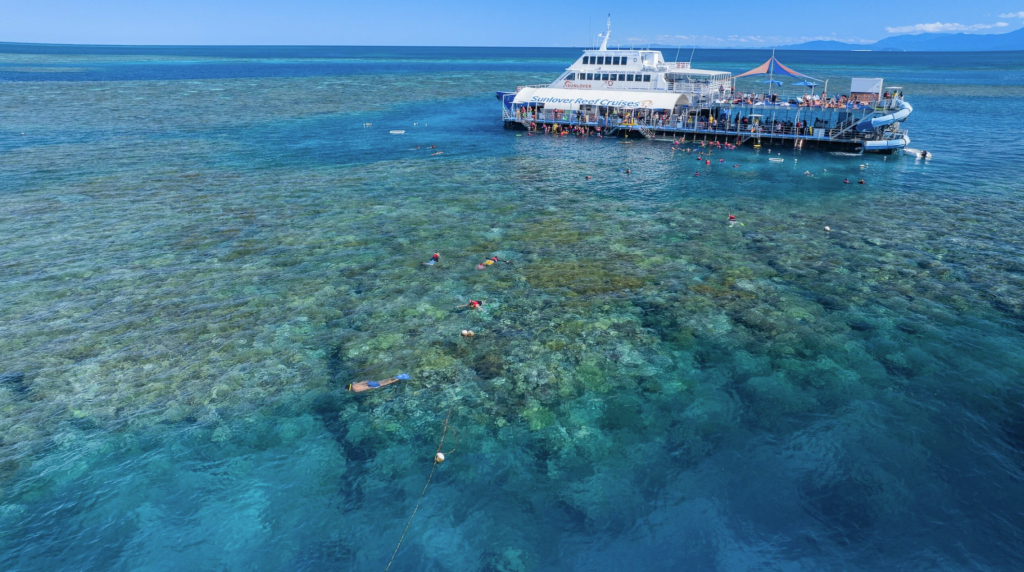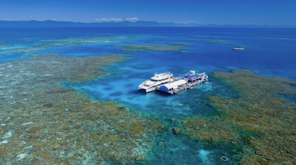 케언즈에서 무어 리프까지 쌍동선으로 크루즈를 타고 이동합니다.