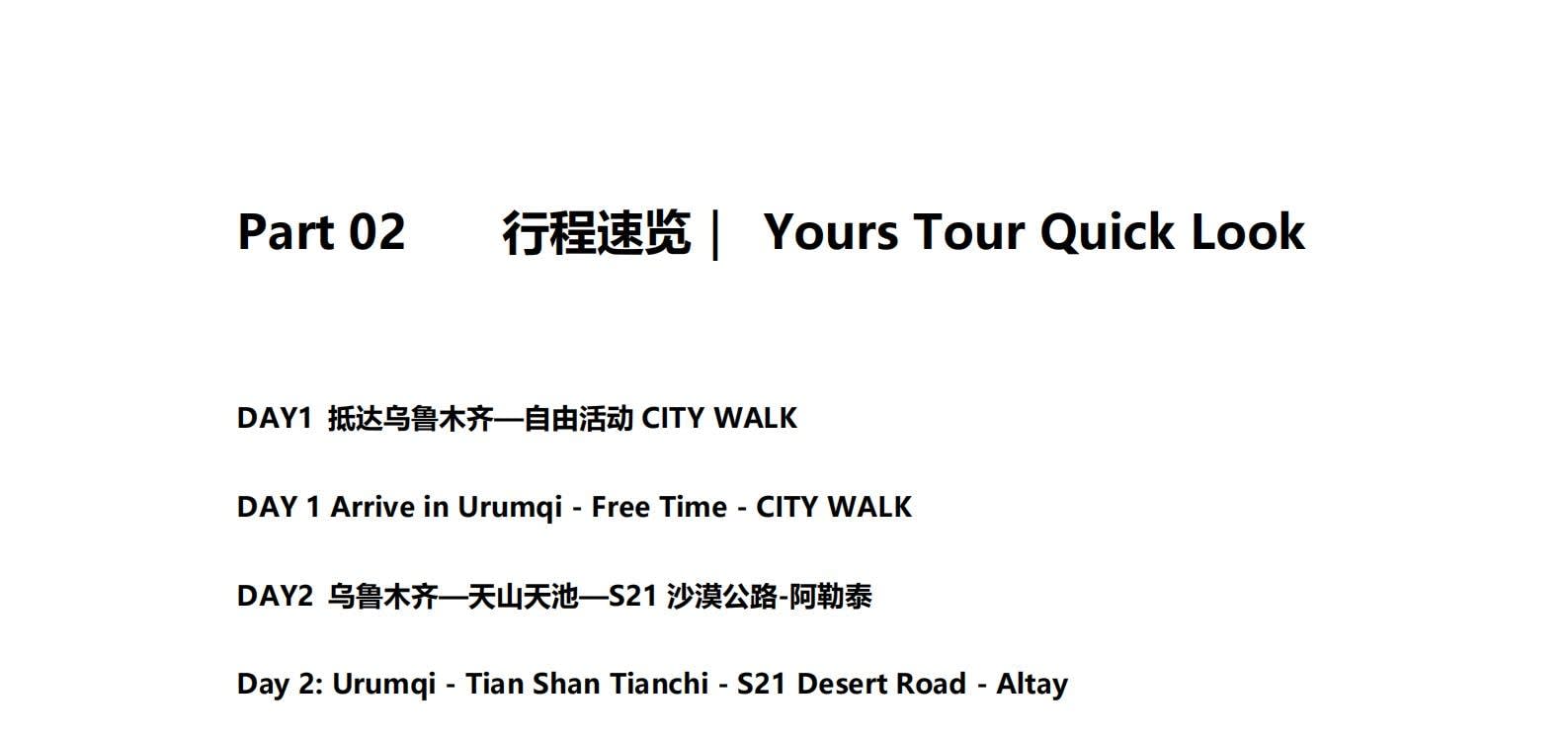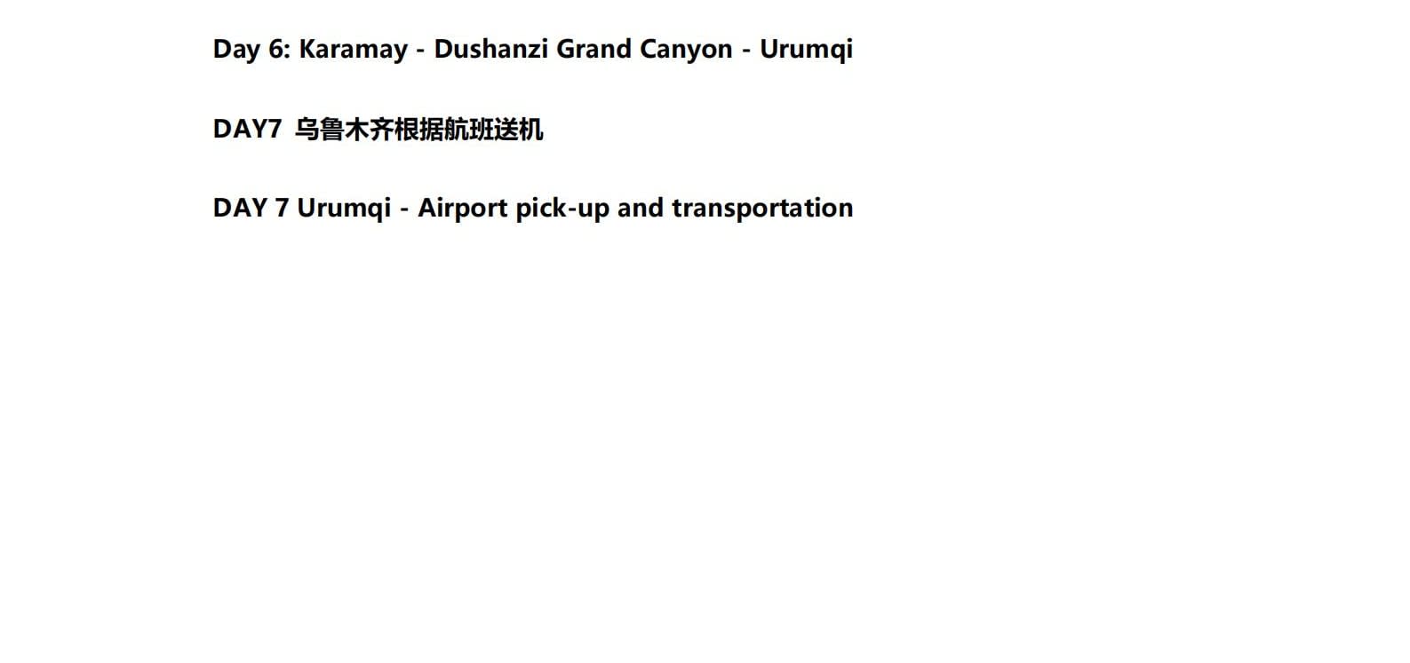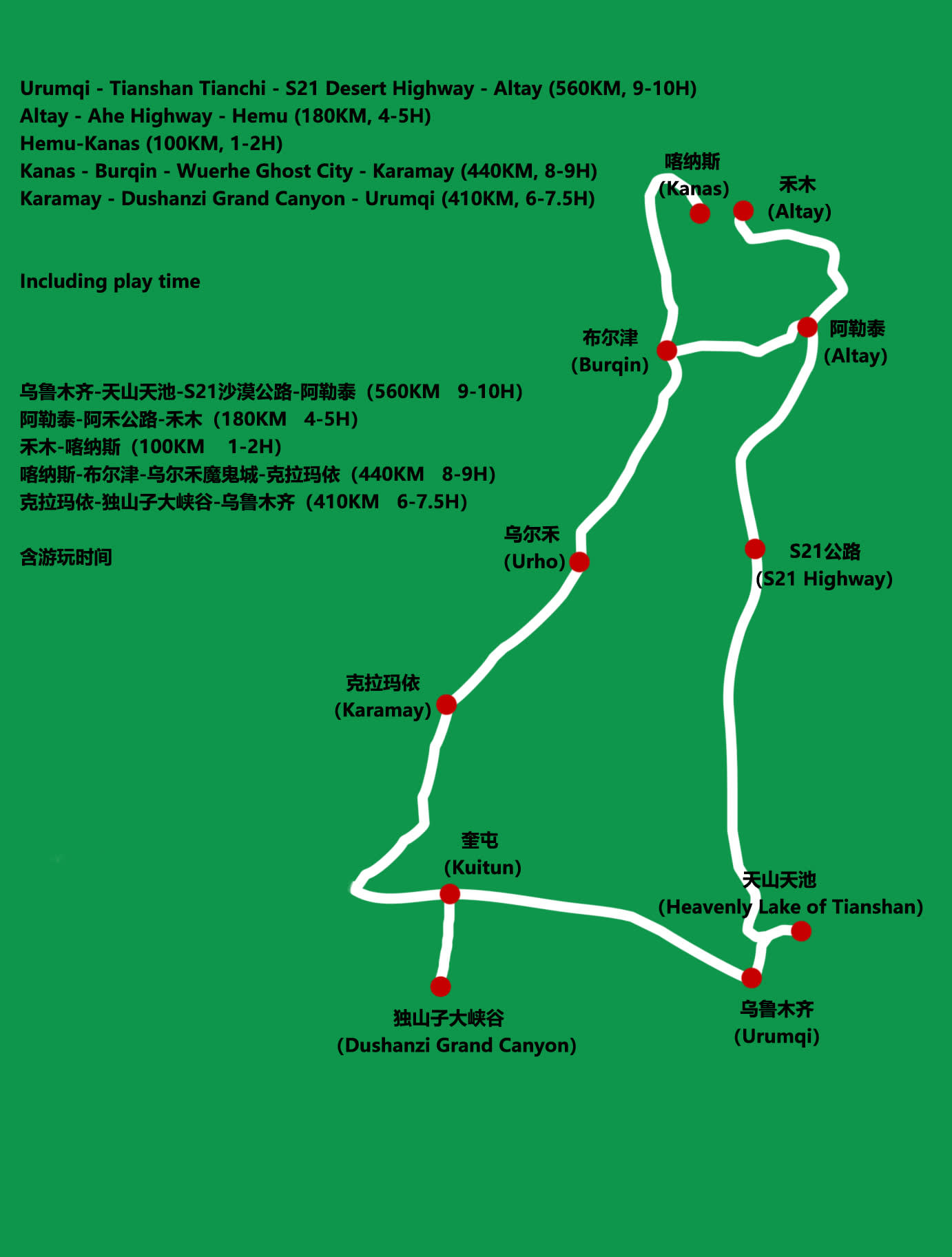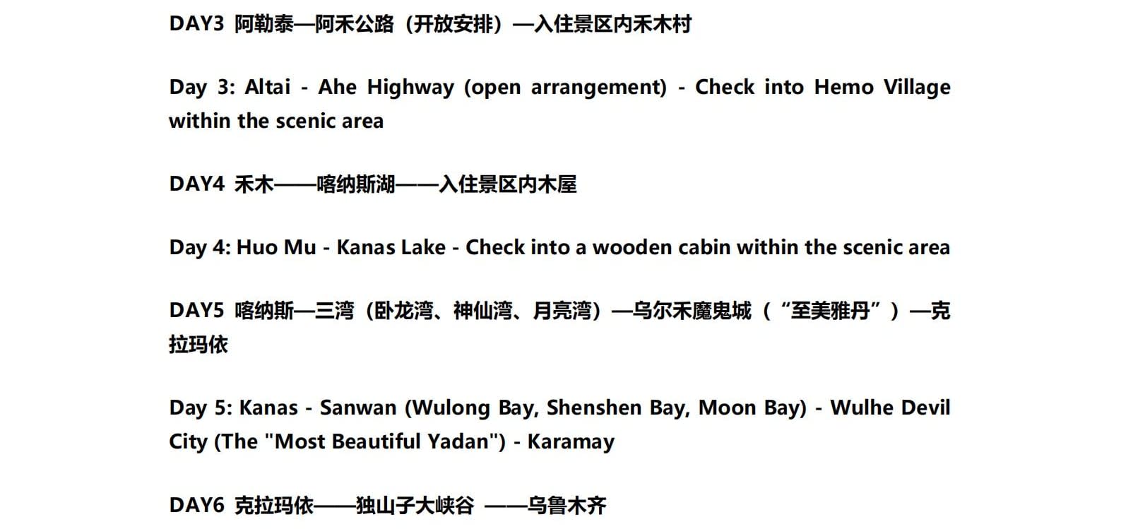 1일차 우루무치 도착 - 자유 시간 - 시티 워크 2일차: 우루무치 - 톈산 톈츠 - S21 사막 도로 - 알타이 3일차: 알타이 - 아허 고속도로 (자유롭게 이용) - 풍경구 내 허무촌 체크인 4일차: 훠무 - 카나스 호수 - 풍경구 내 목조 오두막 체크인 5일차: 카나스 - 싼완 (우룽만, 선선만, 문베이) - 우얼허 마귀성 ("가장 아름다운 야단") - 카라마이 6일차: 카라마이 - 두산즈 그랜드 캐니언 - 우루무치 7일차 우루무치 - 공항 픽업 및 교통편