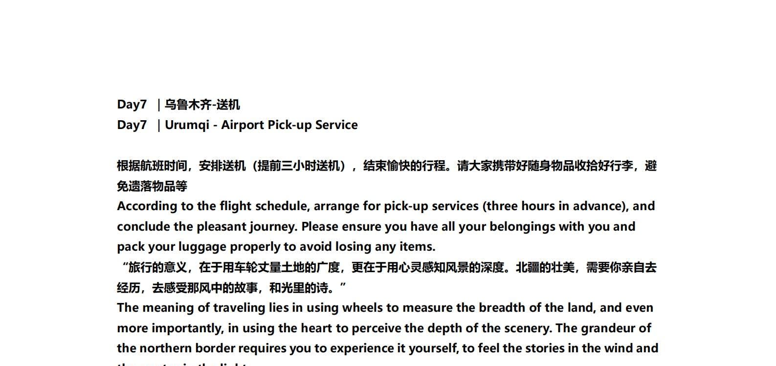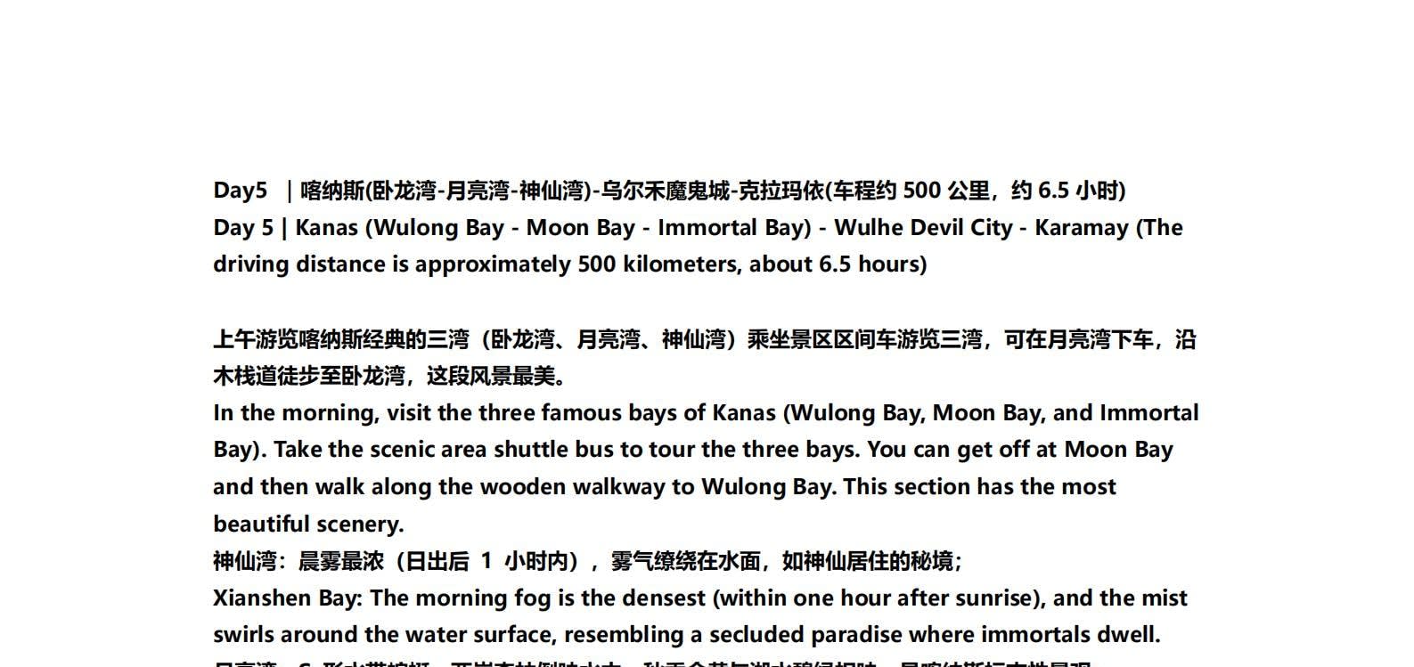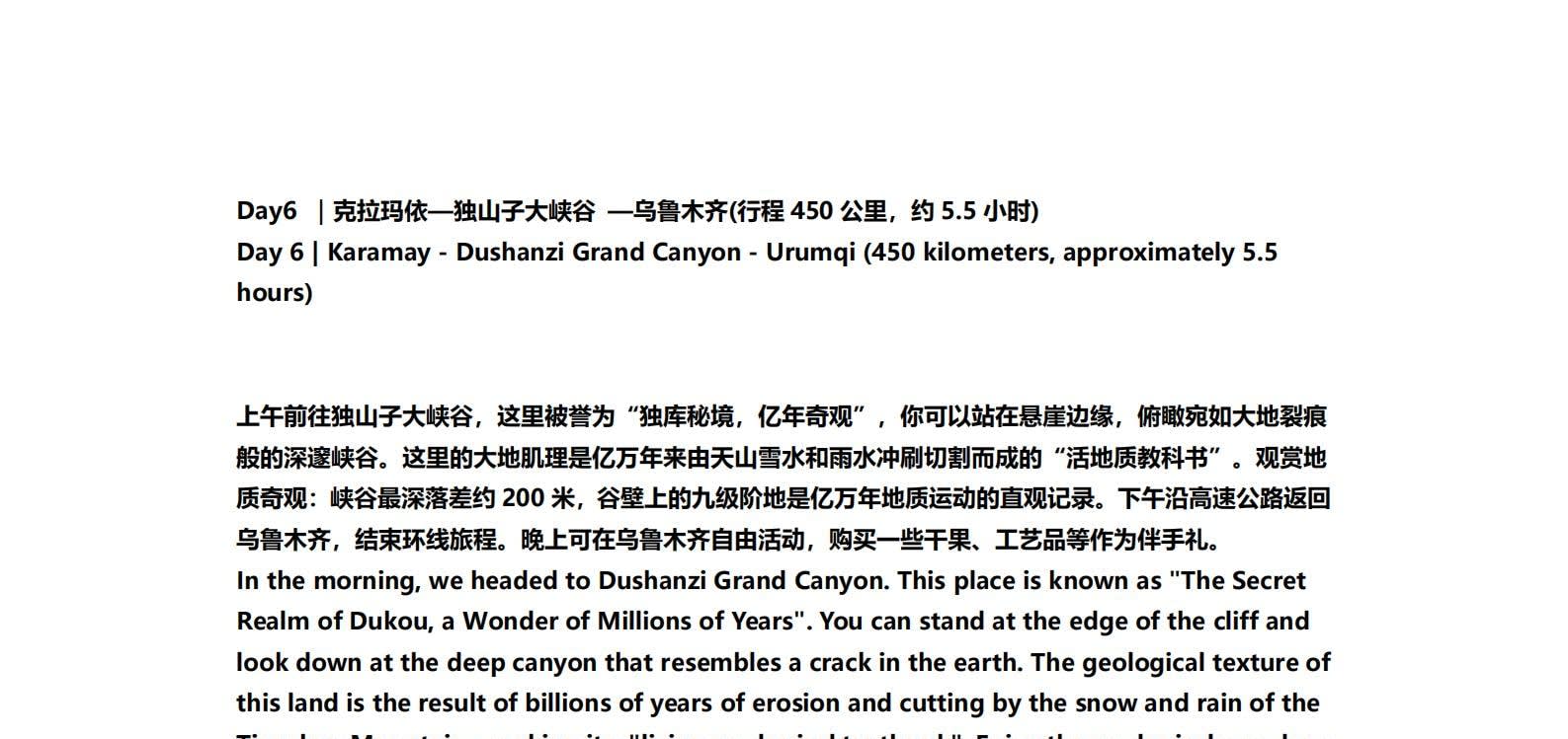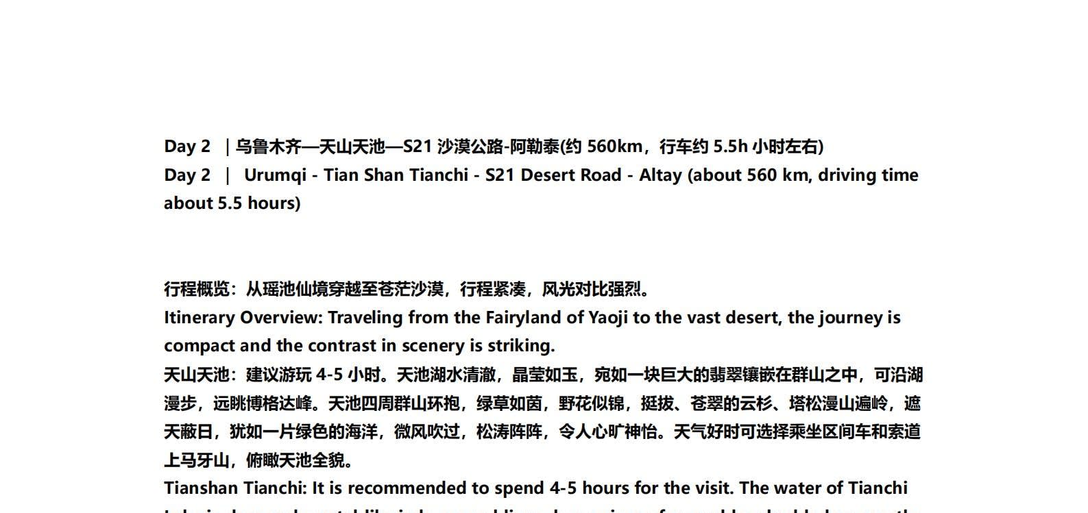 1일차 우루무치 도착 - 자유 시간 - 시티 워크 2일차: 우루무치 - 톈산 톈츠 - S21 사막 도로 - 알타이 3일차: 알타이 - 아허 고속도로 (자유롭게 이용) - 풍경구 내 허무촌 체크인 4일차: 훠무 - 카나스 호수 - 풍경구 내 목조 오두막 체크인 5일차: 카나스 - 싼완 (우룽만, 선선만, 문베이) - 우얼허 마귀성 ("가장 아름다운 야단") - 카라마이 6일차: 카라마이 - 두산즈 그랜드 캐니언 - 우루무치 7일차 우루무치 - 공항 픽업 및 교통편