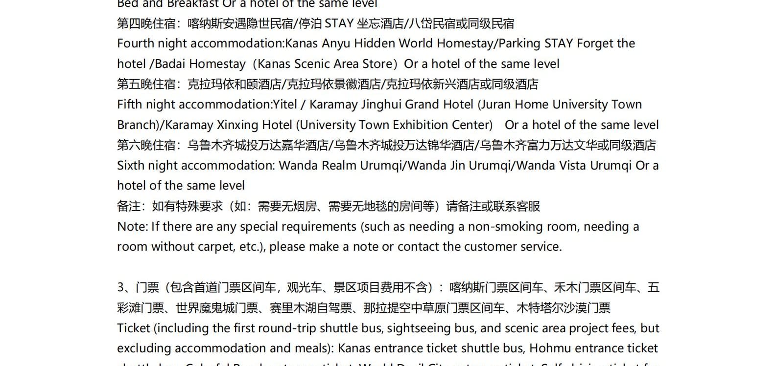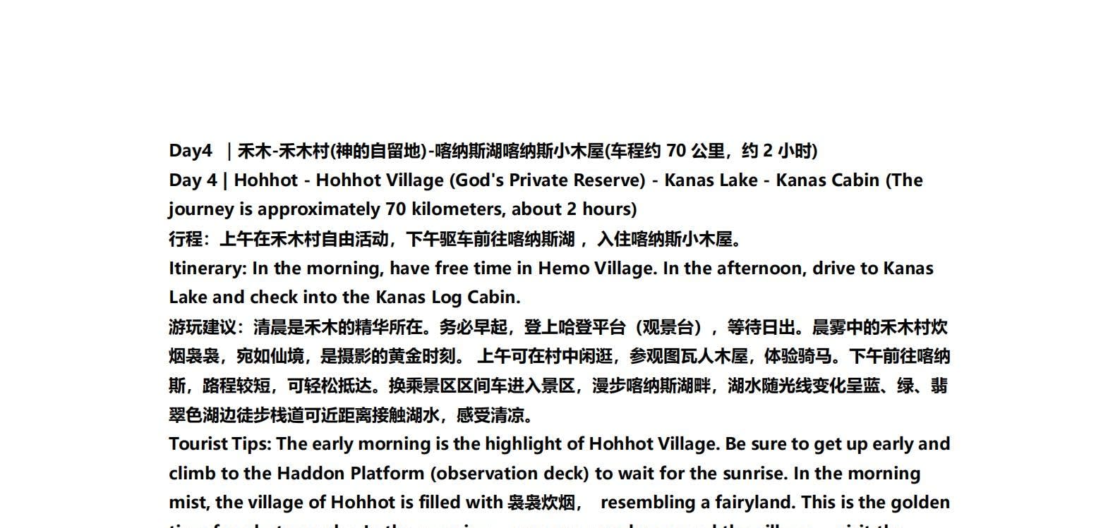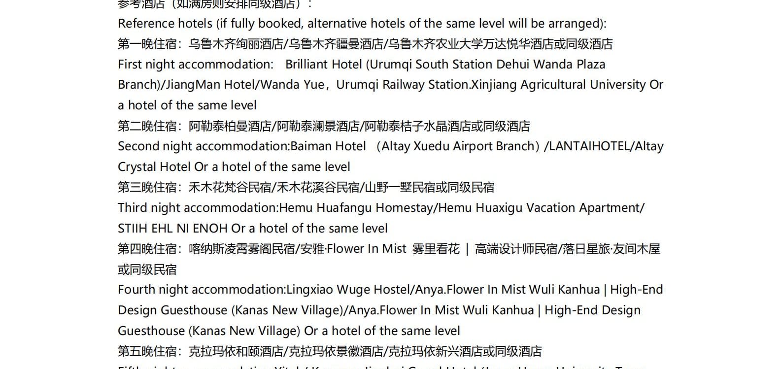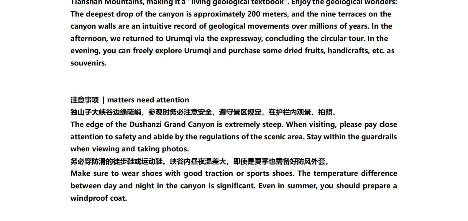 1일차 우루무치 도착 - 자유 시간 - 시티 워크 2일차: 우루무치 - 톈산 톈츠 - S21 사막 도로 - 알타이 3일차: 알타이 - 아허 고속도로 (자유롭게 이용) - 풍경구 내 허무촌 체크인 4일차: 훠무 - 카나스 호수 - 풍경구 내 목조 오두막 체크인 5일차: 카나스 - 싼완 (우룽만, 선선만, 문베이) - 우얼허 마귀성 ("가장 아름다운 야단") - 카라마이 6일차: 카라마이 - 두산즈 그랜드 캐니언 - 우루무치 7일차 우루무치 - 공항 픽업 및 교통편