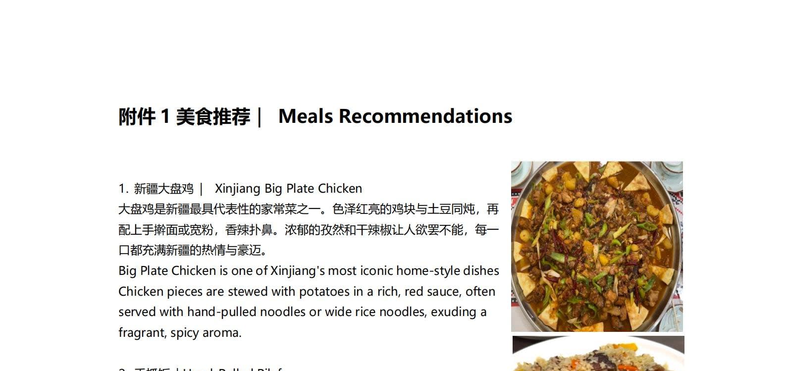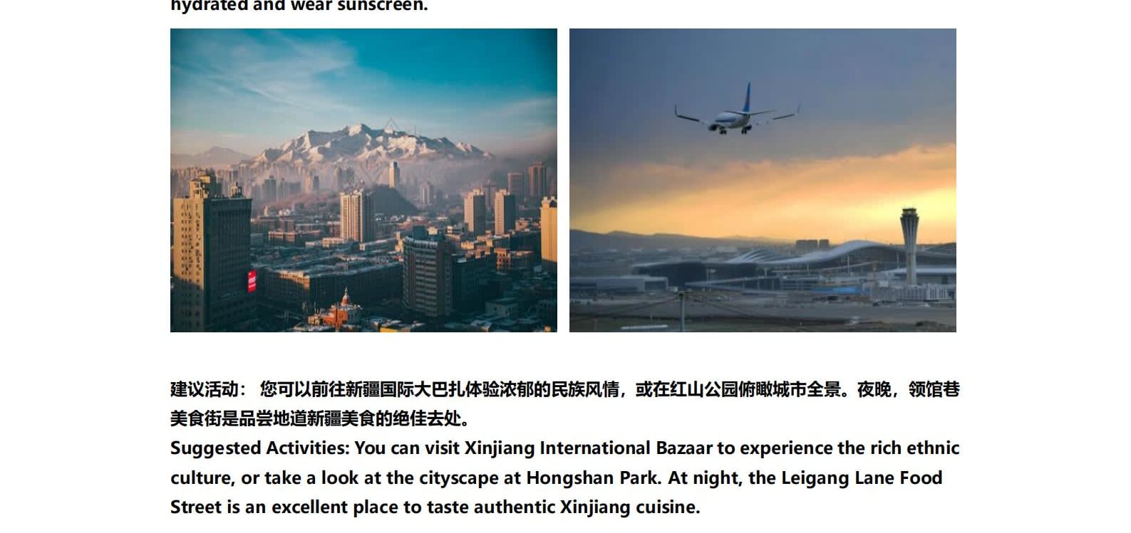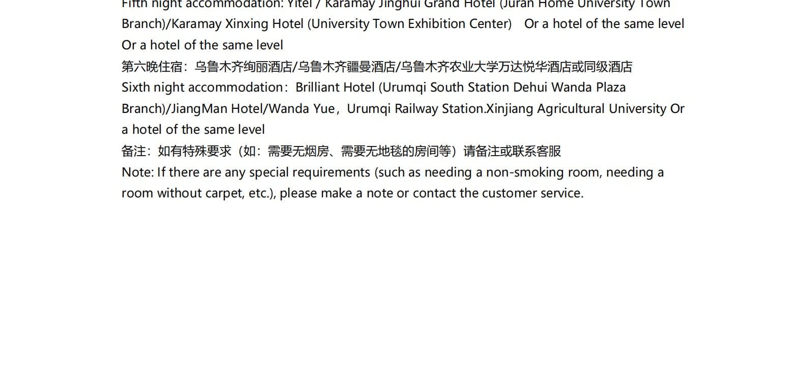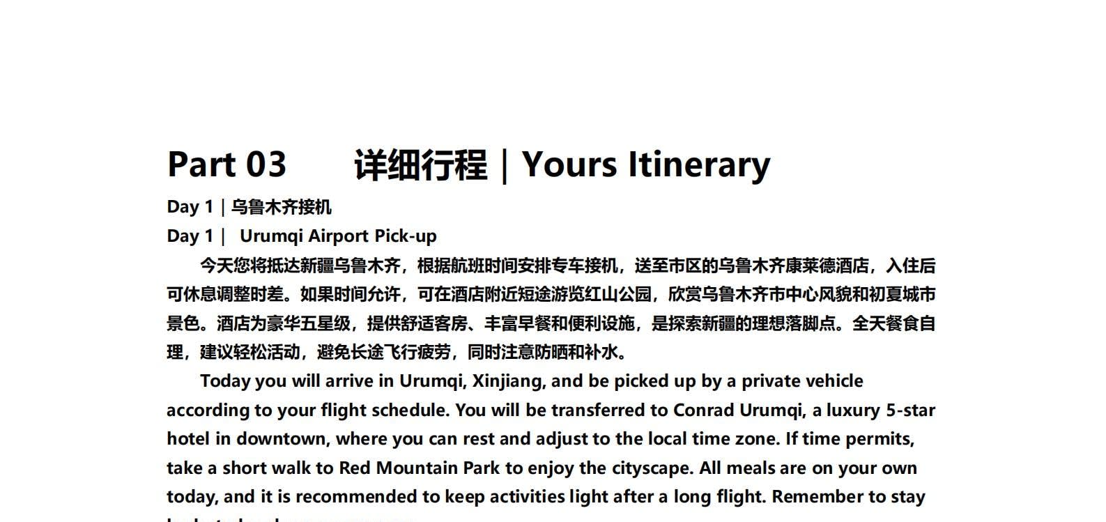 1일차 우루무치 도착 - 자유 시간 - 시티 워크 2일차: 우루무치 - 톈산 톈츠 - S21 사막 도로 - 알타이 3일차: 알타이 - 아허 고속도로 (자유롭게 이용) - 풍경구 내 허무촌 체크인 4일차: 훠무 - 카나스 호수 - 풍경구 내 목조 오두막 체크인 5일차: 카나스 - 싼완 (우룽만, 선선만, 문베이) - 우얼허 마귀성 ("가장 아름다운 야단") - 카라마이 6일차: 카라마이 - 두산즈 그랜드 캐니언 - 우루무치 7일차 우루무치 - 공항 픽업 및 교통편