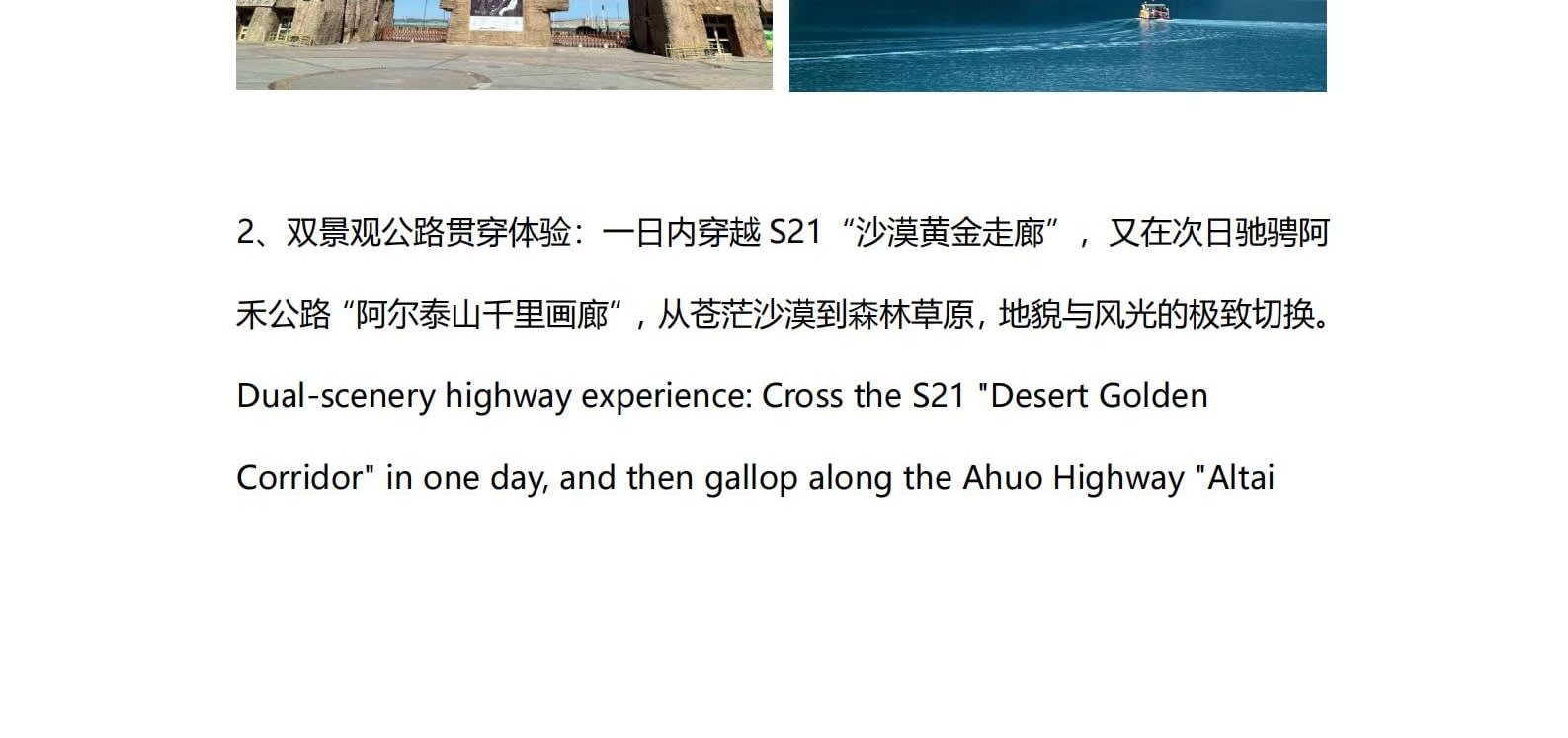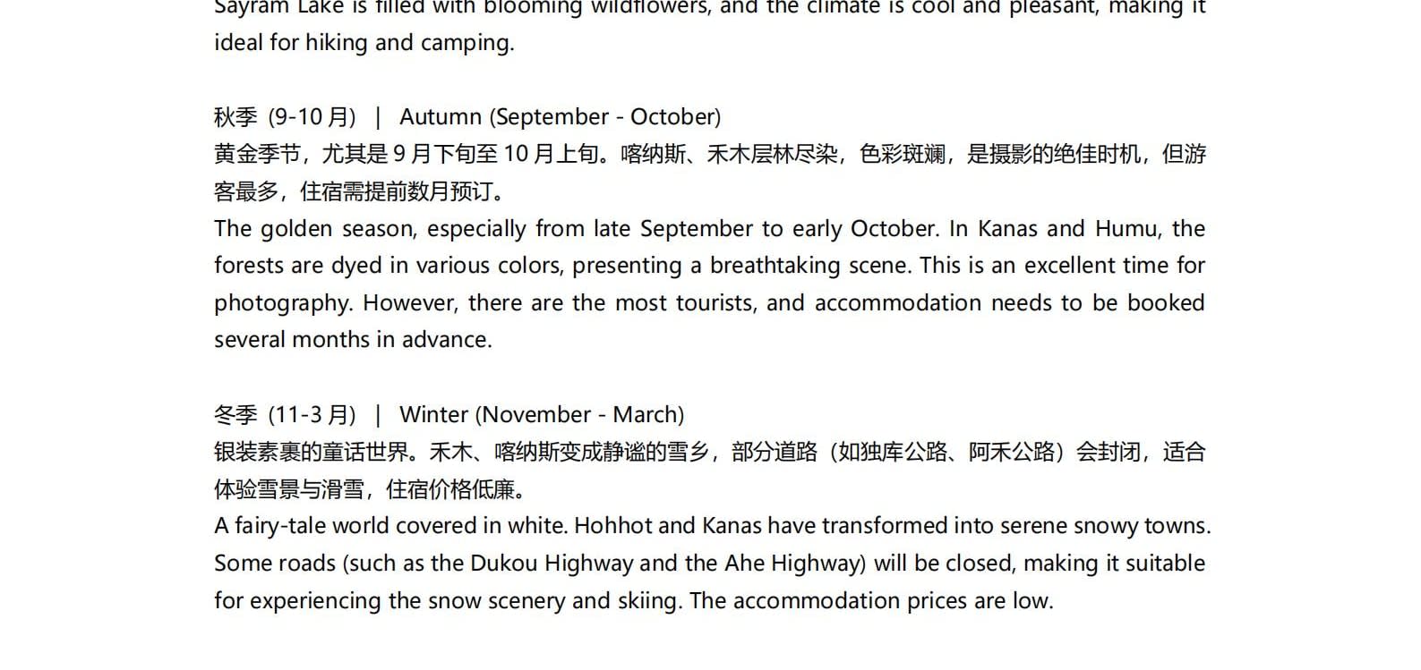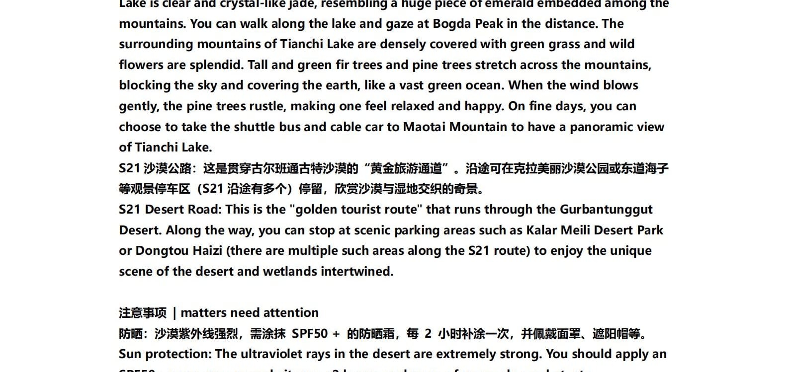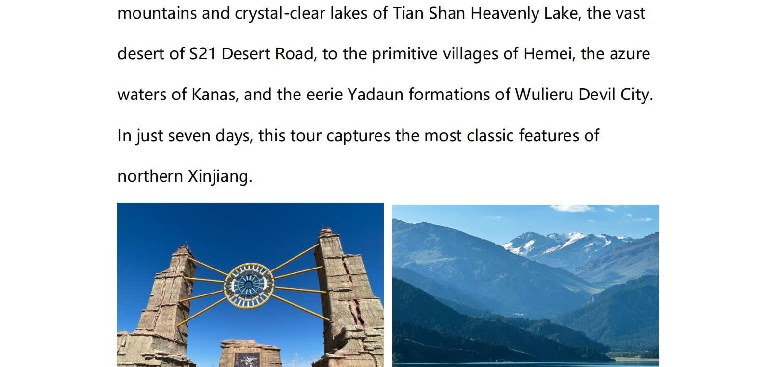 * 하루 만에 사계절을 경험하는 여행: 이 여정은 천산 천지(Tian Shan Heavenly Lake)의 눈 덮인 산과 수정처럼 맑은 호수, S21 사막 도로(S21 Desert Road)의 광활한 사막, 허메이(Hemei)의 원시 마을, 카나스(Kanas)의 푸른 물, 그리고 우리에루 악마의 도시(Wulieru Devil City)의 기이한 야단 지형에 이르기까지 매우 풍부하고 다양한 풍경을 제공합니다. 단 7일 만에 이 투어는 신장 북부의 가장 고전적인 특징들을 담아냅니다.