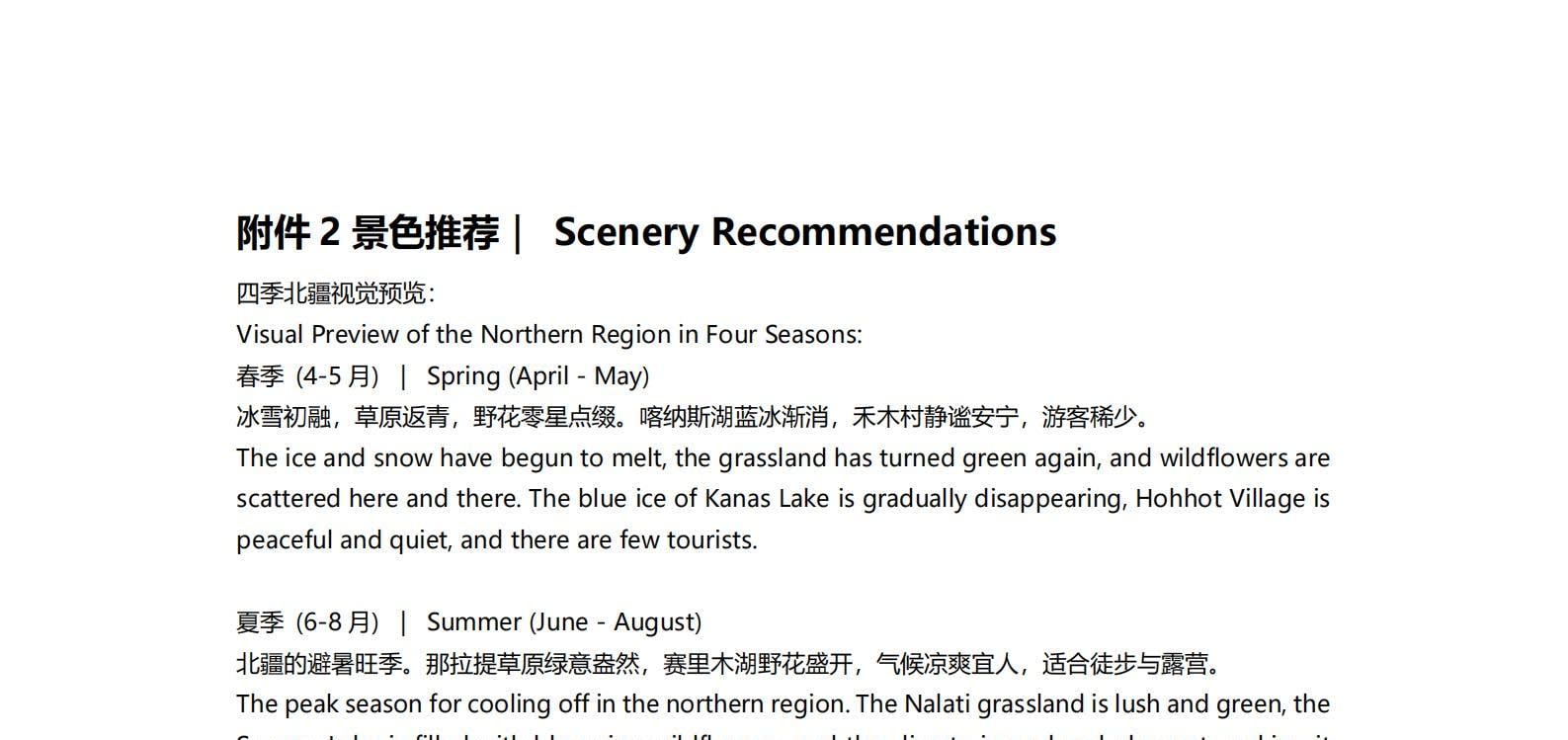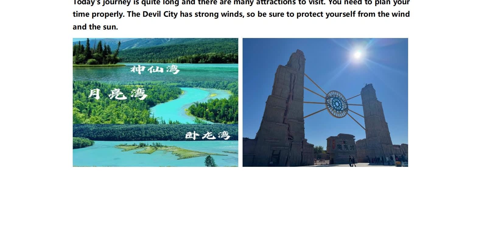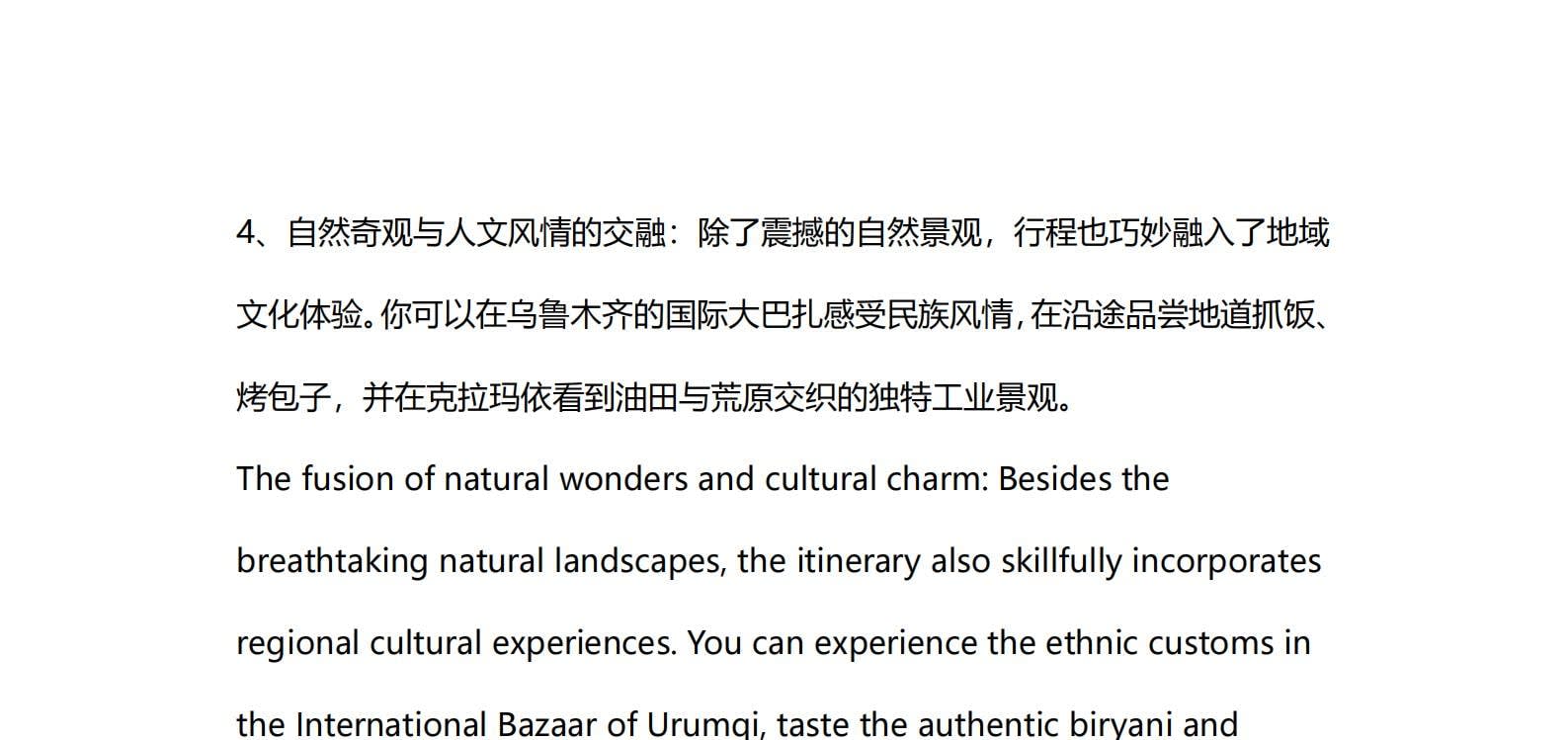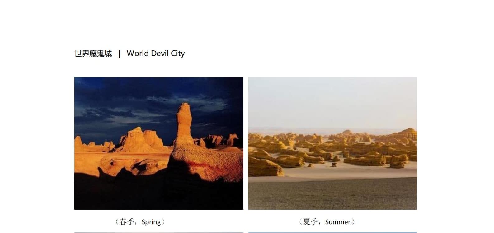 * 하루 만에 사계절을 경험하는 여행: 이 여정은 천산 천지(Tian Shan Heavenly Lake)의 눈 덮인 산과 수정처럼 맑은 호수, S21 사막 도로(S21 Desert Road)의 광활한 사막, 허메이(Hemei)의 원시 마을, 카나스(Kanas)의 푸른 물, 그리고 우리에루 악마의 도시(Wulieru Devil City)의 기이한 야단 지형에 이르기까지 매우 풍부하고 다양한 풍경을 제공합니다. 단 7일 만에 이 투어는 신장 북부의 가장 고전적인 특징들을 담아냅니다.