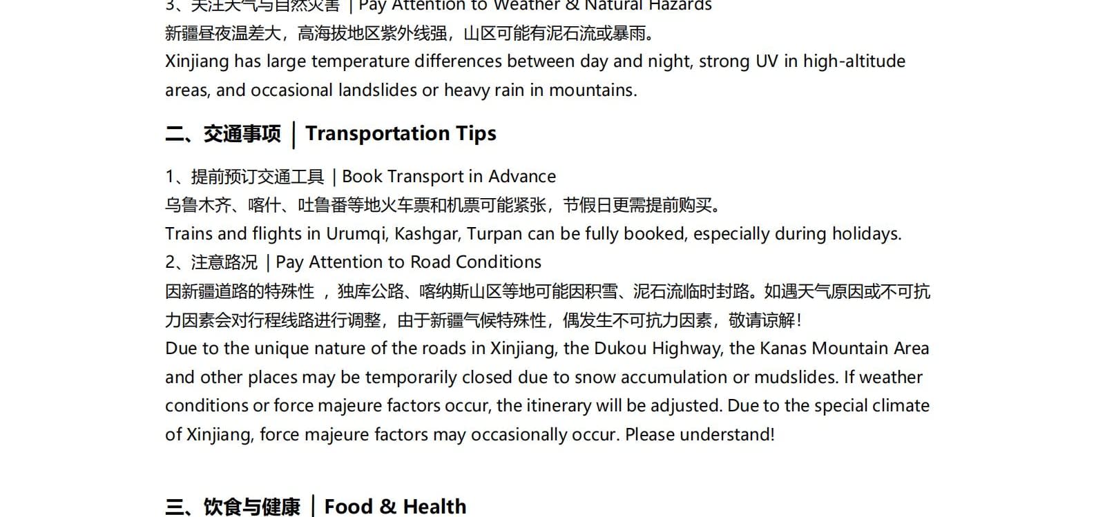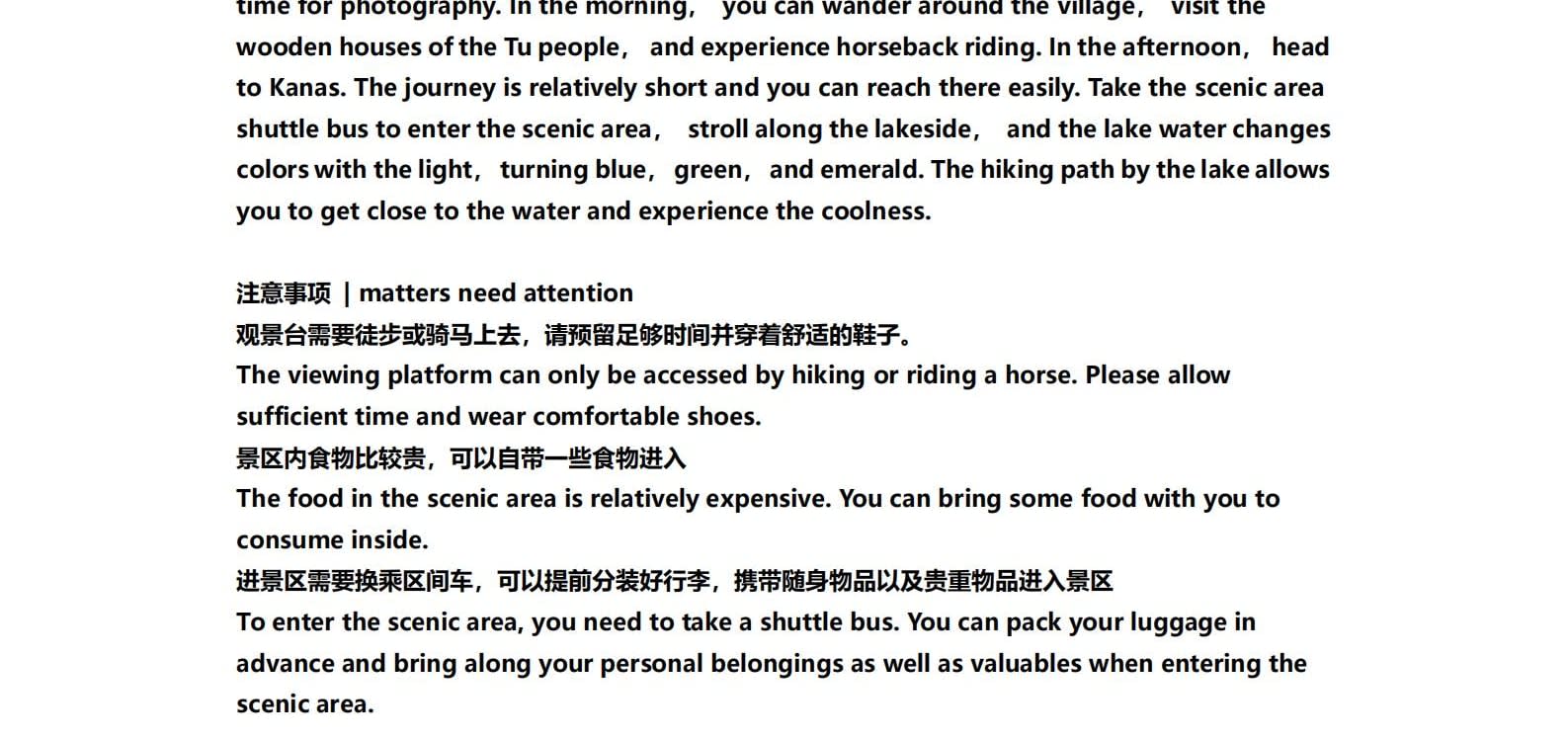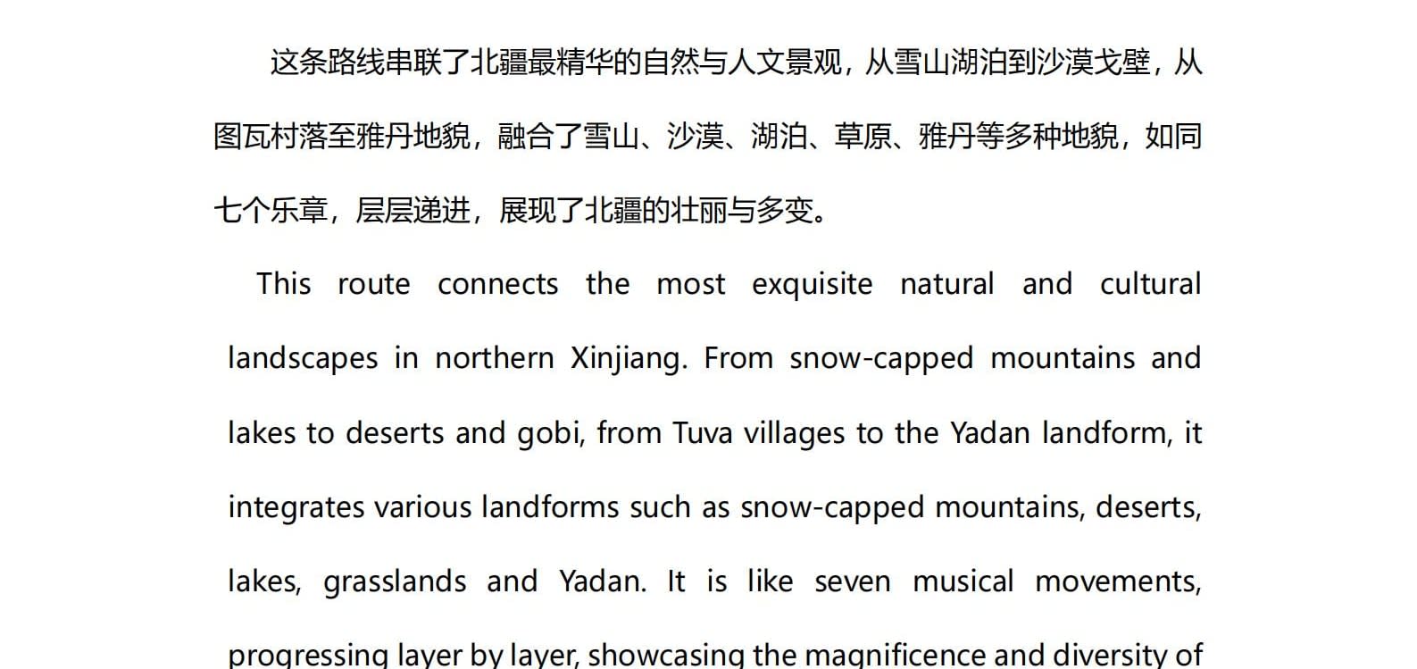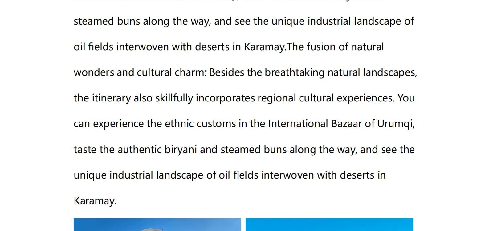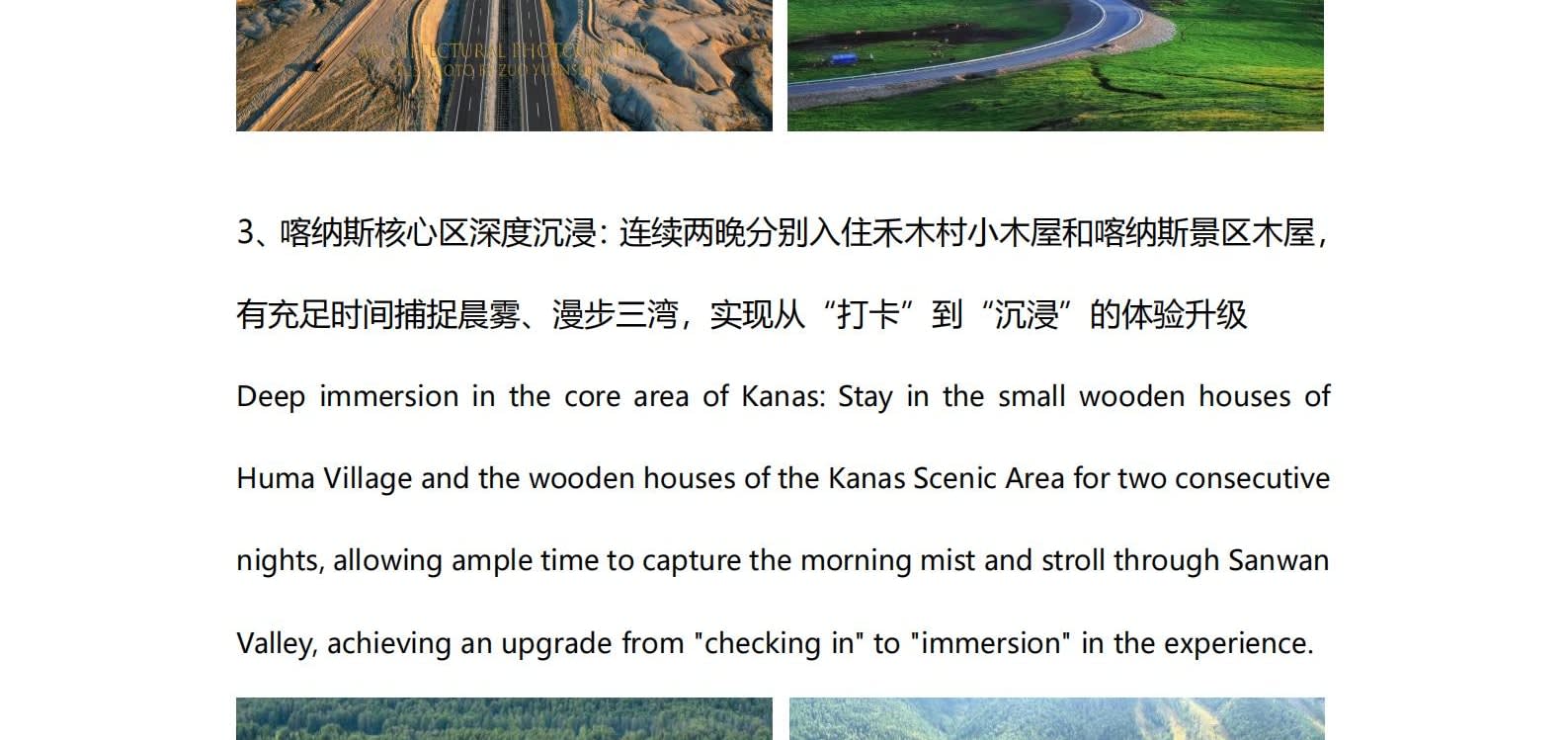 * 하루 만에 사계절을 경험하는 여행: 이 여정은 천산 천지(Tian Shan Heavenly Lake)의 눈 덮인 산과 수정처럼 맑은 호수, S21 사막 도로(S21 Desert Road)의 광활한 사막, 허메이(Hemei)의 원시 마을, 카나스(Kanas)의 푸른 물, 그리고 우리에루 악마의 도시(Wulieru Devil City)의 기이한 야단 지형에 이르기까지 매우 풍부하고 다양한 풍경을 제공합니다. 단 7일 만에 이 투어는 신장 북부의 가장 고전적인 특징들을 담아냅니다.