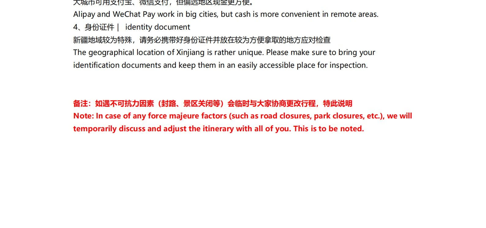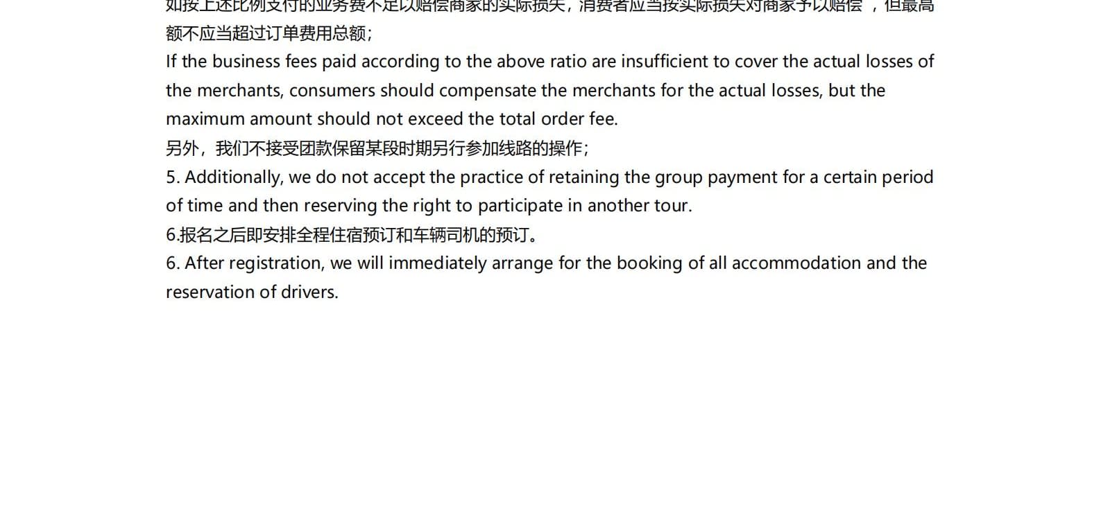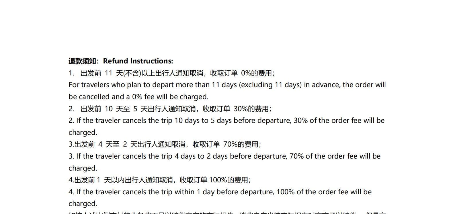 -주문 후 직원이 고객에게 연락하여 신분증 정보를 제공합니다. 환불 규정: 출발 11일 전(11일 제외)보다 일찍 출발할 예정인 여행객의 경우, 주문이 취소되며 수수료는 0% 부과됩니다. 2.출발 10일 전부터 5일 전까지 여행을 취소하는 경우, 주문 금액의 30%가 부과됩니다. 3.출발 4일 전부터 2일 전까지 여행을 취소하는 경우, 주문 금액의 70%가 부과됩니다. 4.출발 1일 전 이내에 여행을 취소하는 경우, 주문 금액의 100%가 부과됩니다. 위 비율에 따라 지불된 사업 수수료가 판매자의 실제 손실을 충당하기에 부족한 경우, 소비자는 판매자의 실제 손실을 보상해야 하지만, 최대 금액은 총 주문 금액을 초과할 수 없습니다. 5.또한, 단체 결제를 일정 기간 보관한 후 다른 투어에 참여할 권리를 유보하는 관행은 허용되지 않습니다. 6.등록 후 모든 숙소 예약 및 운전자 예약을 즉시 진행합니다.