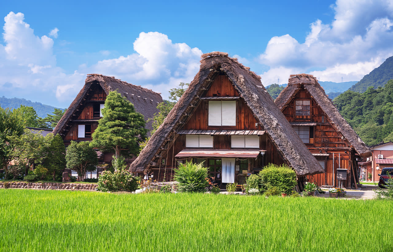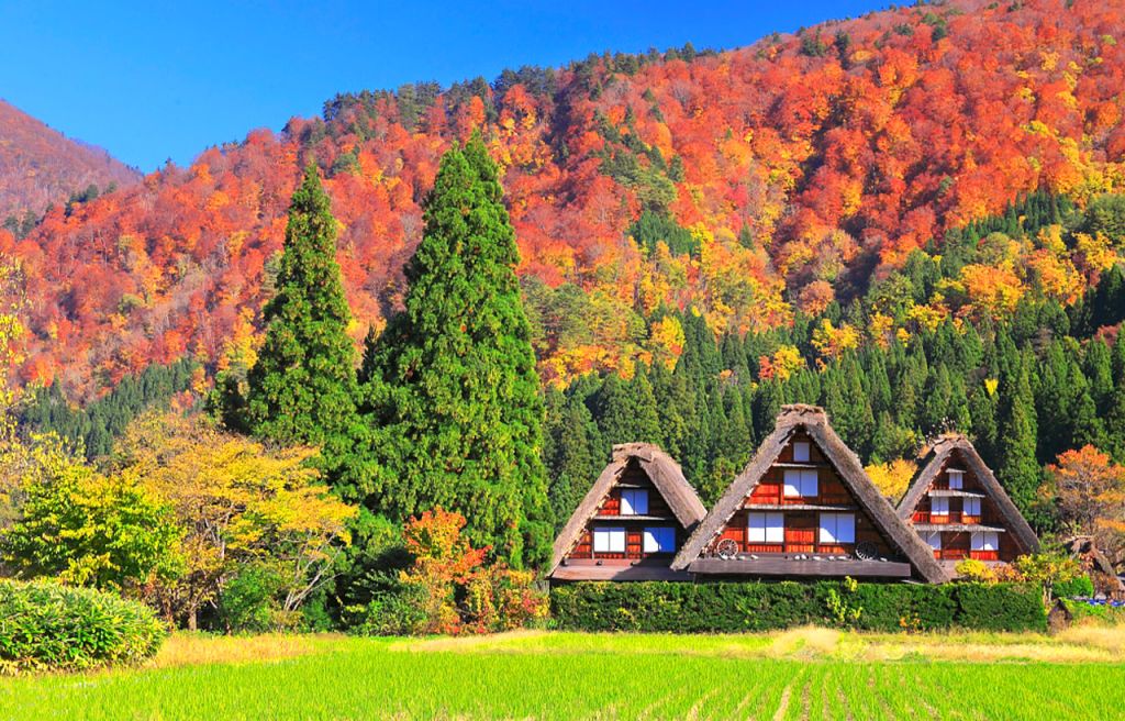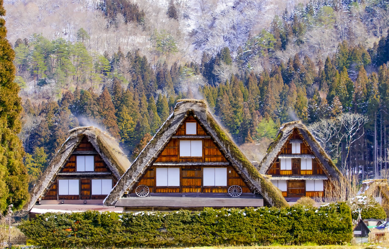 * 시라카와고 갓쇼무라에서 전통 초가 지붕 가옥과 자연 경관의 완벽한 조화 감상