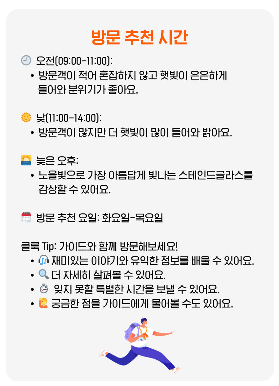 * 오디오 가이드, 라이브 가이드, 타워 전망대 입장 옵션을 추가하여 더욱 풍성한 시간을 보내세요.