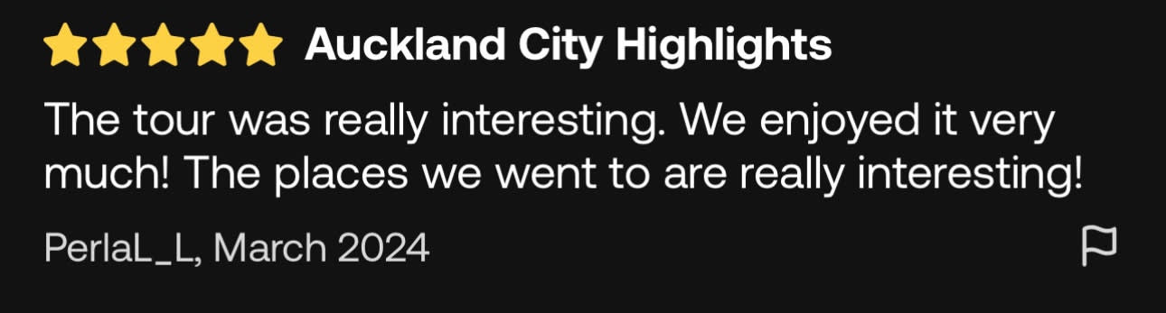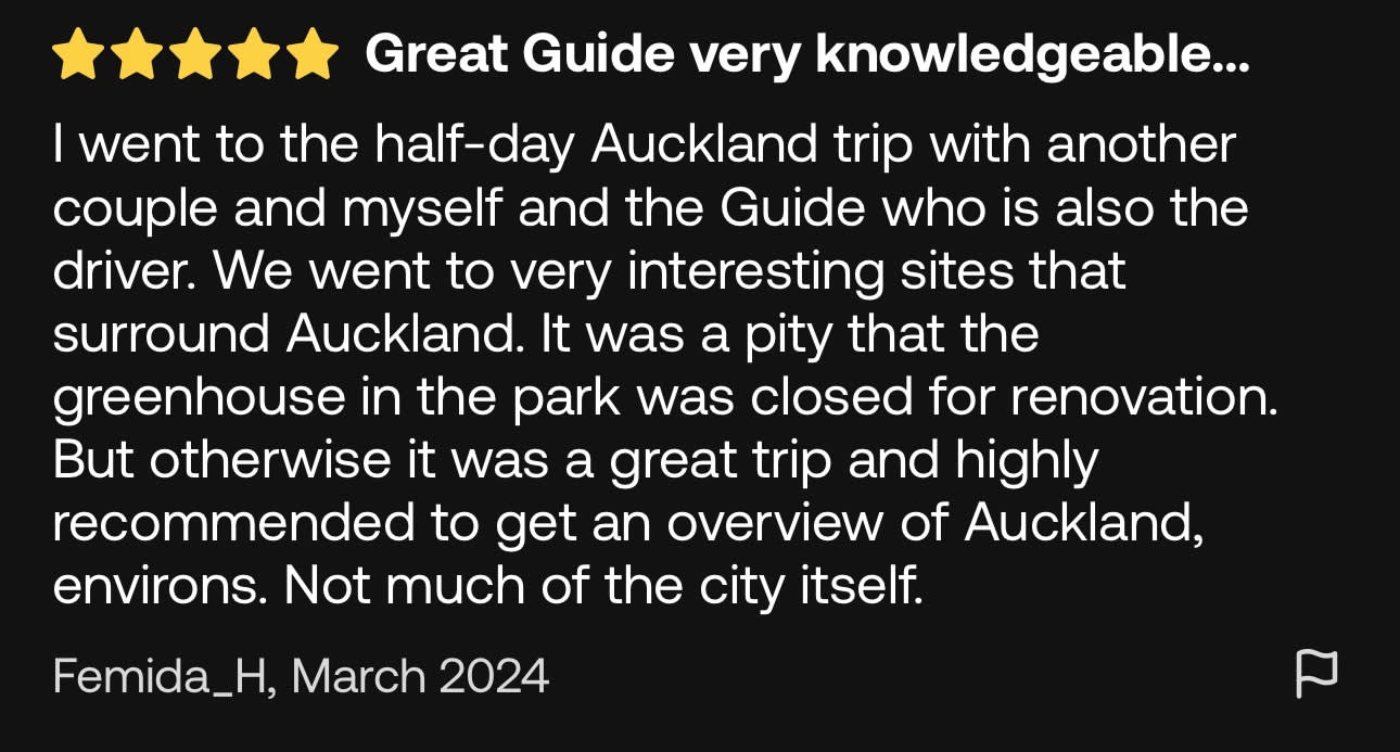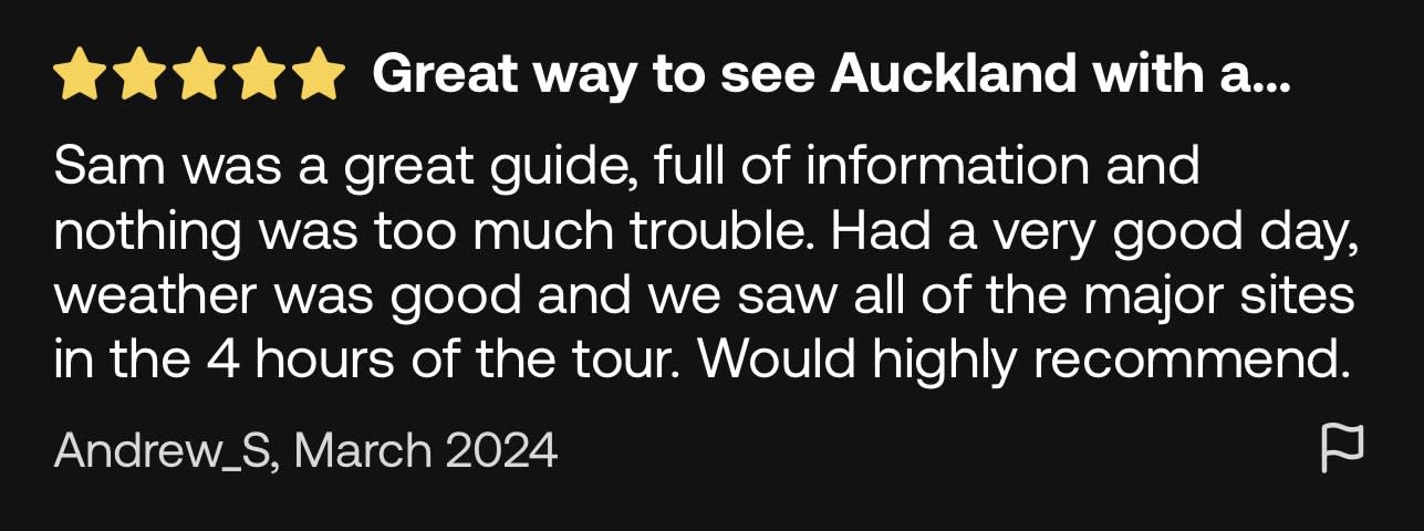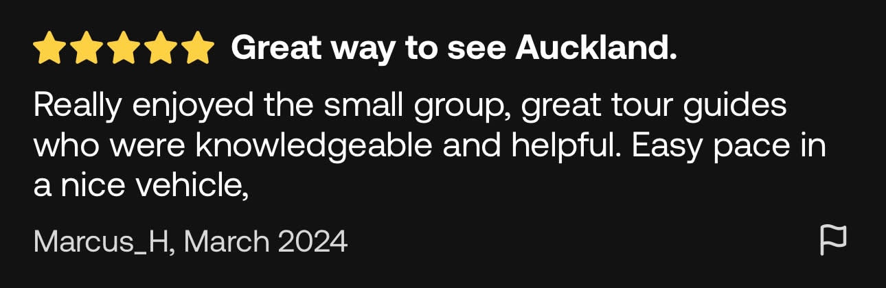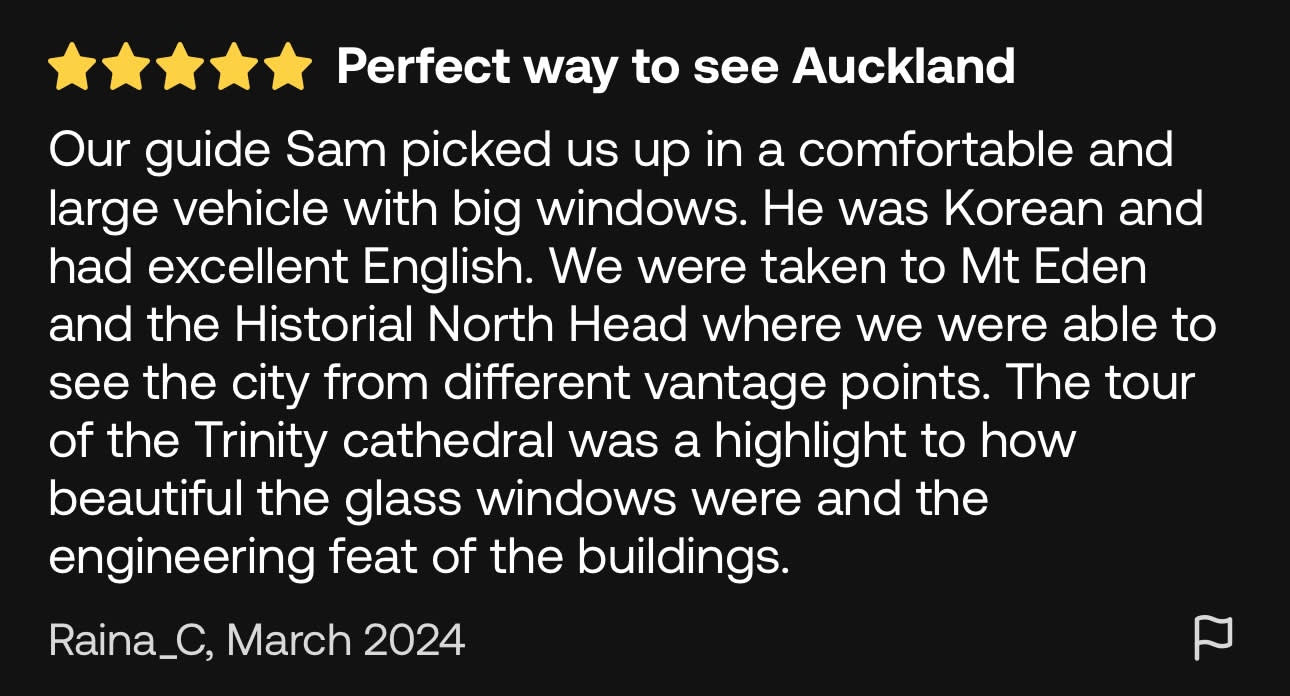 ▶오클랜드 시티 핵심 명소 반나절 투어 (소규모 그룹 투어) - 이용요건 * 공지: 영유아 및 아동도 탑승객 인원수에 포함되어야 합니다. * 만 0-18세는 반드시 티켓을 소지한 성인을 동반해야 합니다. * 유아용 카시트 이용 불가 * 그룹 규모: 참여자 수 1-10인 - 추가정보 * 필수 사항은 아니나, 본 액티비티 참여 전 상해 또는 여행 보험 가입을 권장합니다. - 규정 및 제한사항 * 음주 상태의 참여자는 서비스 이용이 거부될 수 있습니다. 이 경우 환불은 불가합니다. * 반려동물 동반은 불가합니다 - 준비물 * 자외선 차단제 / 선글라스 / 모자 / 현금 / 생수 - 복장 * 캐주얼 복장 / 걷기 편한 운동화 (워킹화) - 편의성/접근성 * 아동용 카시트를 이용할 수 없습니다. * 휠체어 이용/수용이 불가능합니다.