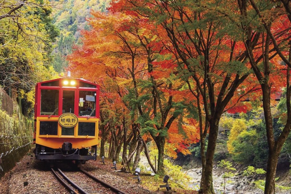 아라시야마 관광의 대표 코스인 사가노 토롯코 열차는, 클래식한 색감의 디젤 기관차가 자연 속을 달리며