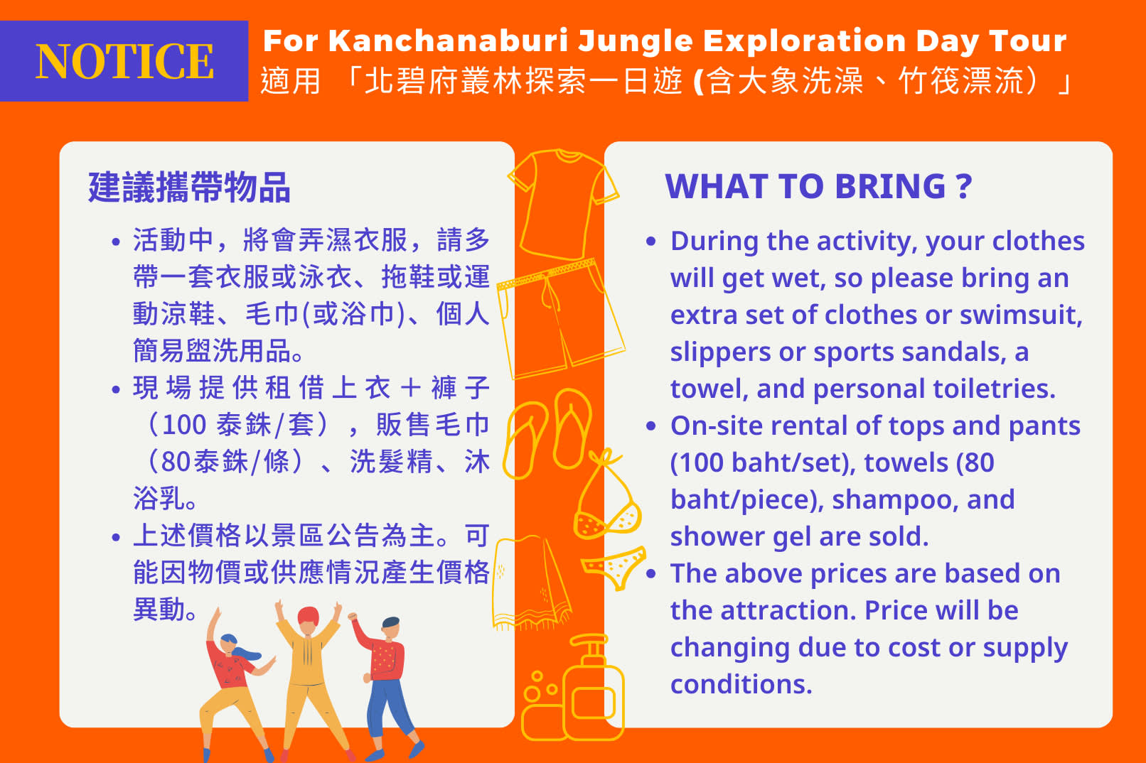 ▶정글 탐험 조인 일일 투어 (점심 식사 불포함) - 이용요건 * 만 4세 이상만 본 액티비티에 참여할 수 있습니다. * 예약당 아동용 카시트(만 0-6세, 신장 135cm 미만) 1개 무료 제공 선착순으로 제한된 수량만 제공됩니다. 추가 아동용 카시트는 1개당 1일 THB200의 추가 요금이 부과됩니다.카시트는 추가 서비스이며, 투어 요금은 변동 없이 결제하셔야 합니다. 결제 페이지에서 필요한 카시트 수량을 선택해 주세요. 어린이 카시트 요금 결제 관련하여 담당자가 연락드립니다. * 공지: 영유아 및 아동도 탑승객 인원수에 포함되어야 합니다. * 최소 6인 이상 참여 가능합니다. 최소 참여 인원 미달 시 예약일 2일 전에 취소 안내를 드립니다. 다른 날짜로 변경하거나 전액 환불을 요청할 수 있습니다. - 추가정보 * 결제 페이지에서 선호하는 언어를 선택하시면 해당 언어에 능통한 가이드가 배정됩니다. * 미니밴에는 짐을 보관할 공간이 없습니다. 짐은 투어에 가지고 오지 마세요. * 투어 종료 후 가이드에게 감사의 표시로 팁을 주시는 것을 권장합니다. - 준비물 * 활동 후 갈아입을 여벌옷을 준비해 주세요. * 여벌 옷 / 자외선 차단제 / 선글라스 / 모자 / 현금 - 복장 * 당일 기상 상황에 맞는 복장을 착용하세요. * 이번 여정에는 기차를 이용하기 때문에 여성분들은 짧은 치마와 하이힐 착용을 삼가해 주시기 바랍니다. - 편의성/접근성 * 유모차 이용/수용 / 휠체어 이용/수용 / 유모차 및 휠체어 이용/수용이 불가능합니다.