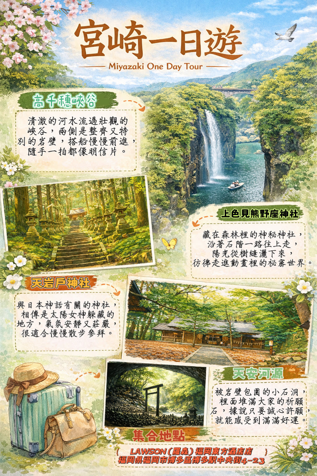 ▶카미시키미 쿠마노자 신사+다카치호 협곡+아마노이와토 신사+아마노야스가와라 (미야자키규 특선 점심 포함) [인원 한정: 30% 할인] - 이용요건 * 만 0-2세는 별도의 좌석이 필요하지 않은 경우 무료입니다. * 만 3세 이상은 성인과 동일한 요금이 적용됩니다. - 추가정보 * 각 손님은 최대 1개의 수하물을 무료로 휴대할 수 있으며, 주문 시 '특별 요청'란에 기재해 주시기 바랍니다. 하루 전에 미리 알려주시지 않고 임시로 휴대하시면 차량 혼잡을 초래하여 운행 안전에 영향을 미칠 수 있으며, 가이드가 탑승을 거부할 권리가 있고, 비용은 환불되지 않습니다. 양해 부탁드립니다. * 2025년 8월 1일부터 점심 식사로 소고기 세트 메뉴가 제공됩니다. 소고기나 육류를 드시지 않는 손님께서는 미리 말씀해 주시면 닭고기 세트 메뉴나 채식 세트 메뉴를 제공해 드리겠습니다. * 본 이벤트에서 판매되는 좌석은 앞 3열이며, 좌석 위치에 대한 특별한 요청이나 선호가 있으신 경우, 유의하시어 신중하게 선택해 주시기 바랍니다. * 벚꽃 시즌 특별 일정: 예상 시작 시기는 3월 하순부터 4월 초이며, 죠센지(浄専寺)로 벚꽃을 구경하러 갈 예정입니다. 날씨와 개화 시기에 따라 일부 조정될 수 있으니 양해 부탁드립니다. - 규정 및 제한사항 * 음주 상태의 참여자는 서비스 이용이 거부될 수 있습니다. 이 경우 환불은 불가합니다. - 준비물 * 자외선 차단제 / 선글라스 / 모자 / 우의 / 생수 - 편의성/접근성 * 아동용 카시트를 이용할 수 없습니다. - 차량 & 수하물 정보 * 수하물 수용: 표준 크기 수하물 1개