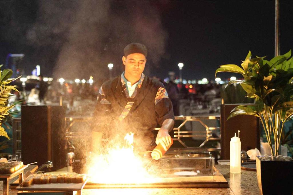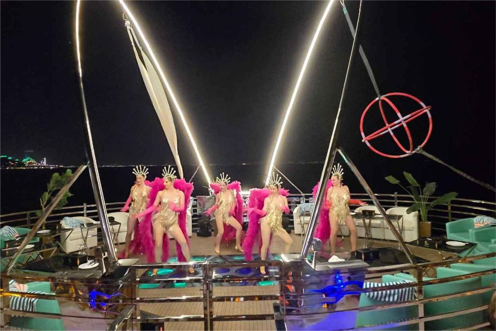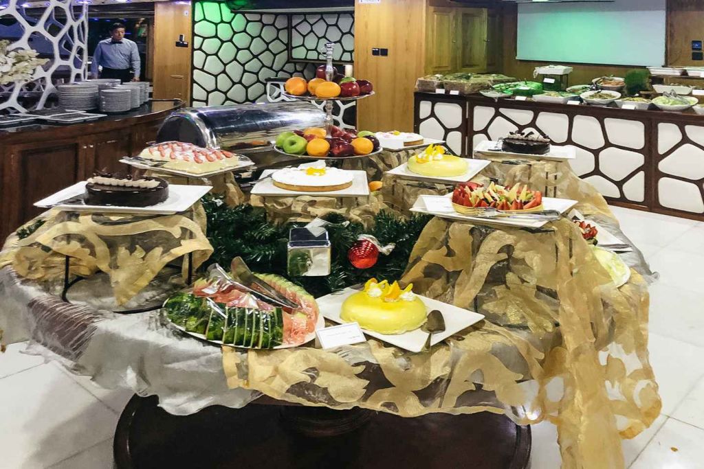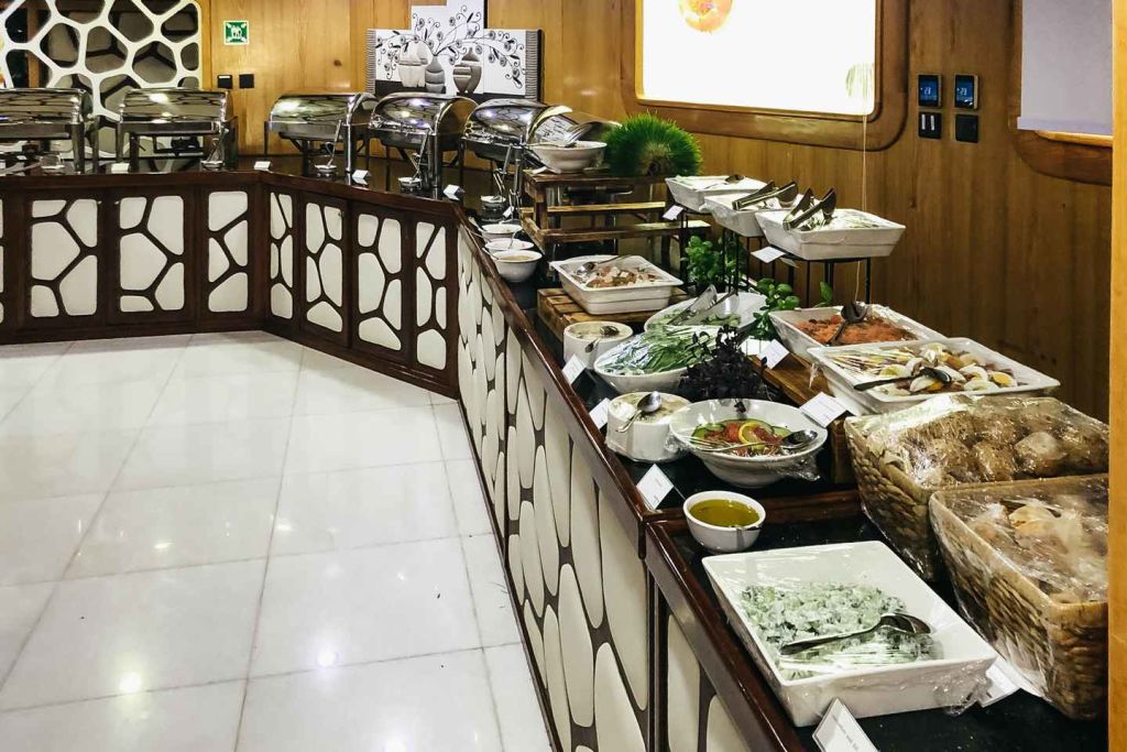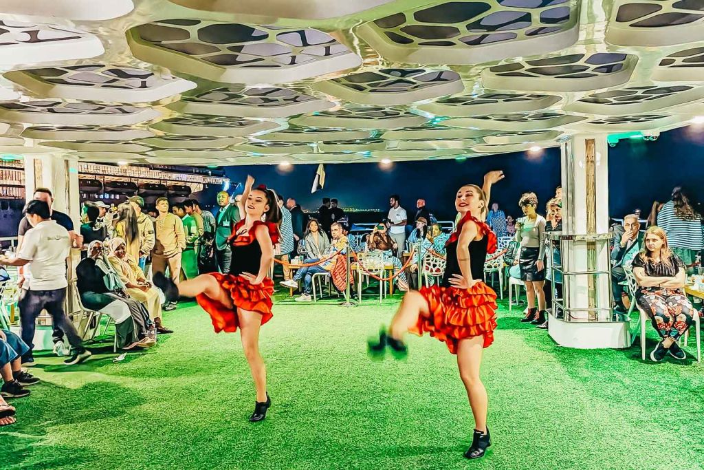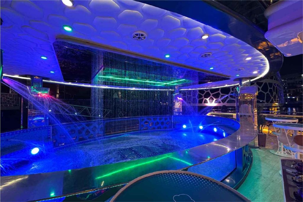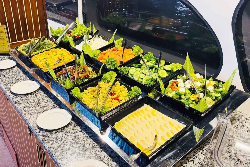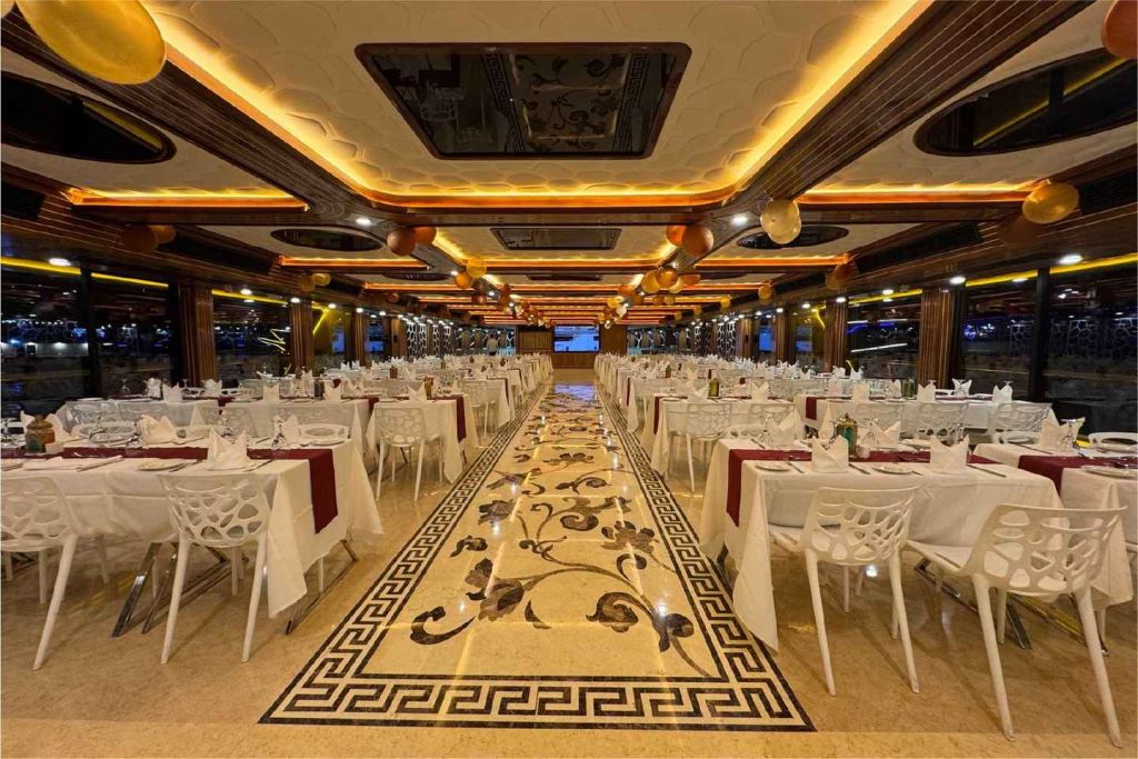 다양한 카나페와 세계 각국의 뷔페 음식, 라이브 쿠킹 스테이션을 맛보세요. 다양한 데크와 식사 공간을 둘러보며 다양한 현지 및 세계 각국의 요리를 즐겨보세요. 크루즈 내내 라이브 공연 쇼, 공중 묘기, 전통 춤, DJ 음악이 여러분을 매료시킬 것입니다. 체험은 출발 지점에서 종료됩니다. 로터스 로얄을 이용할 수 없는 경우 로터스 또는 데저트 로즈에서 동일한 음식, 프로그램 및 엔터테인먼트로 크루즈를 진행합니다.