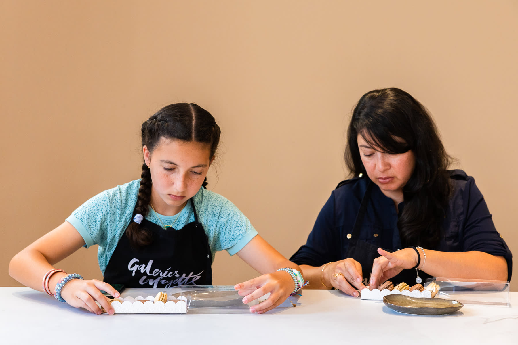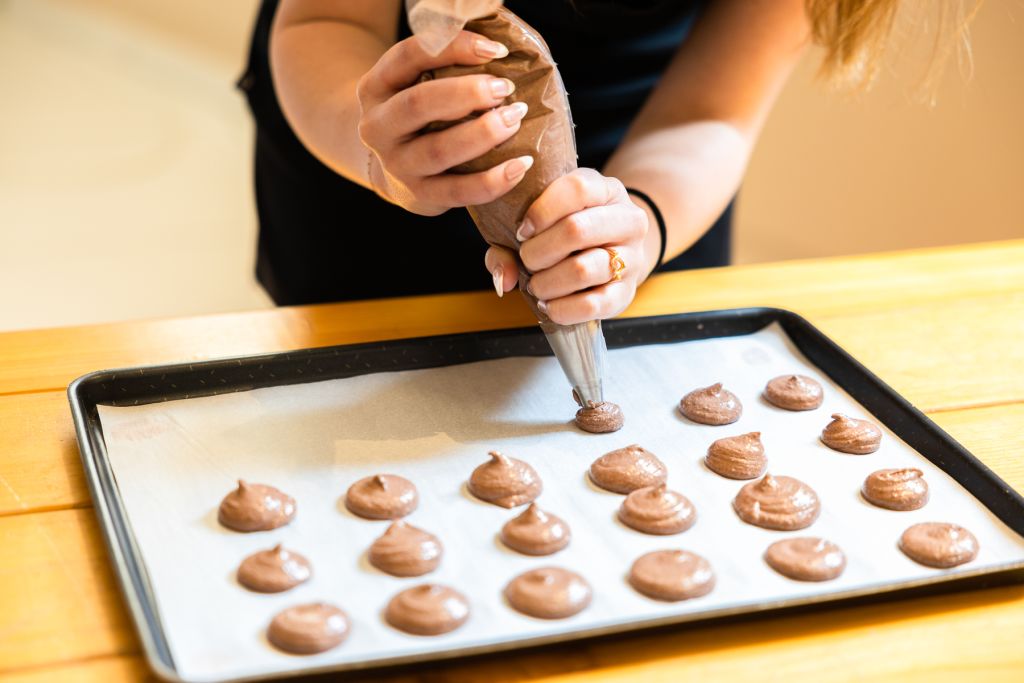 * 앞치마를 두르고 마카롱 쉘과 가나슈 필링을 조립하고 만드는 방법을 알아보세요.