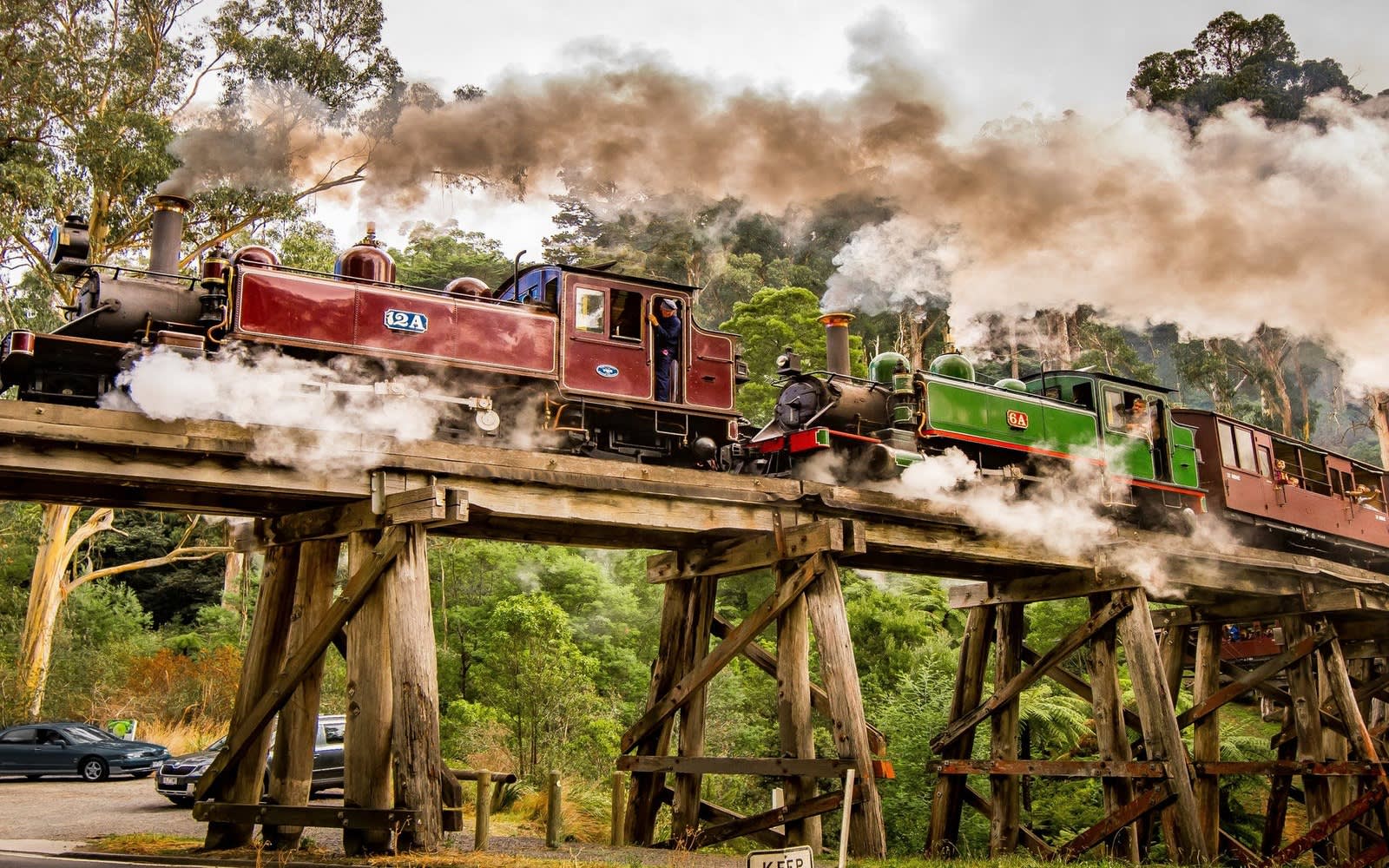 100년 역사의 퍼핑 빌리 증기 기관차를 타고 덩데농 산맥의 울창한 자연 속으로 떠나보세요. 탁 트인 객차에서 양치류 계곡과 유칼립투스 숲의 아름다운 경치를 감상할 수 있습니다.