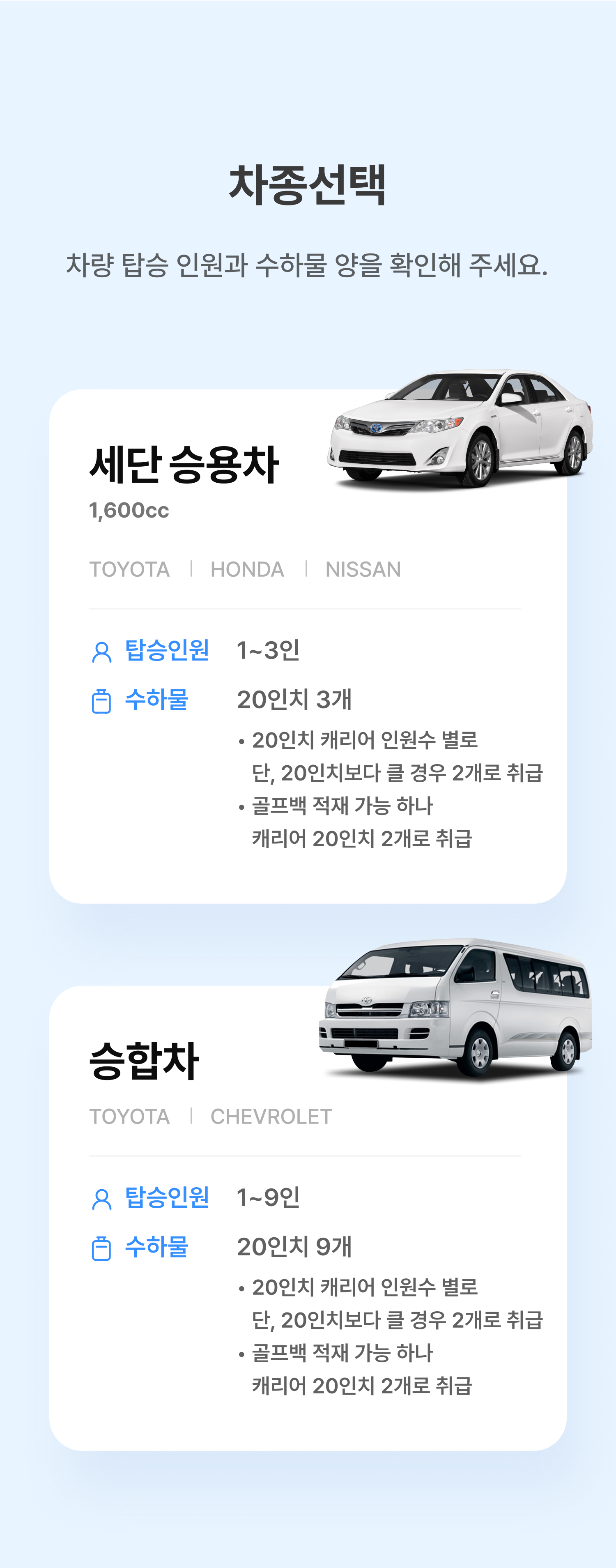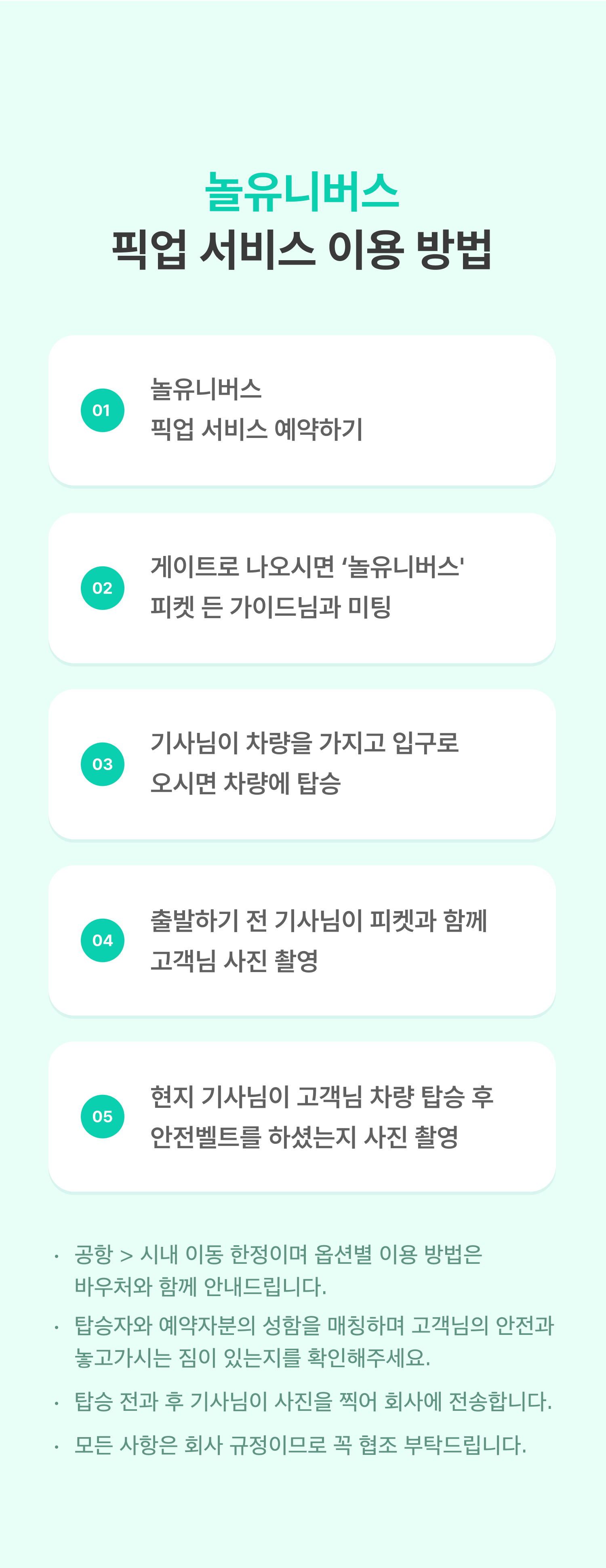 장시간 비행으로 지친 당신께 현지 도로 사정에 능통한 베테랑 기사님이 원하는 목적지까지 안전하게 모셔다드립니다.