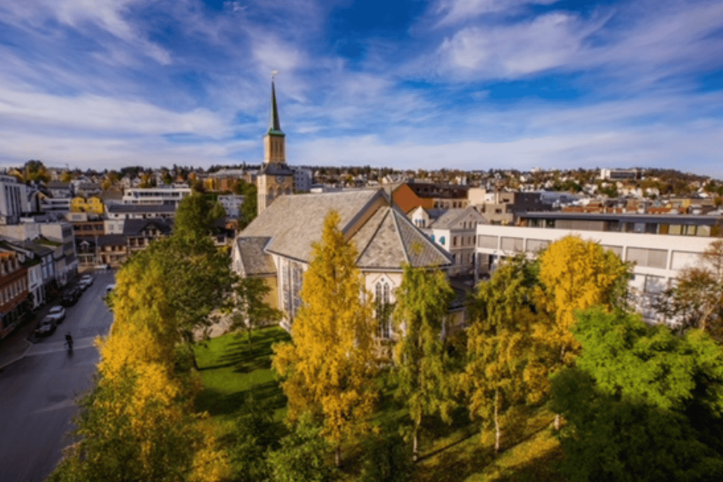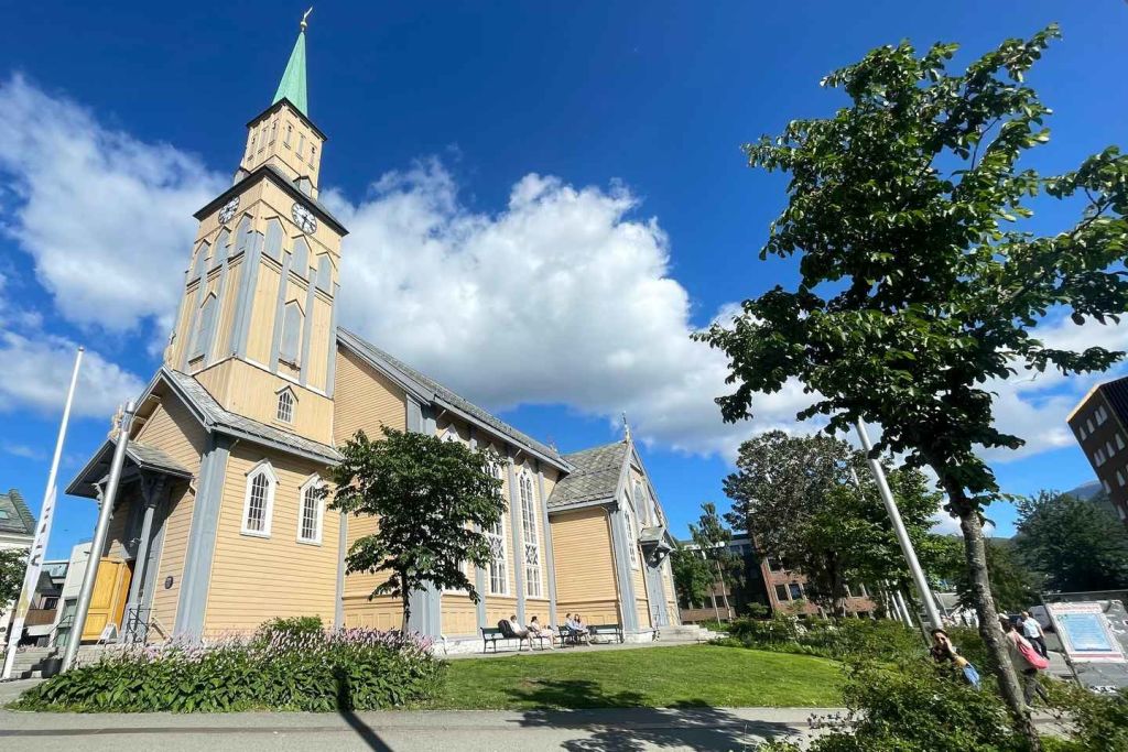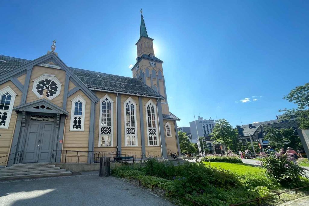 중요: 위치: 트롬쇠 시내 중심가에 있는 노란색 교회(다리 너머 하얀 북극 대성당이 아님)