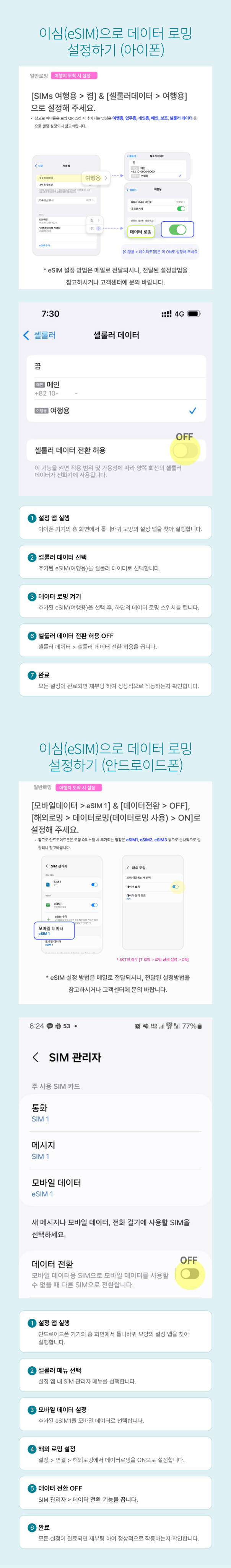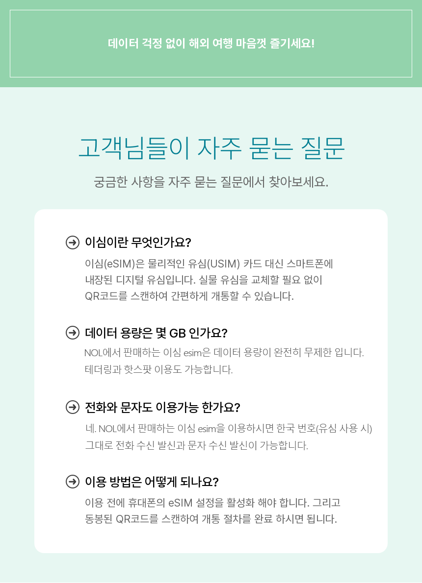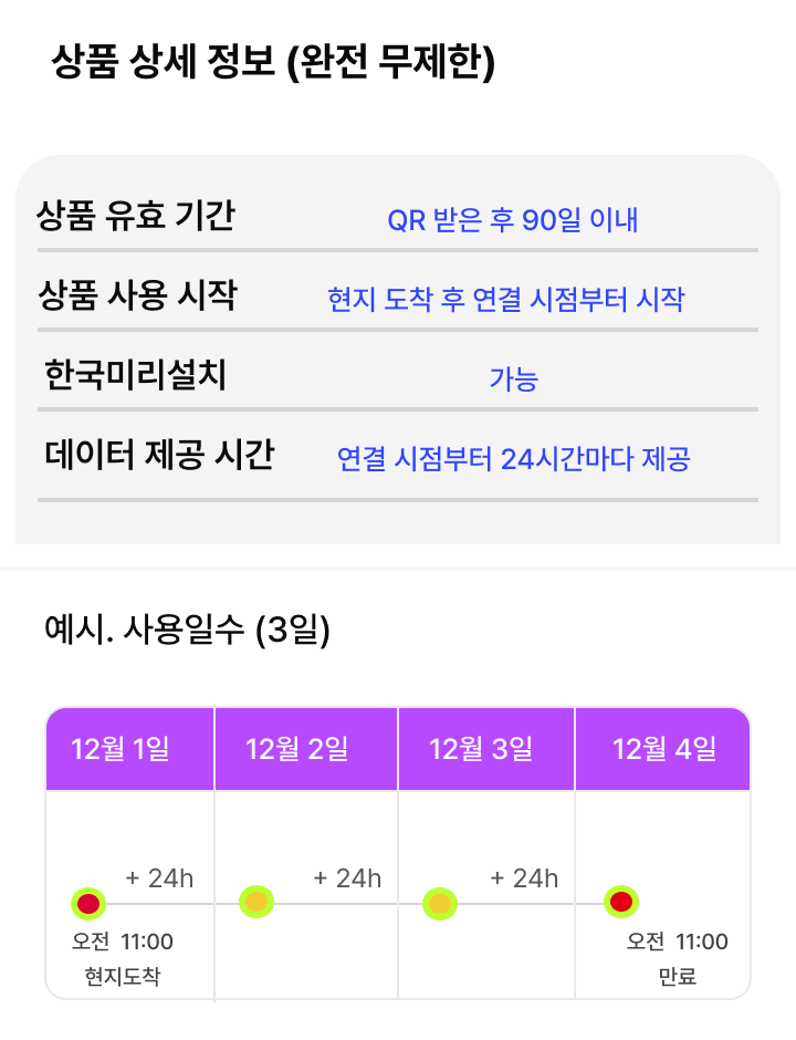 · 이 상품은 바우처(QR 코드)가 발송되기까지 최대 10~15분 정도 소요될 수 있습니다. · 구매 즉시 QR코드를 발급해 드리기 때문에, 상품 구매 후 '환불 불가' 입니다. · 데이터 전용 상품으로, 기존 번호로 전화나 문자 수신은 가능하지만 통신 요금이 부과될 수 있습니다. · 한국에서 미리 설치해 주세요. eSIM 사용 가이드에 따라 출국 전 한국에서 eSIM을 미리 받아주세요. · 3개월 이내 사용해 주세요. eSIM을 제공받는 날로부터 3개월 이내 자유롭게 사용 가능합니다.