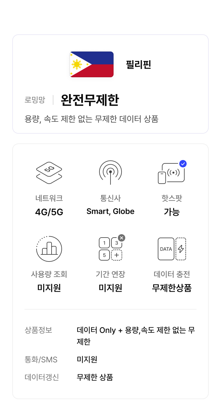 여행 중에도 끊김 없는 통신 환경으로 길 찾기, SNS 업로드, 동영상 스트리밍 등 다양한 활동을 마음껏 즐길 수 있습니다. eSIM으로 간편하게 연결하고, 데이터 감속 걱정 없이 필리핀 여행을 더욱 완벽하게 만들어보세요.