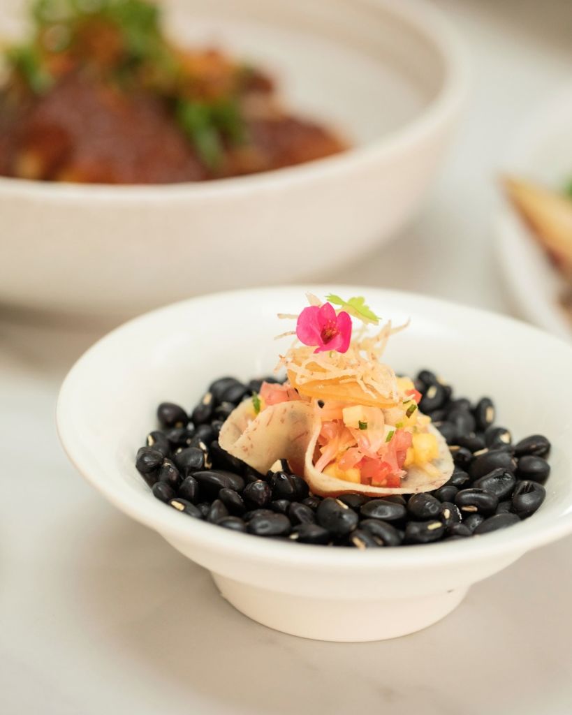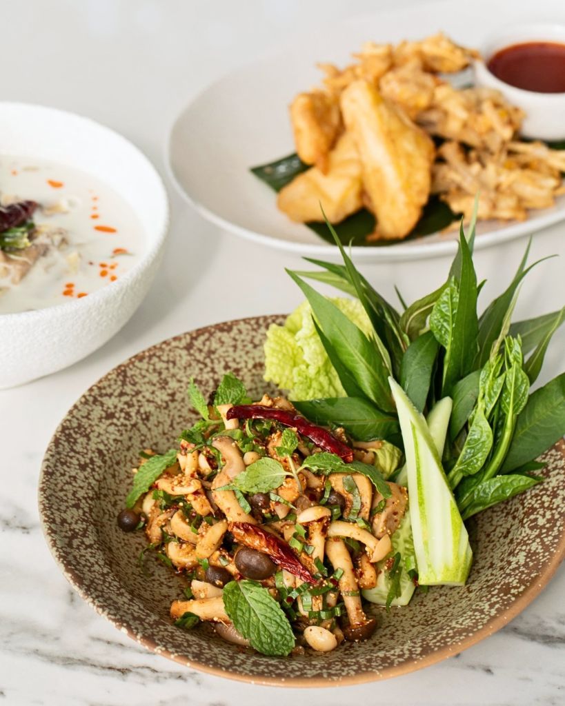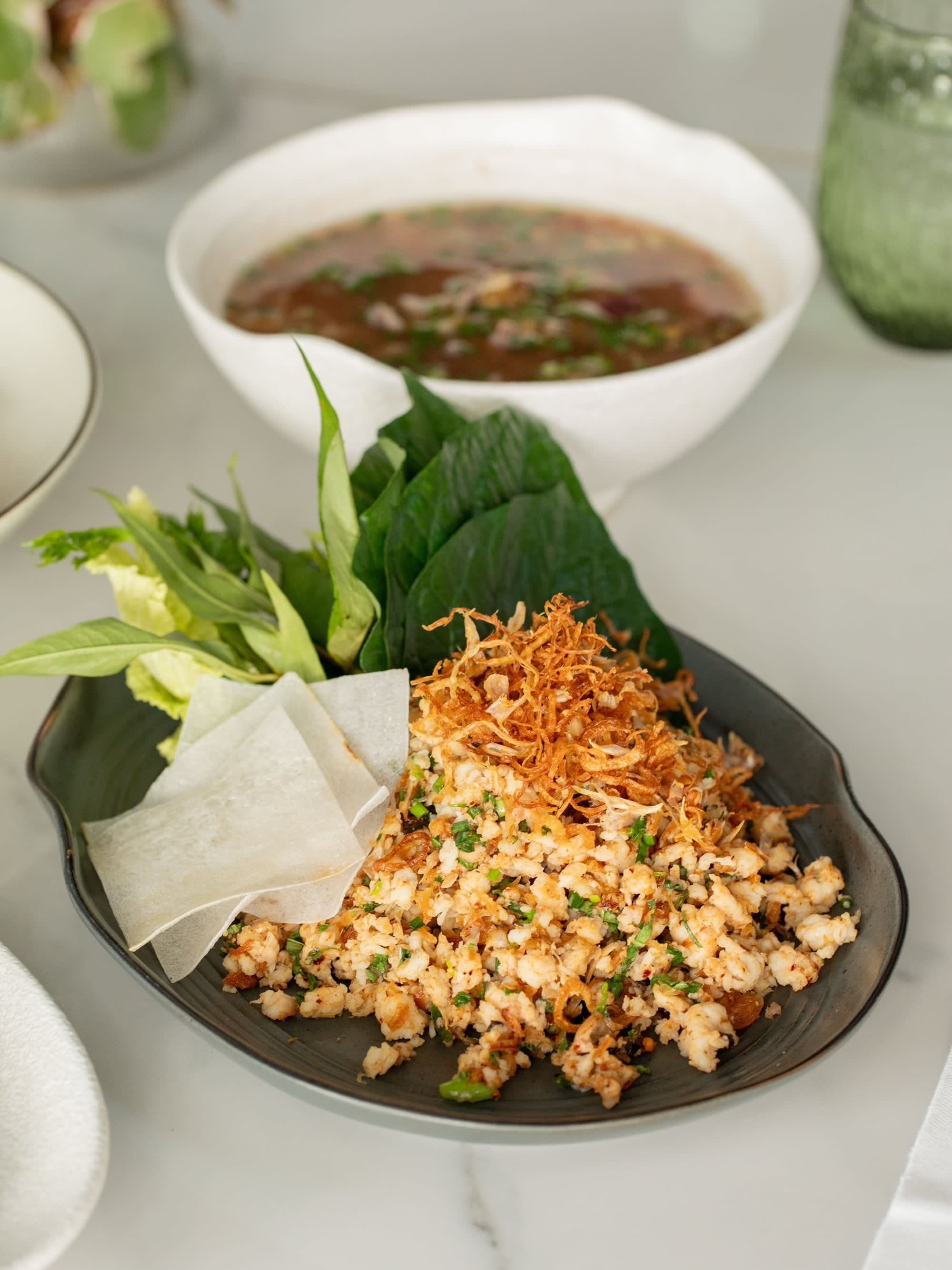 YUM HUA PLEE GAI CHEEK 잘게 썬 치킨, 바삭한 샬롯, 바삭한 마늘, 칠리 코코넛 드레싱을 곁들인 바나나 블러썸 샐러드