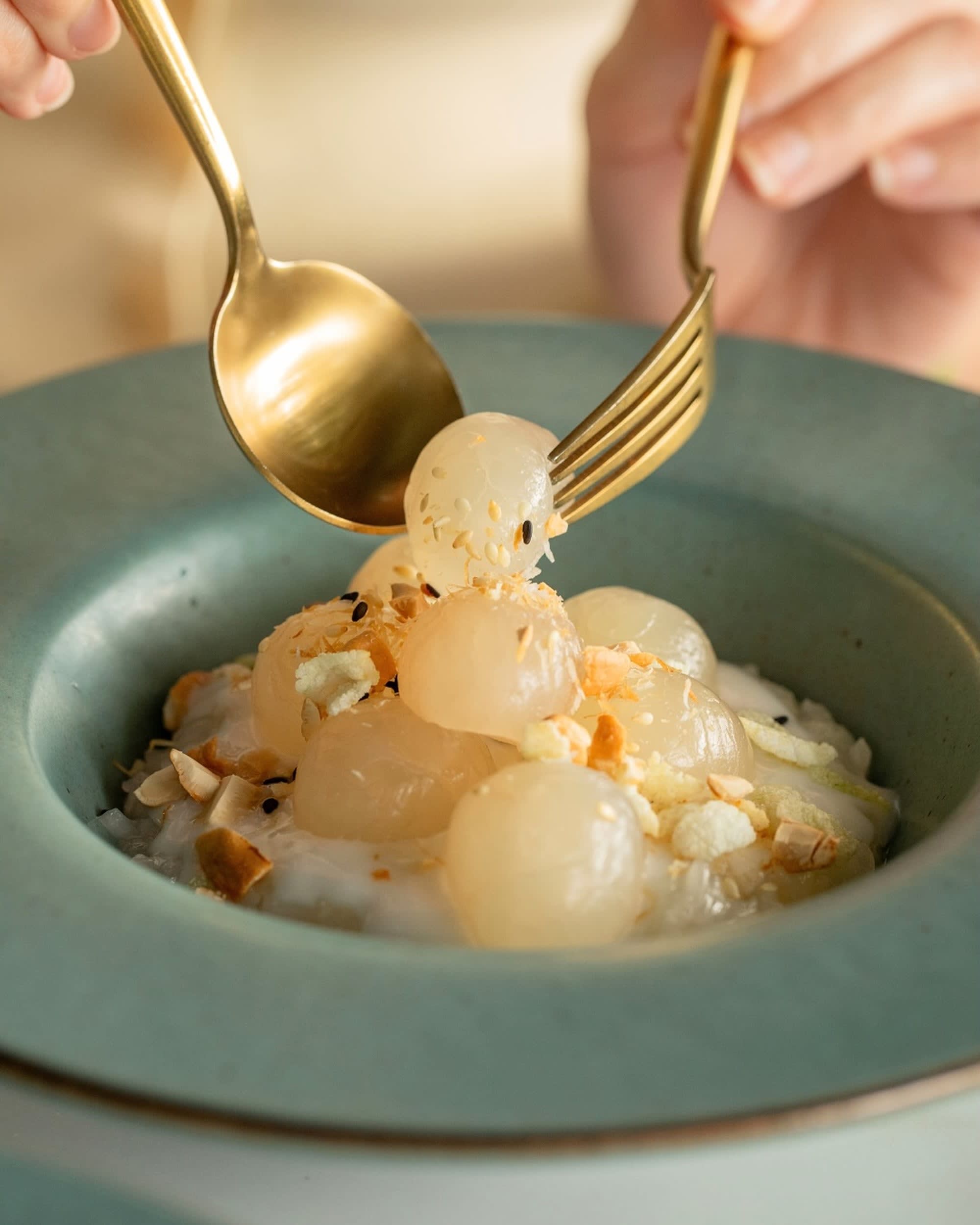 KANOM KO NAM GATI 달콤한 코코넛 우유와 참깨에 채운 찹쌀떡 디저트