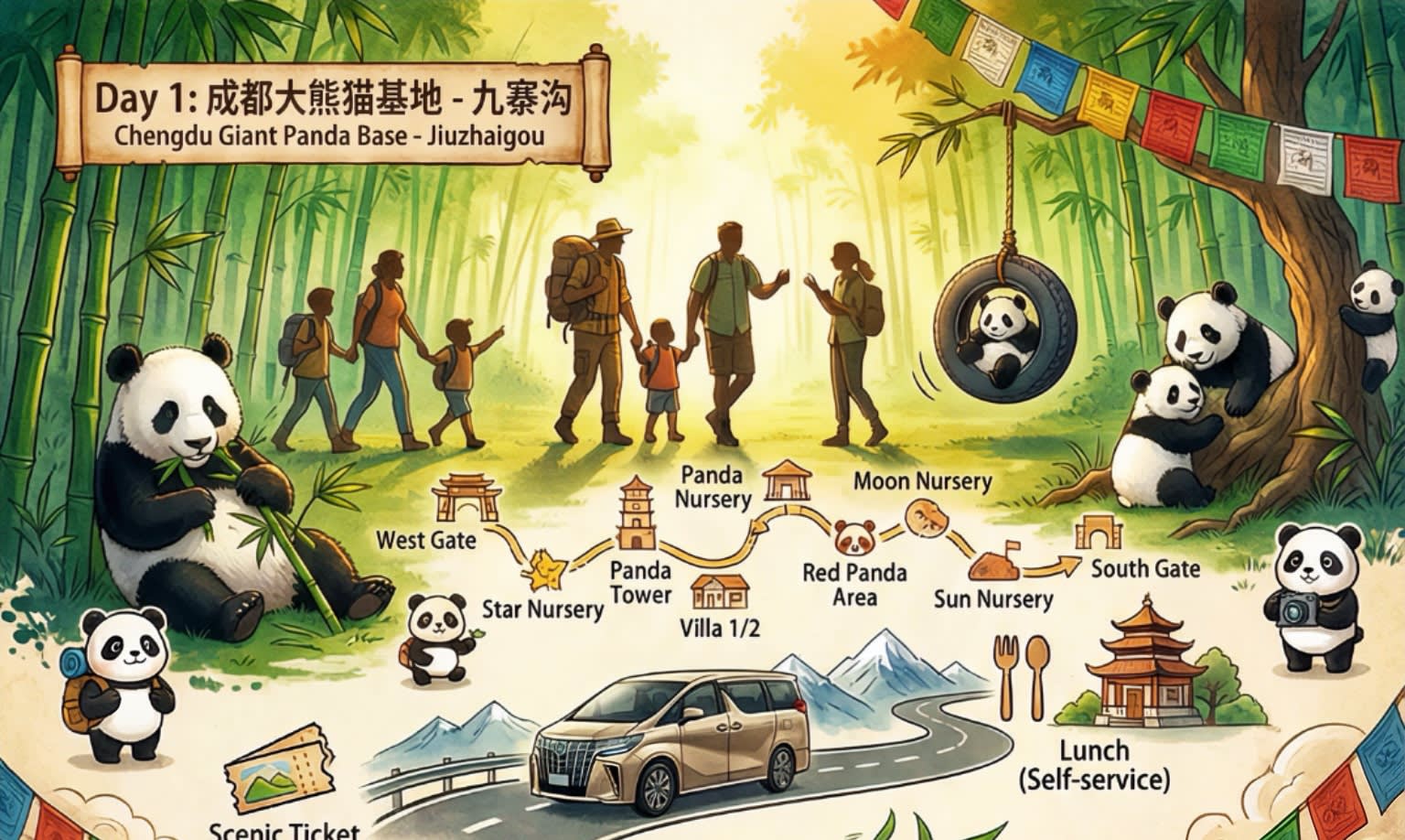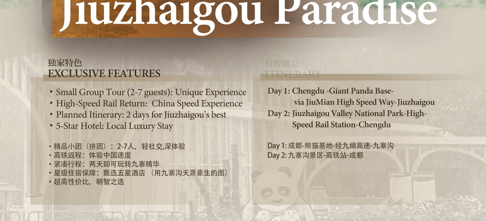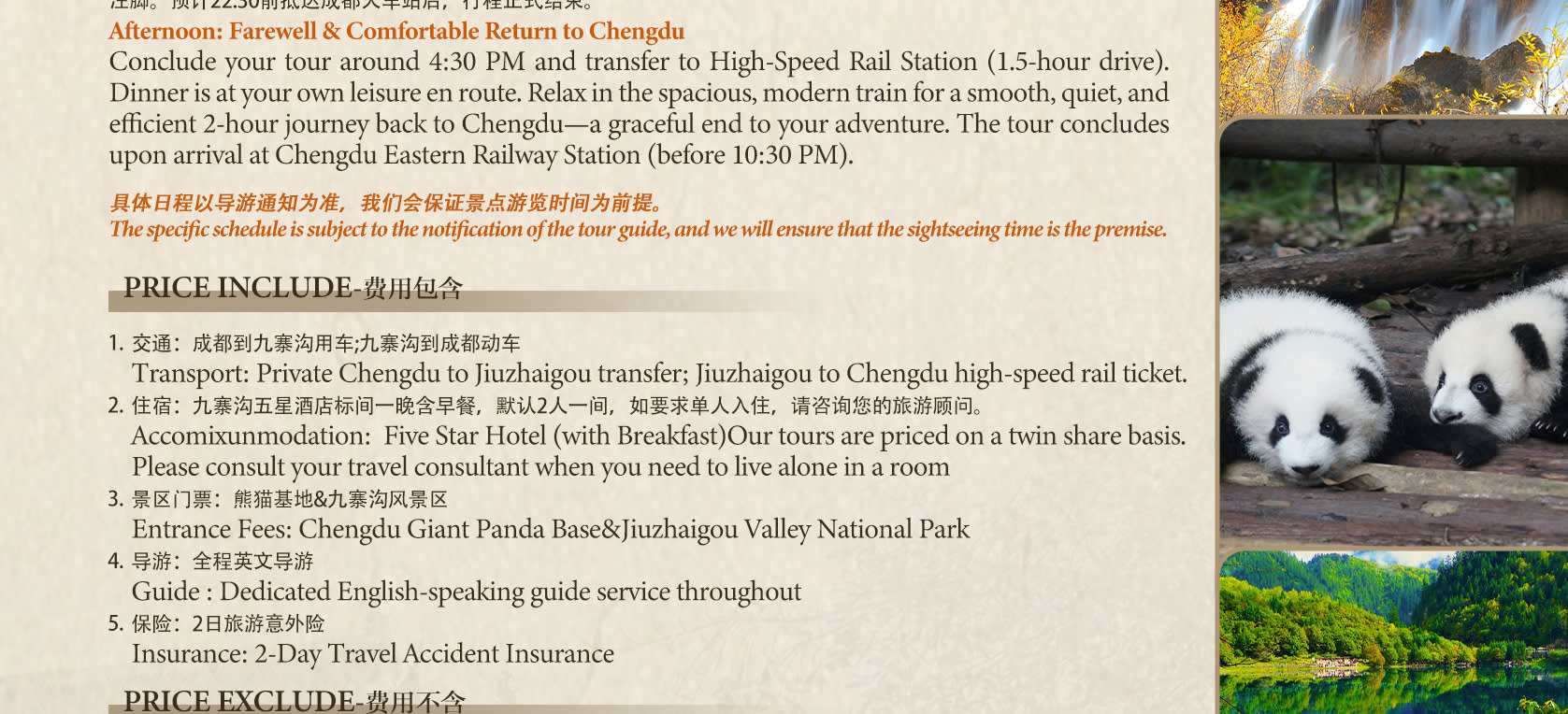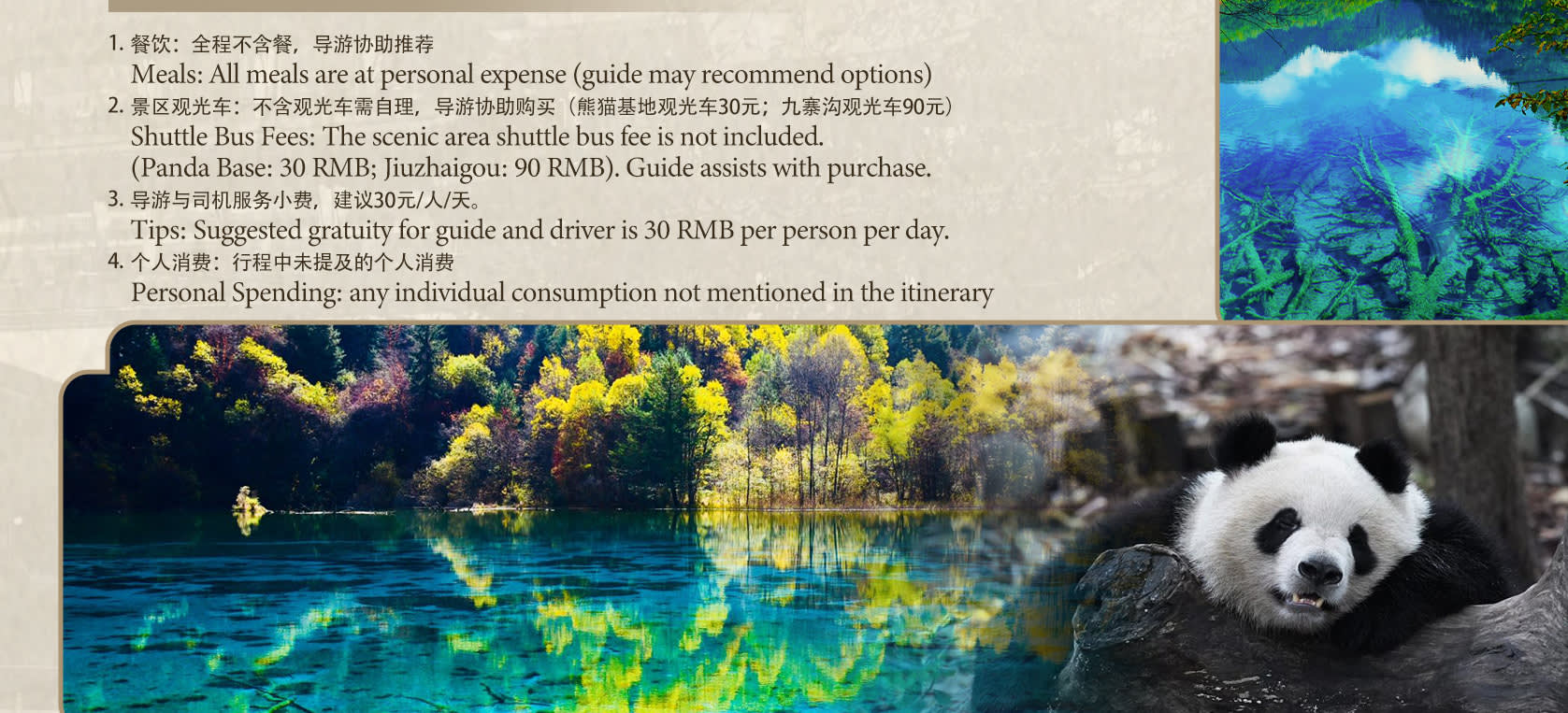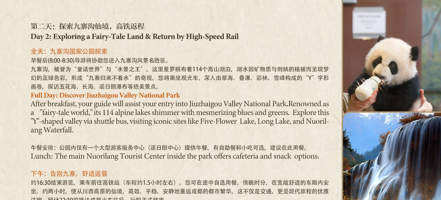 * 🐼💧 두 곳의 명소 방문: 판다 기지(판다의 일상 관람, 어린 판다 구역 탐험) + 구채구(114개의 푸른 호수, "Y"자 모양을 따라 핵심 관광지 구경).