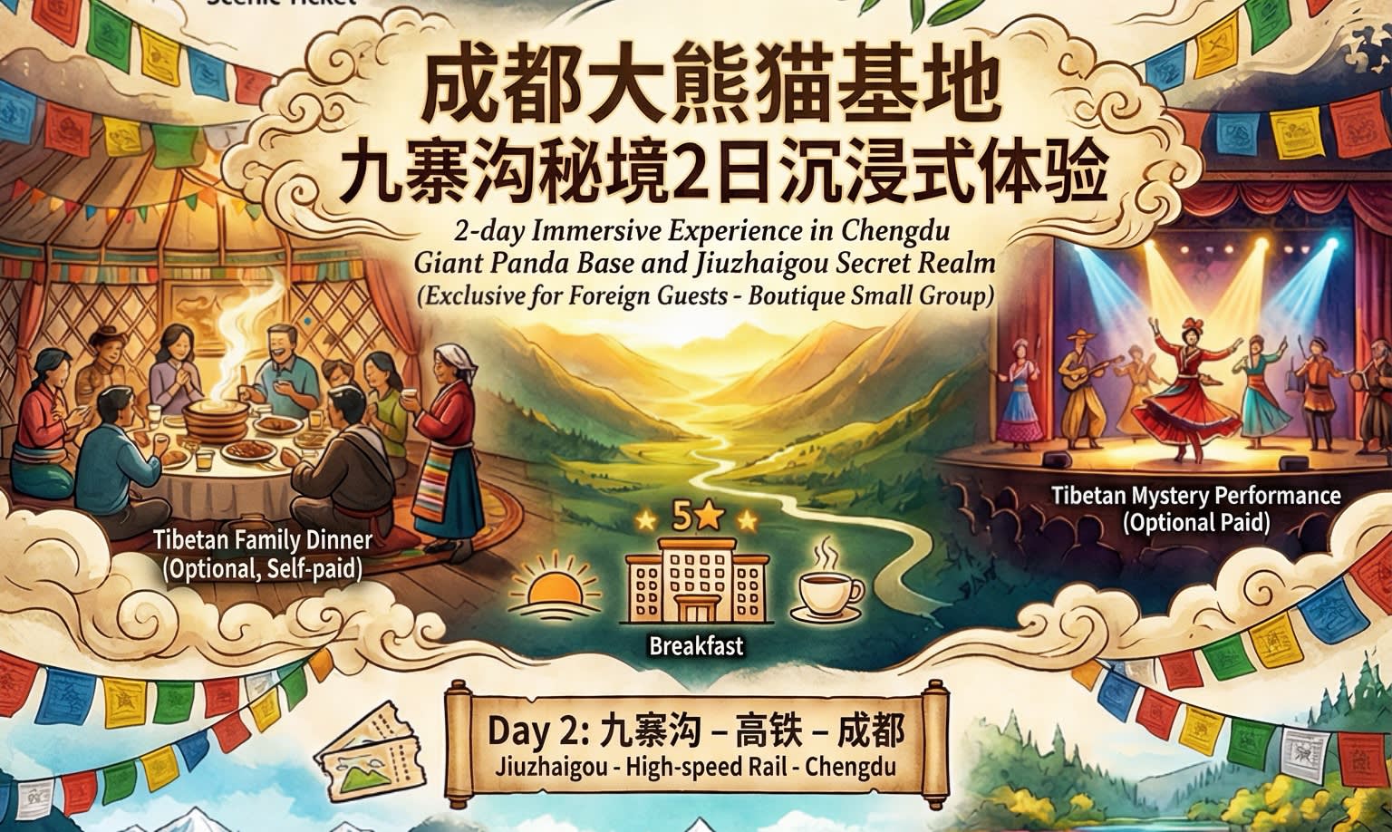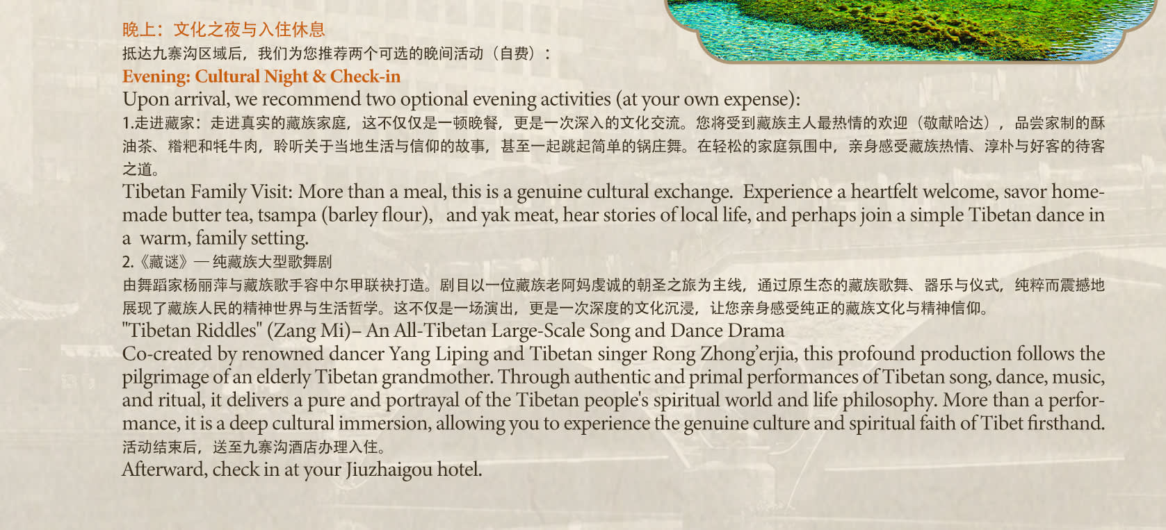 * 🎶🍵 선택 가능한 문화 체험: 선택 사항으로 티베트 전통 만찬(하다 증정, 특색 있는 음식 맛보기, 궈좡춤 감상) 또는 <장미> 가무극(양리핑+룽중얼자 제작).