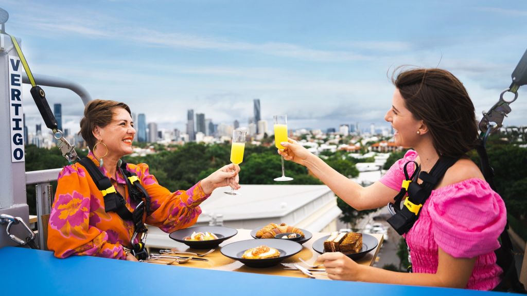베르티고 브리즈번 레스토랑에서 공중에 매달려 도시의 스카이라인을 내려다보면서 특별한 다이닝을 즐겨보세요.