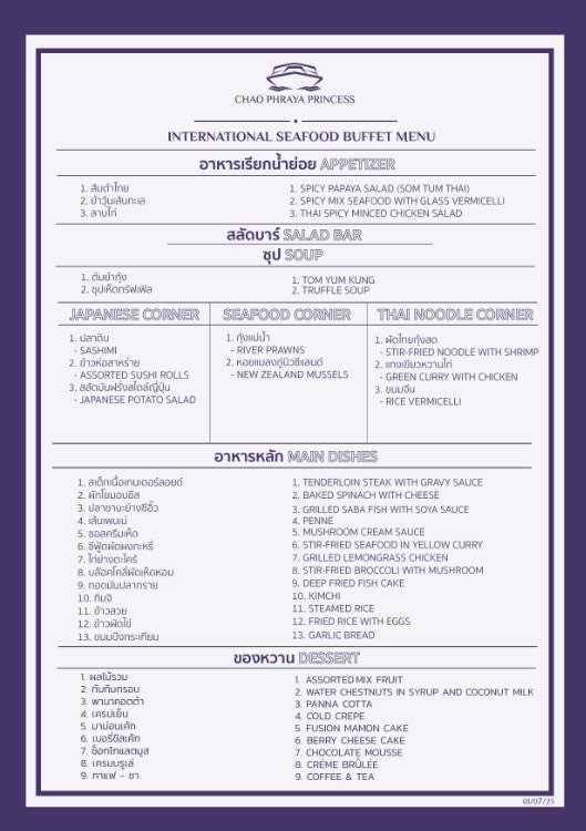잔잔한 차오프라야강을 항해하며 방콕 최고의 명소와 랜드마크를 구경하는 특별한 디너 크루즈로 초대합니다! 방콕의 반짝이는 야경을 색다른 시각으로 감상하고, 태국 요리와 세계 각국의 요리로 구성된 뷔페도 함께 즐겨보세요. 라이브 밴드가 추억의 명곡을 연주해드리니, 한층 더 흥겹고도 낭만적인 분위기를 만끽할 수 있습니다. 지금 예약하고, 소중한 사람들과 함께 잊지 못할 태국 여행의 추억을 완성하세요!