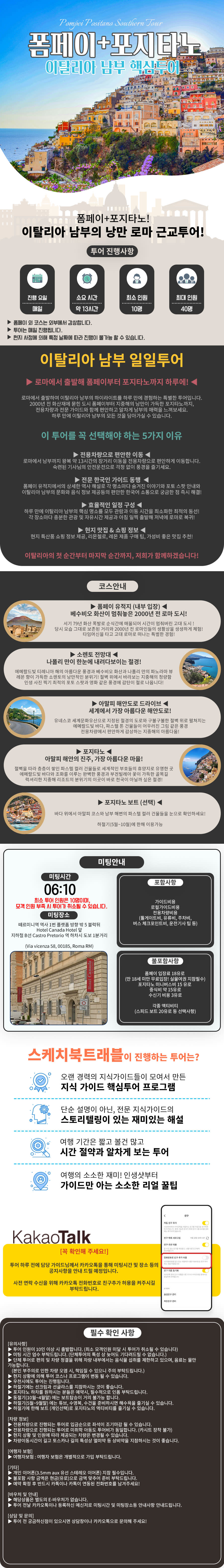 포함 및 불포함 사항 ✅포함 사항 * 가이드 비용: 전문 가이드 및 로컬 가이드 비용 * 전용 차량 비용: 톨게이트비,유류비,주차비, 버스 체크포인트비, 운전기사 팁등 차량관련 비용 일체 ❌불포함 사항 (개별 준비) * 폼페이 입장료: 18유로 * 만 18세 미만 학생: 여권 원본 제시 시 무료 입장 (국제 학생증 할인 불가) * 수신기 비용: 3유로 * 포지타노 미니버스비: 15유로 (대형 버스 진행 시) * 중식비: 약 15유로 * 각종 액티비티: 스피드 보트(20유로) 등 선택 사항 ⏰미팅 정보 * 미팅 시간: 06:10 AM * 미팅 장소: Hotel Canada 앞 (Via vicenza 58, 00185, Roma RM) 🔔필수 확인 사항 * 최소 출발 인원: 10명 이상 시 출발하며, 미달 시 투어가 취소될 수 있습니다. * 미팅 시간 엄수: 단체 투어 특성상 미팅 시간에 늦을 경우 기다려드리기 어렵습니다. * 차량 내 규정: 다른 손님을 위해 차량 내부에서는 물 외 음료 및 음식물 섭취가 제한됩니다. * 현지 상황: 현지 상황에 따라 투어 코스가 변동될 수 있으며, 우천 시에도 투어는 정상 진행됩니다. * 하절기 유의사항: 선크림, 선글라스, 그리고 해수욕을 위한 수영복과 수건을 준비해 주세요. * 하절기(5월~9월)에 한해 포지타노 보트 액티비티를 즐길 수 있습니다. * 차량 이동: 캐리어 등 개인 소지품은 도난 위험으로 인해 차량에 두고 내릴 수 없습니다. * 장거리 이동으로 멀미약 등 상비약 지참을 권장합니다. * 여행자 보험: 여행자 보험은 개별적으로 가입해 주셔야 합니다. * 기타: 개인 이어폰(3.5mm Aux) 지참 필수이며, 불포함 금액은 유로 현금으로 준비해 주세요. * 바우처: 별도의 E-바우처는 없으며, 투어 전날 카카오톡으로 안내드립니다. * 궁금한 점은 '스케치북 트래블' 카카오톡 채널로 문의해 주세요! ℹ️취소/환불 규정 (여행일은 현지 시각 기준) * 여행시작 30일 전까지 (~30) 통보시 : 여행 요금 전액 환불 * 여행시작 20일 전까지 (29~20) 통보시 : 상품 요금의 20% 공제 * 여행시작 7일 전까지 (19~7) 통보시 :상품 요금의 30% 공제 * 여행시작 4일 전까지 (6~4) 통보시 :상품 요금의 50%공제 * 여행시작 당일까지 (3~당일) 통보시 : 취소/환불 불가