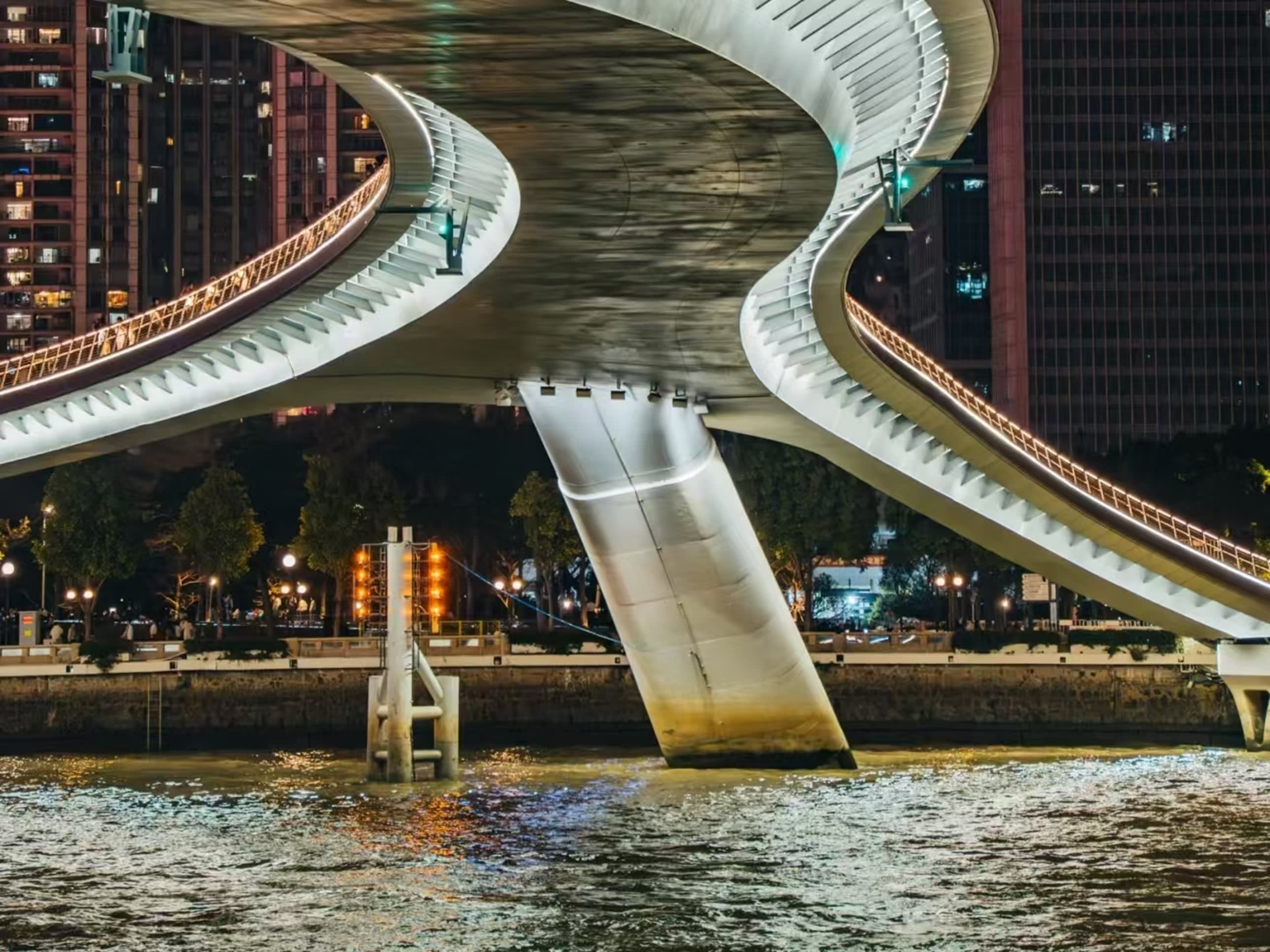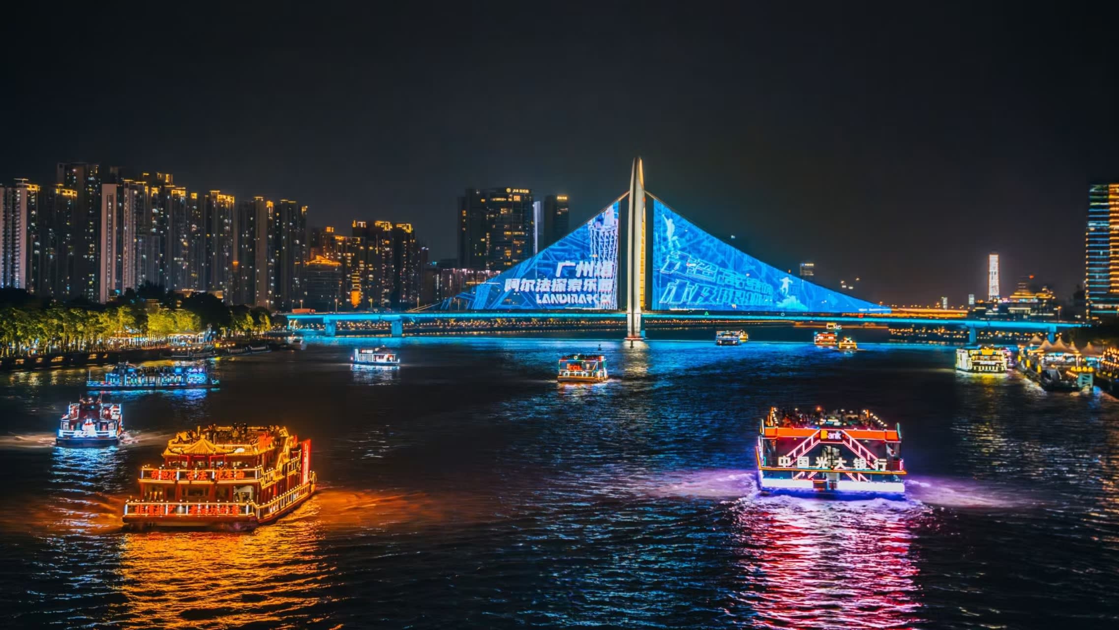* 테마 유람선 항로는 하이신샤 선착장, 장완교, 대원수부, 하이인교, 얼샤섬, 중산패방, 싱하이 콘서트홀, 광저우 대교, 하이신교, 광저우 타워, 하이신샤 등 핵심 경관 구간을 연결합니다.