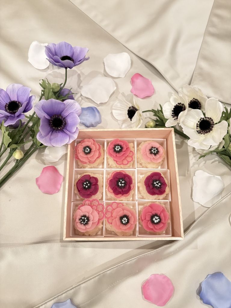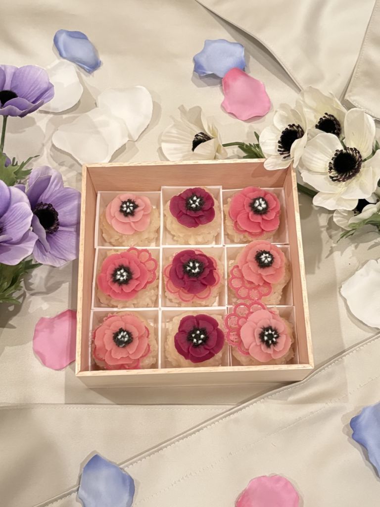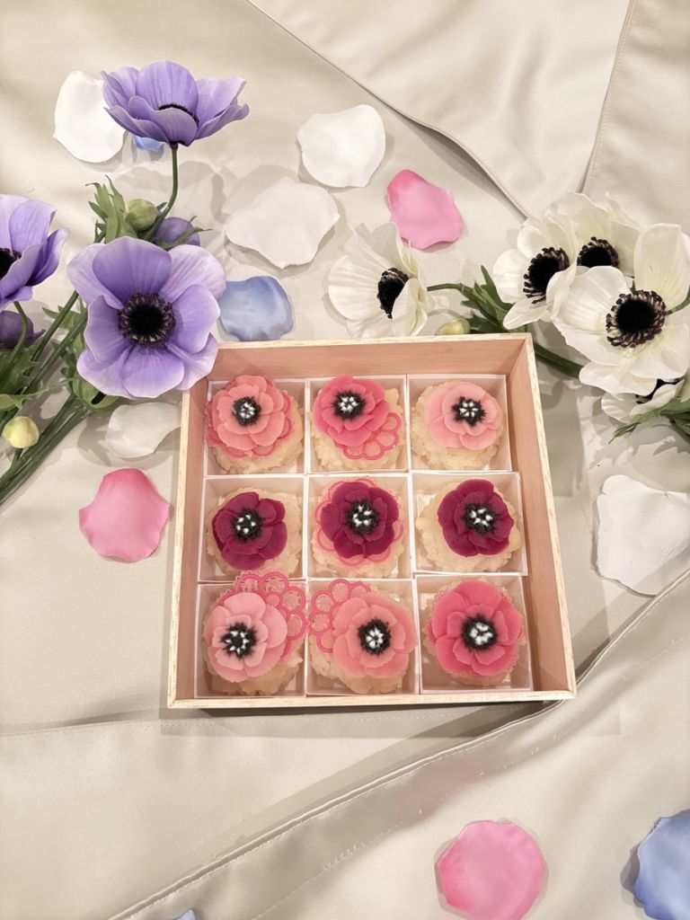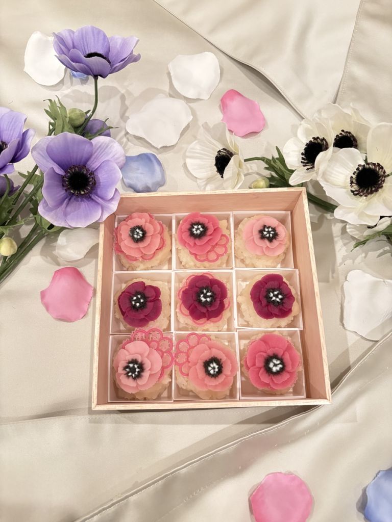 짜신 꽃은 한입 오하기 위에 장식하여 마무리하며, 네 가지 핑크색 아네모네를 완성합니다.